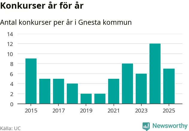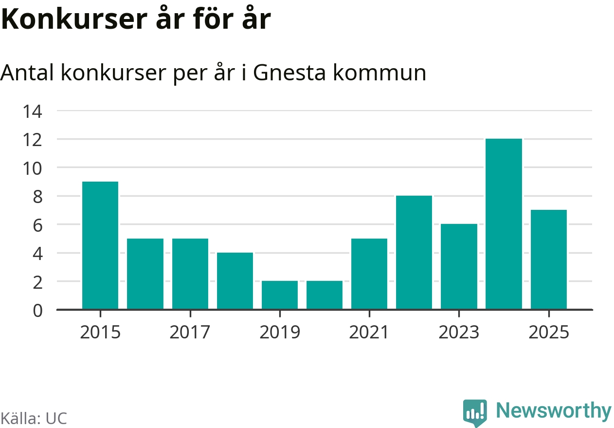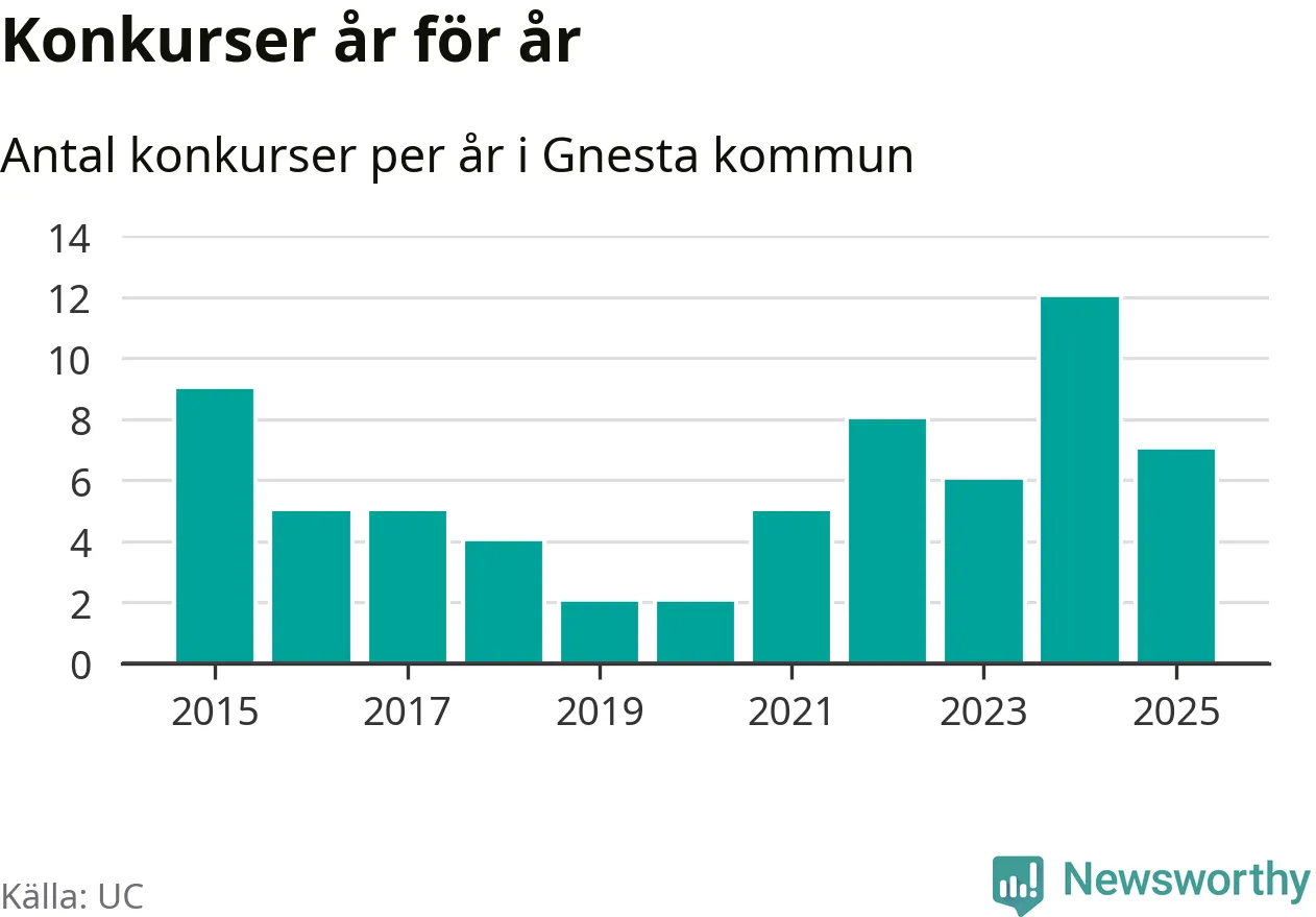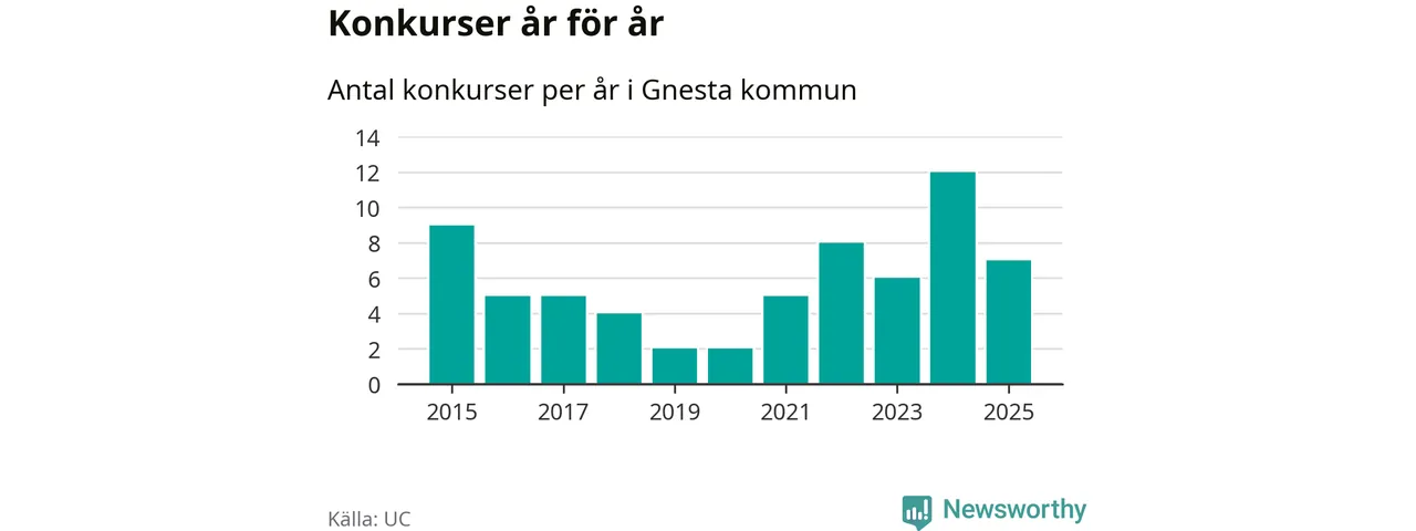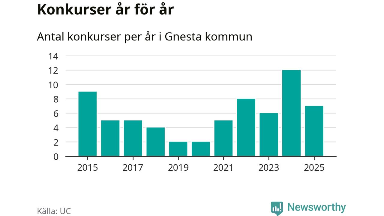 Under år 2025 gick sammanlagt sju bolag med säte i Gnesta kommun i konkurs. Det är fem färre än året innan då tolv bolag gick i konkurs. Toppåret, sedan 2015, var just 2024 sett till antalet konkursföretag. Det visar ny statistik från UC.