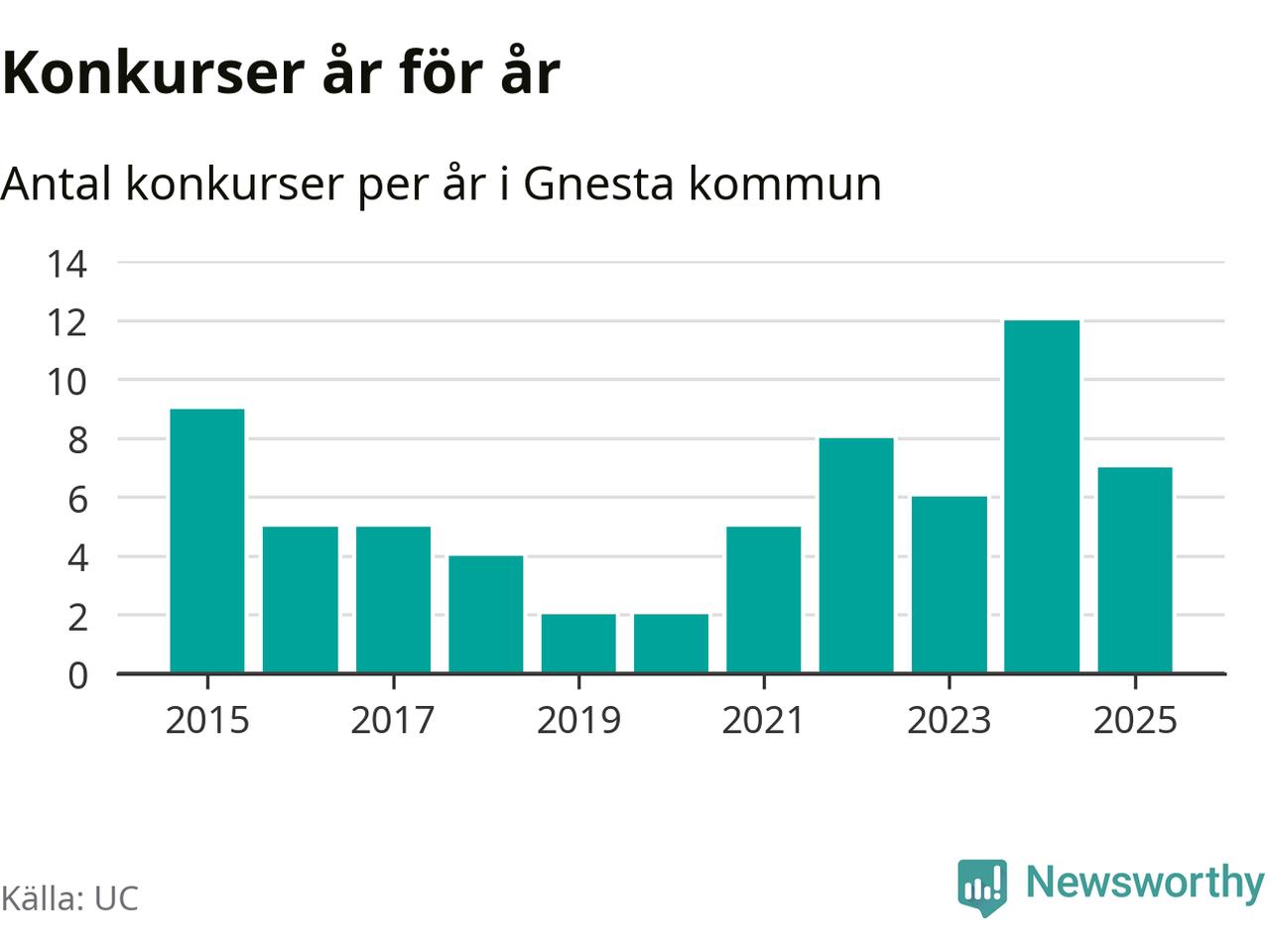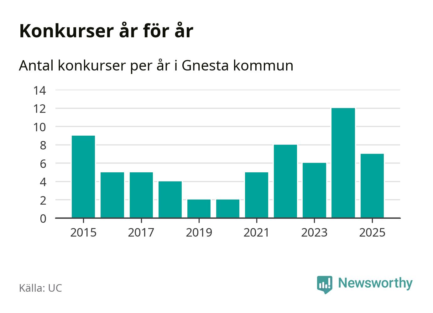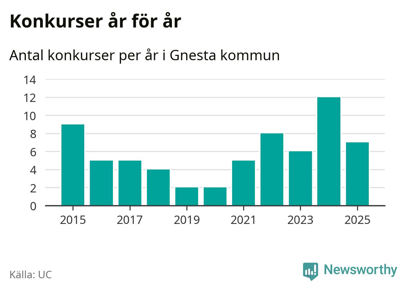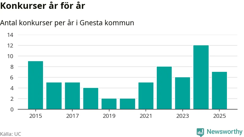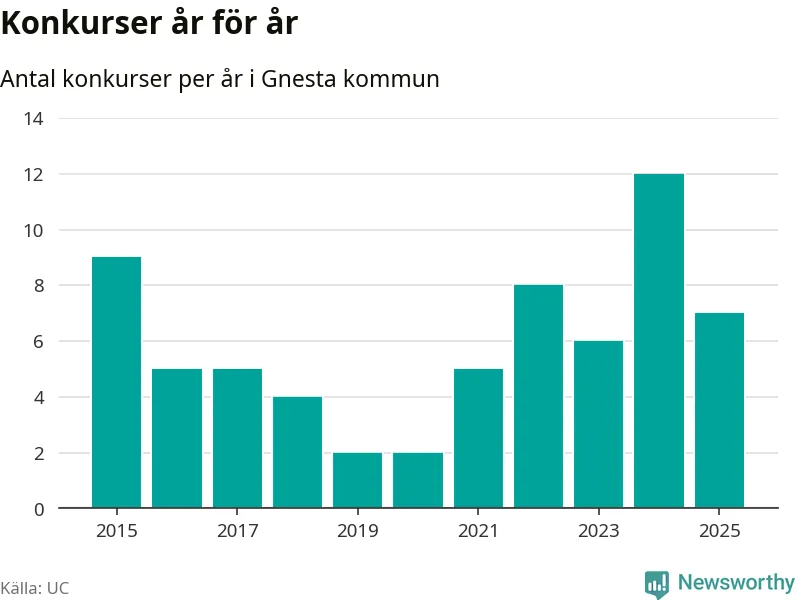 Under år 2025 gick sammanlagt sju bolag med säte i Gnesta kommun i konkurs. Det är fem färre än året innan då tolv bolag gick i konkurs. Toppåret, sedan 2015, var just 2024 sett till antalet konkursföretag. Det visar ny statistik från UC.
