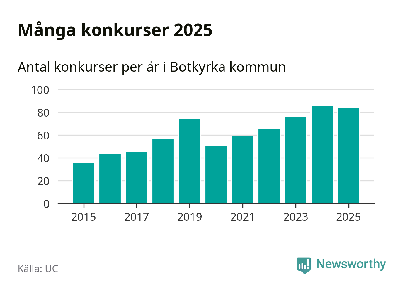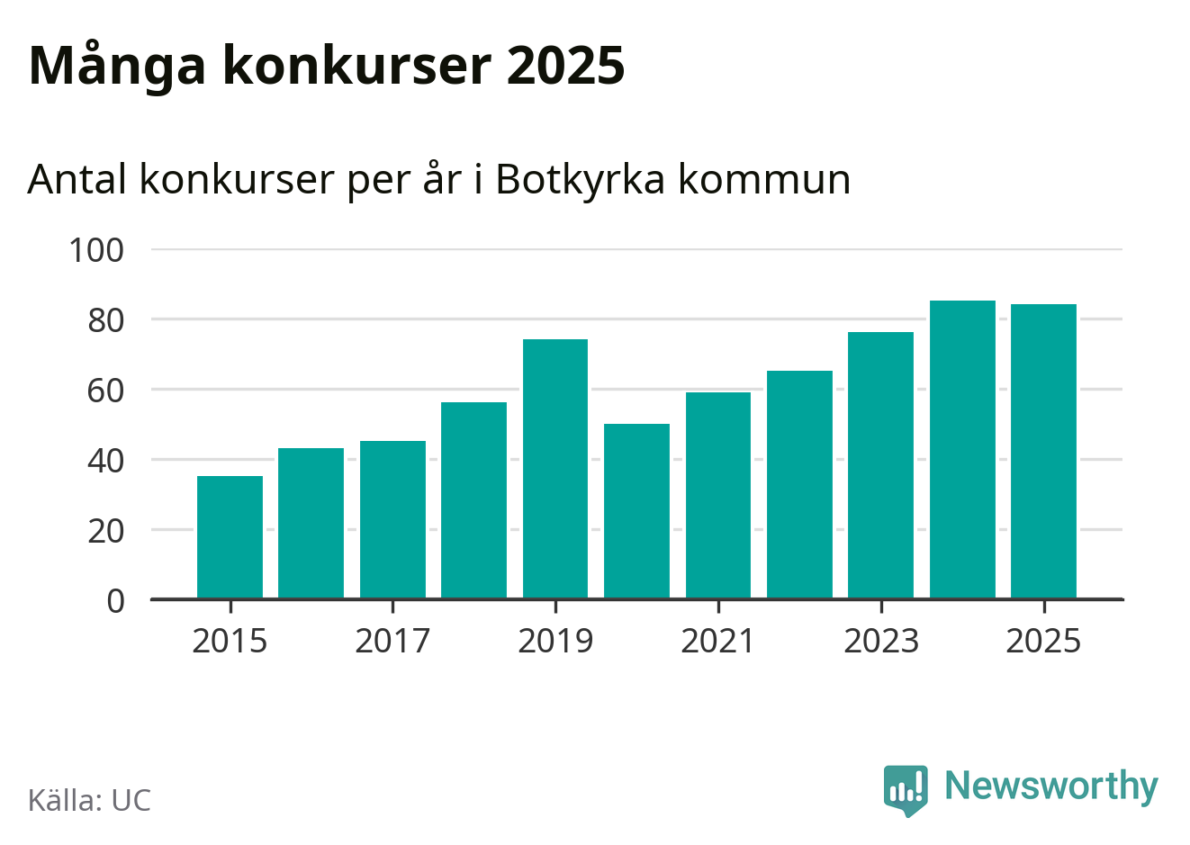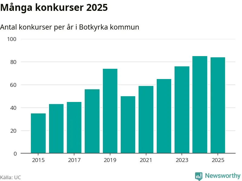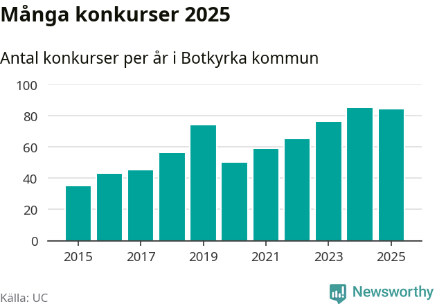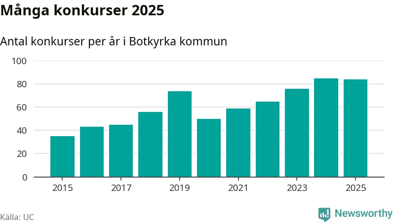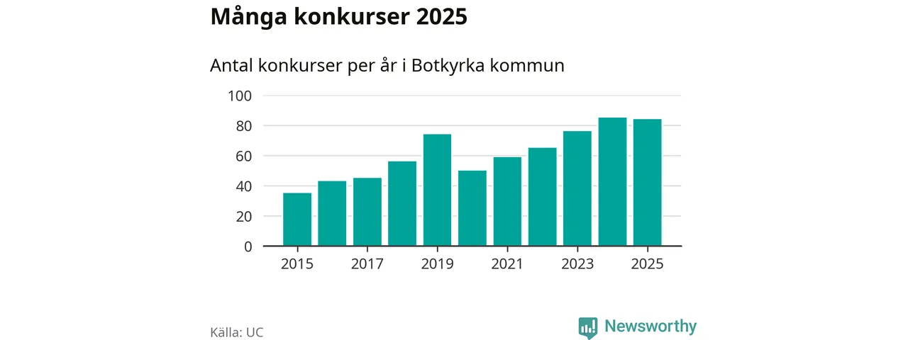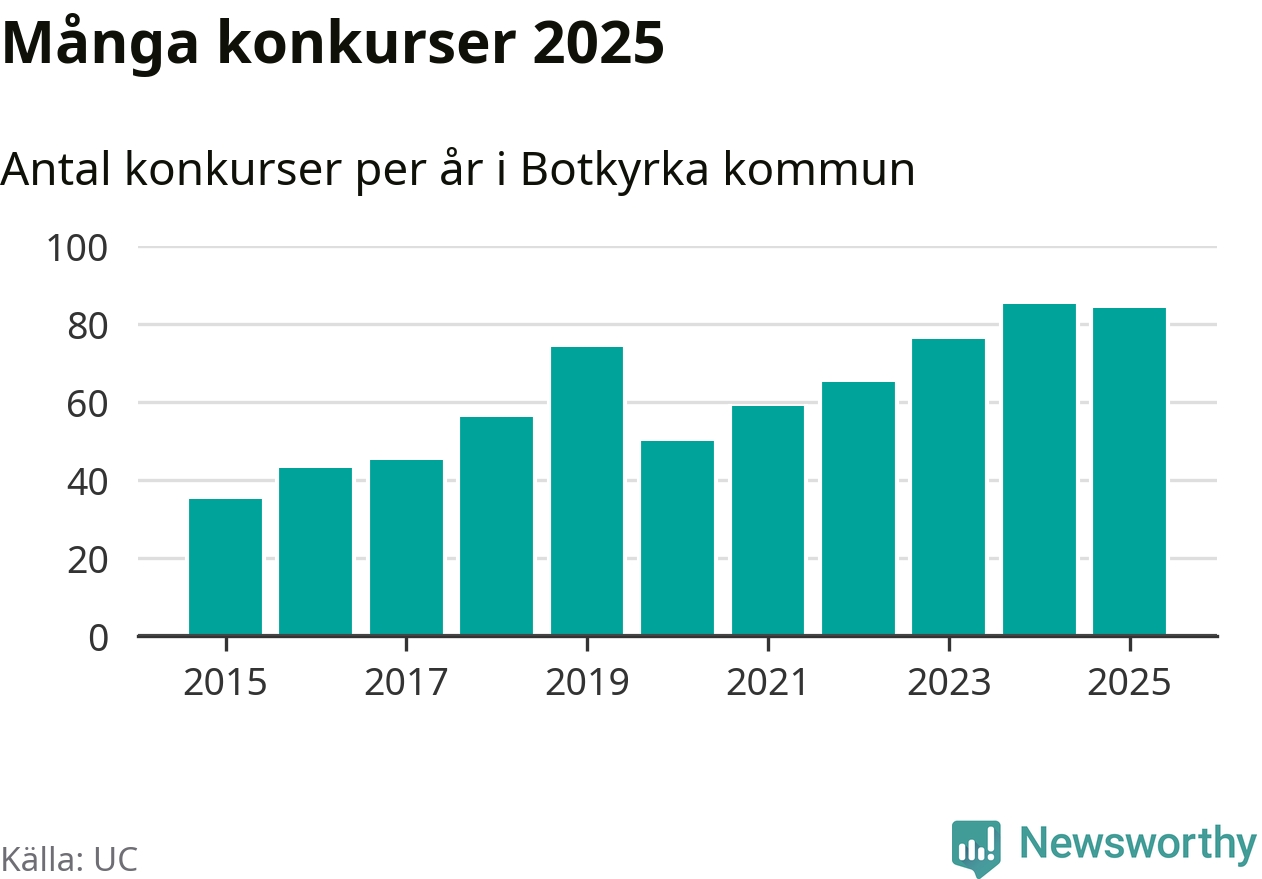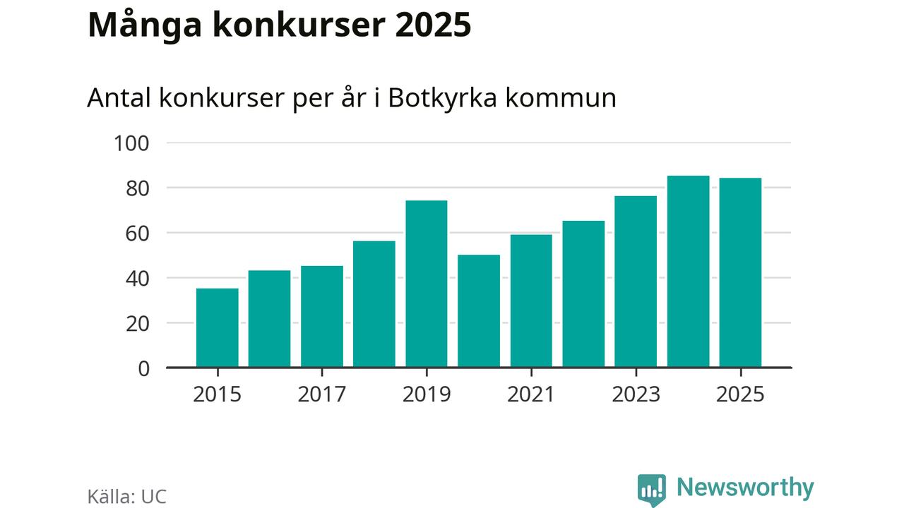 Under år 2025 gick sammanlagt 84 bolag med säte i Botkyrka kommun i konkurs. Det är ett färre än året innan. Toppåret, sedan 2015, var just 2024 sett till antalet konkursföretag. Det visar ny statistik från UC.