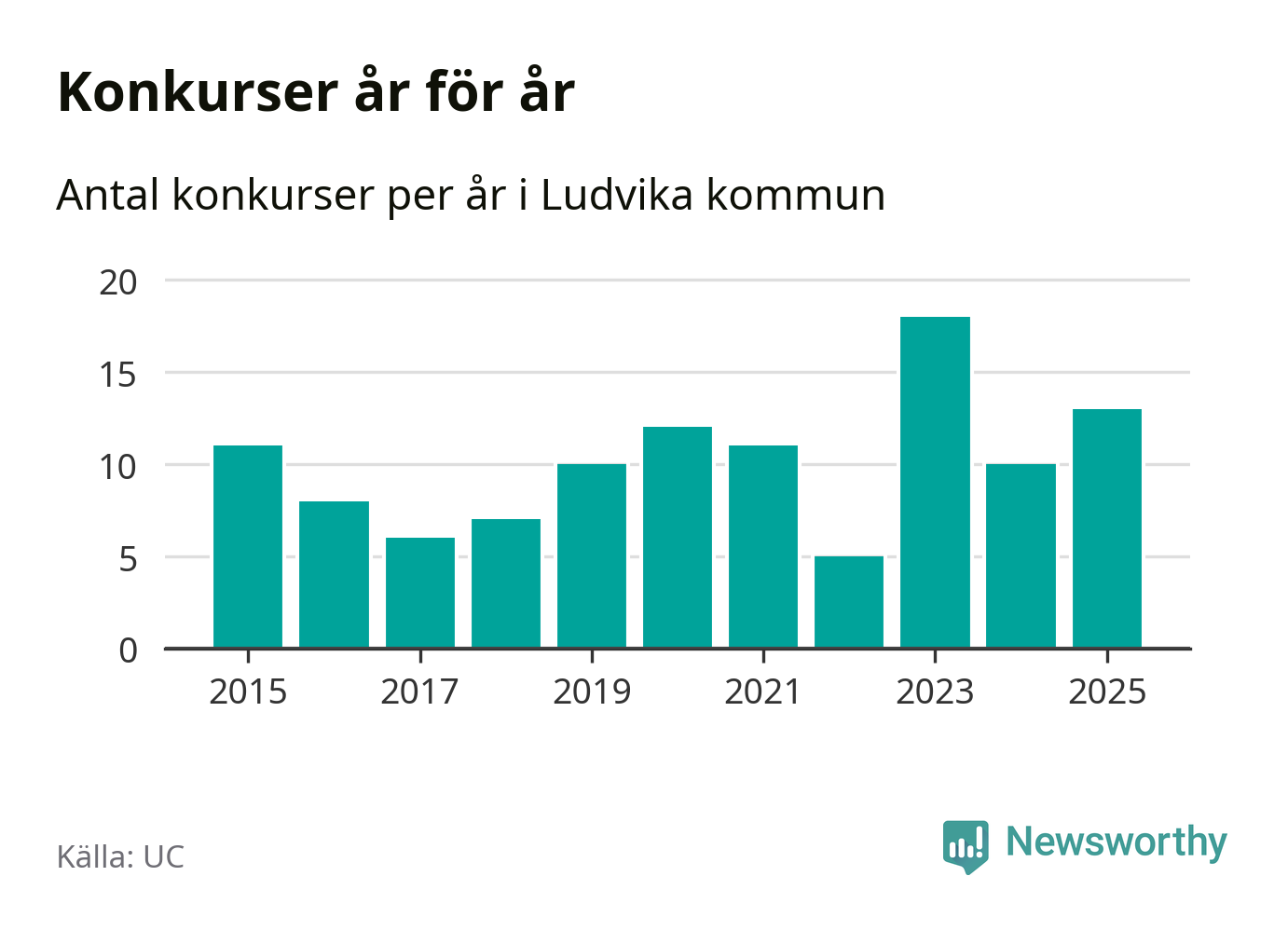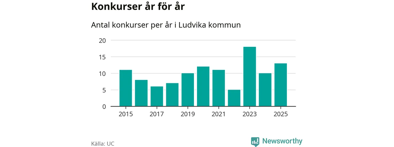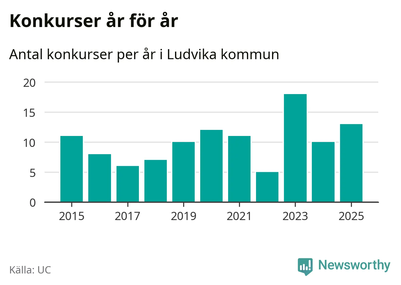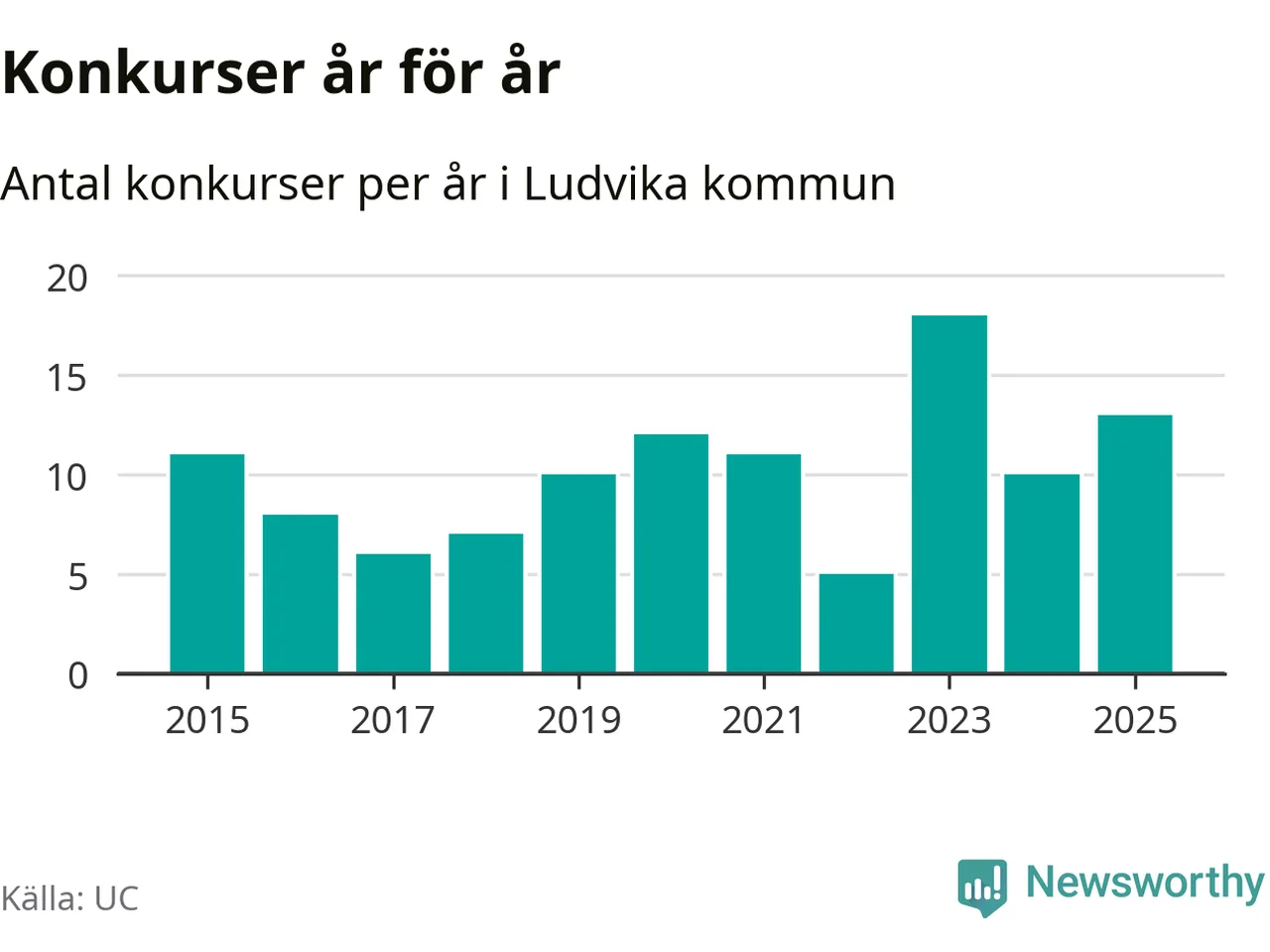 Under år 2025 gick sammanlagt 13 bolag med säte i Ludvika kommun i konkurs. Det är fler än året innan, men samtidigt färre än toppåret 2023 då 18 bolag gick i konkurs. Det visar ny statistik från UC.