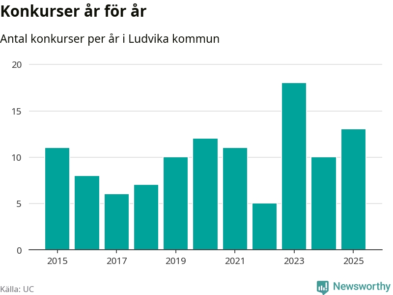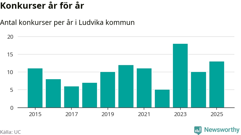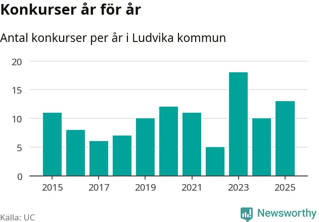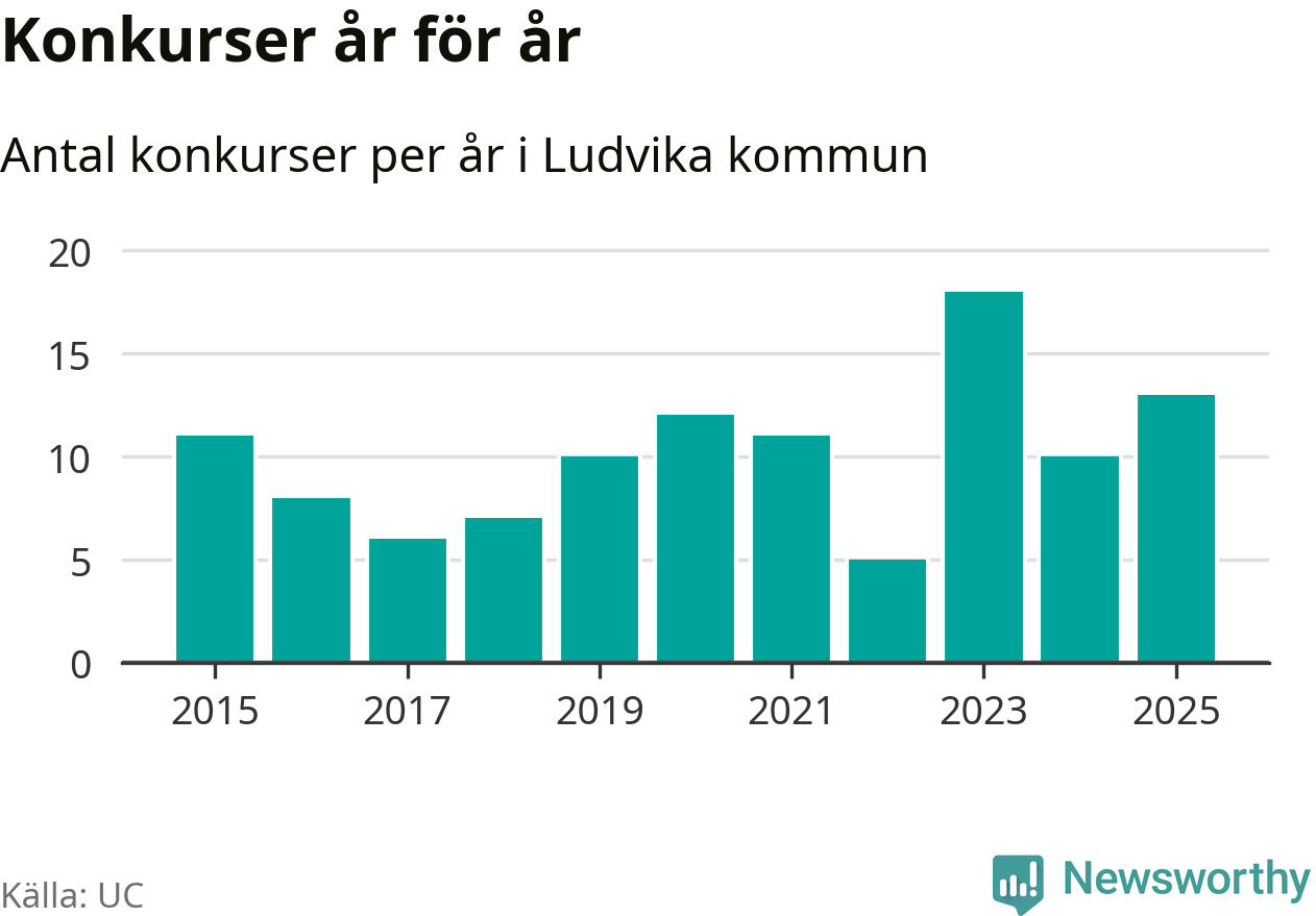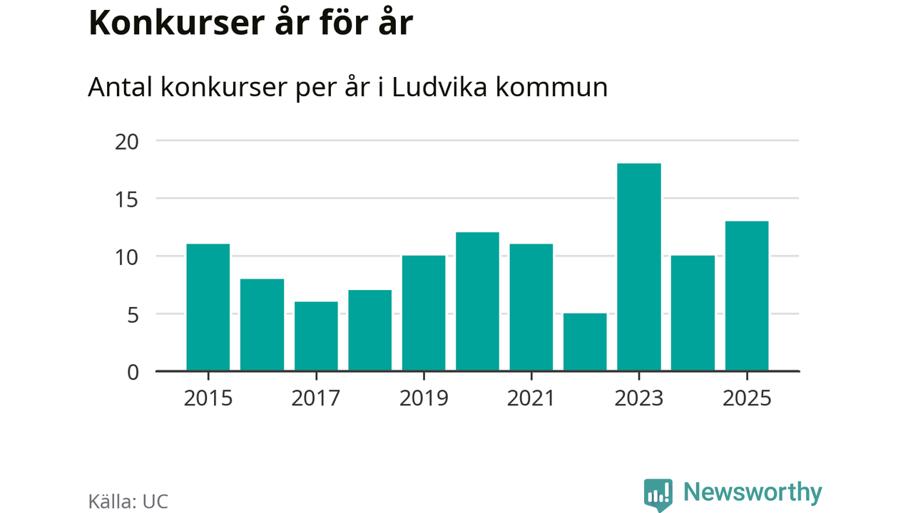 Under år 2025 gick sammanlagt 13 bolag med säte i Ludvika kommun i konkurs. Det är fler än året innan, men samtidigt färre än toppåret 2023 då 18 bolag gick i konkurs. Det visar ny statistik från UC.