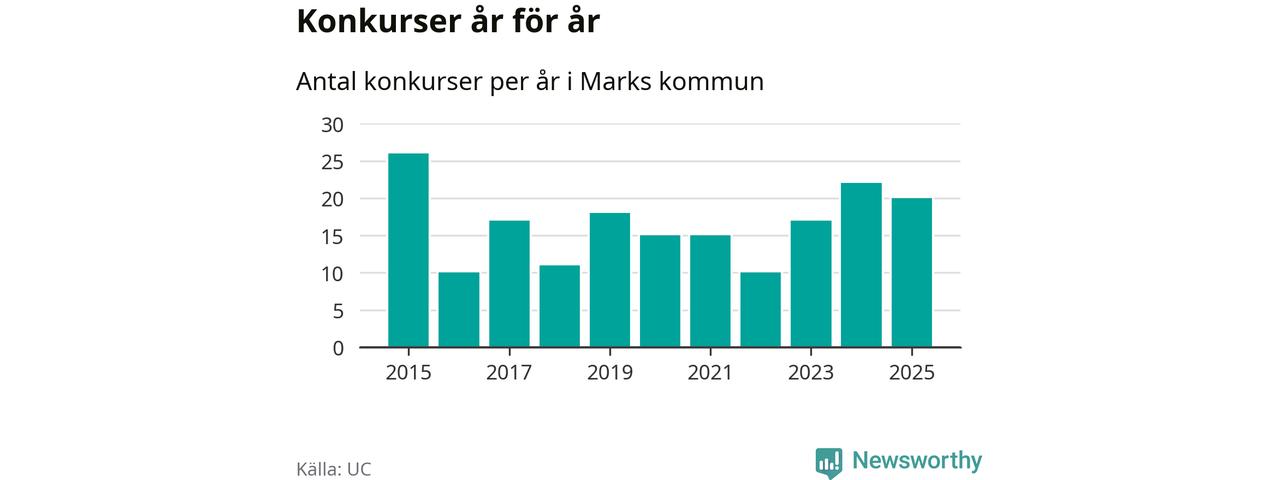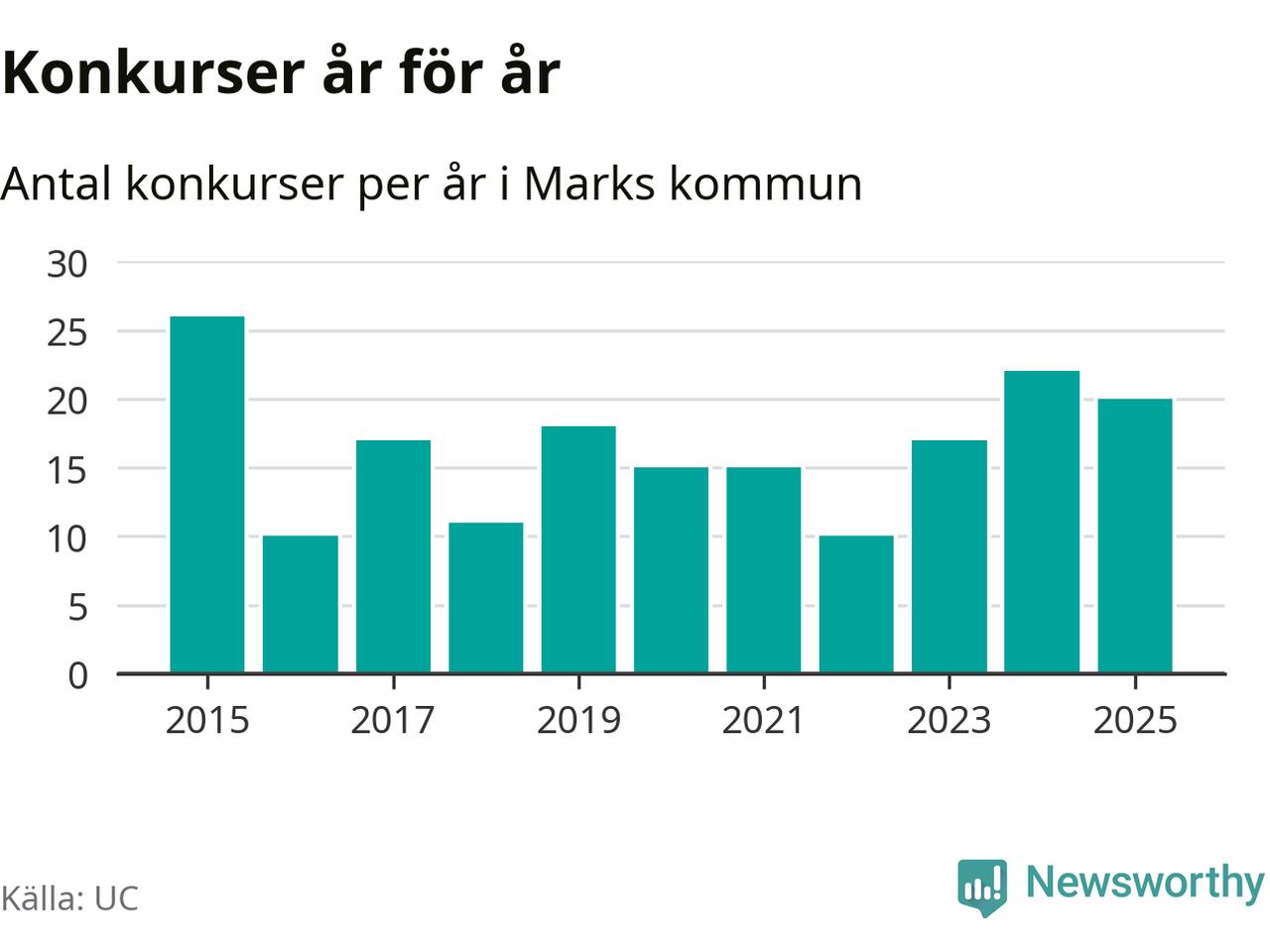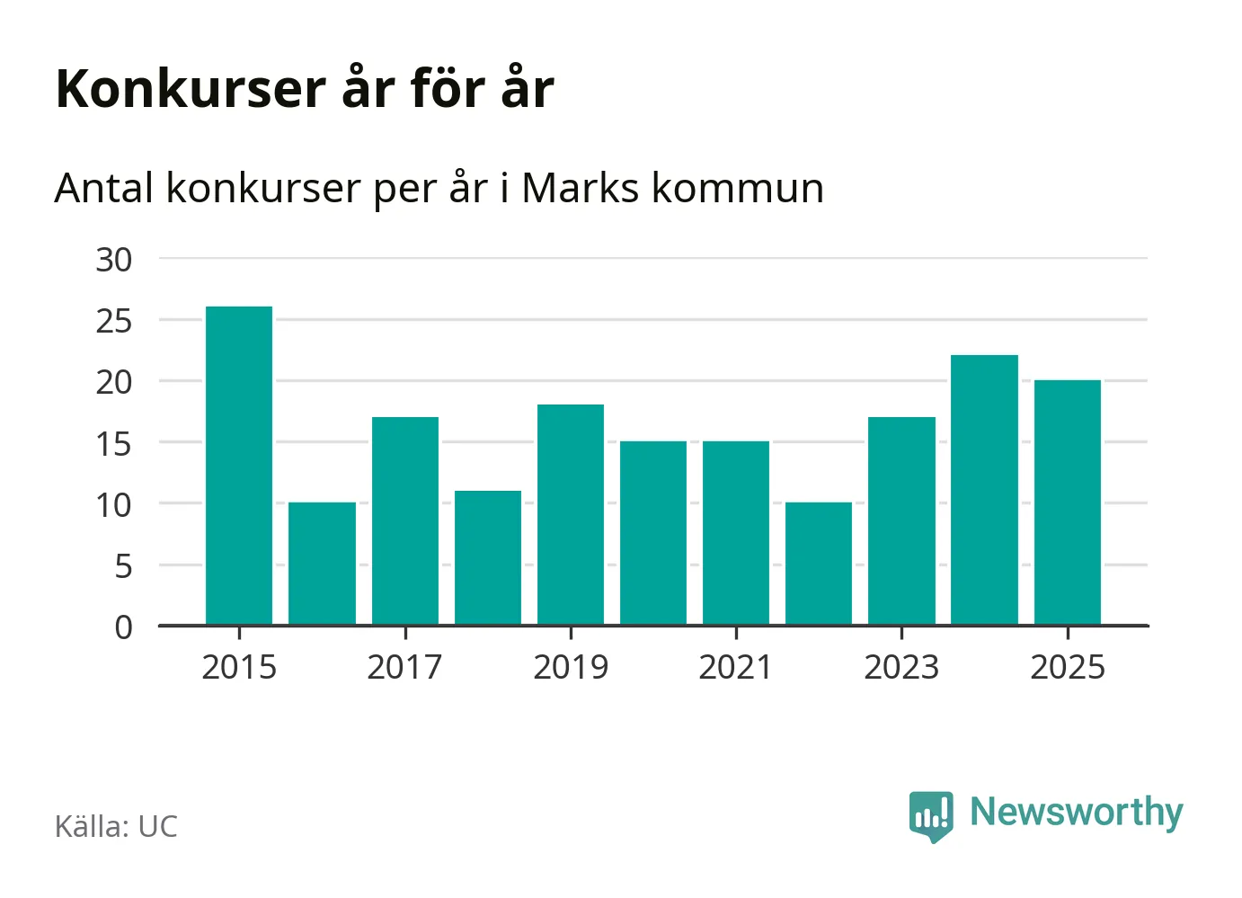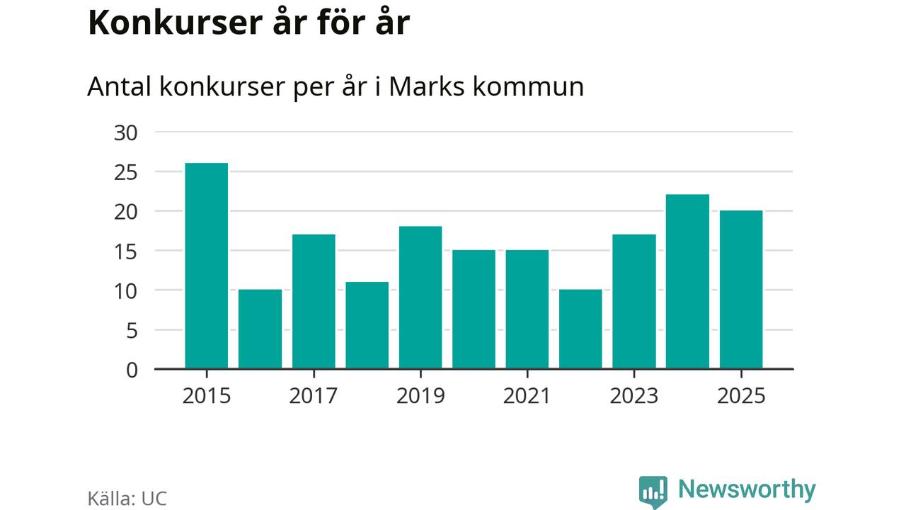 Under år 2025 gick sammanlagt 20 bolag med säte i Marks kommun i konkurs. Det är två färre än året innan. Toppåret, sedan 2015, var 2015 då 26 bolag gick i konkurs. Det visar ny statistik från UC.