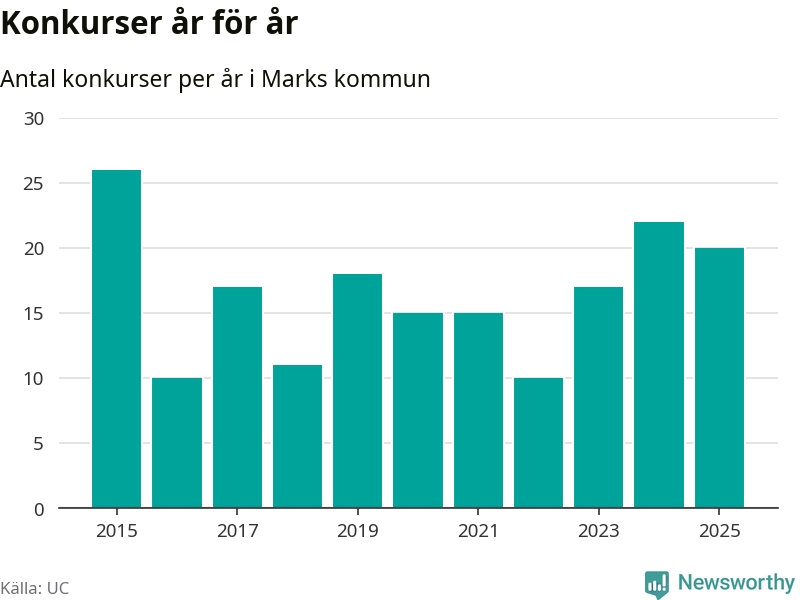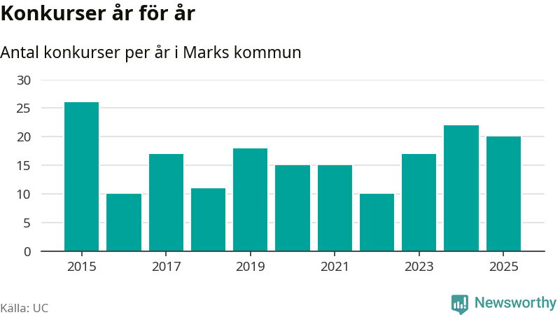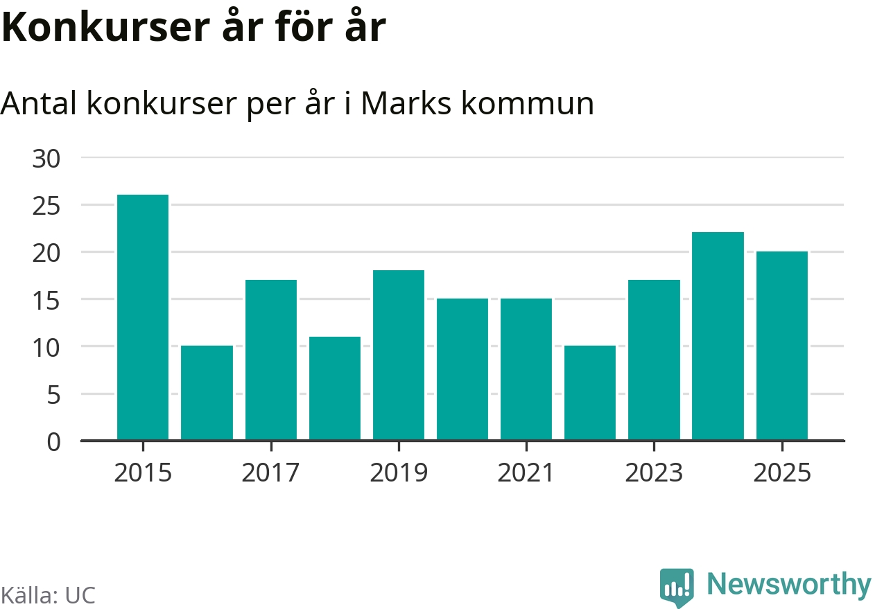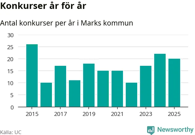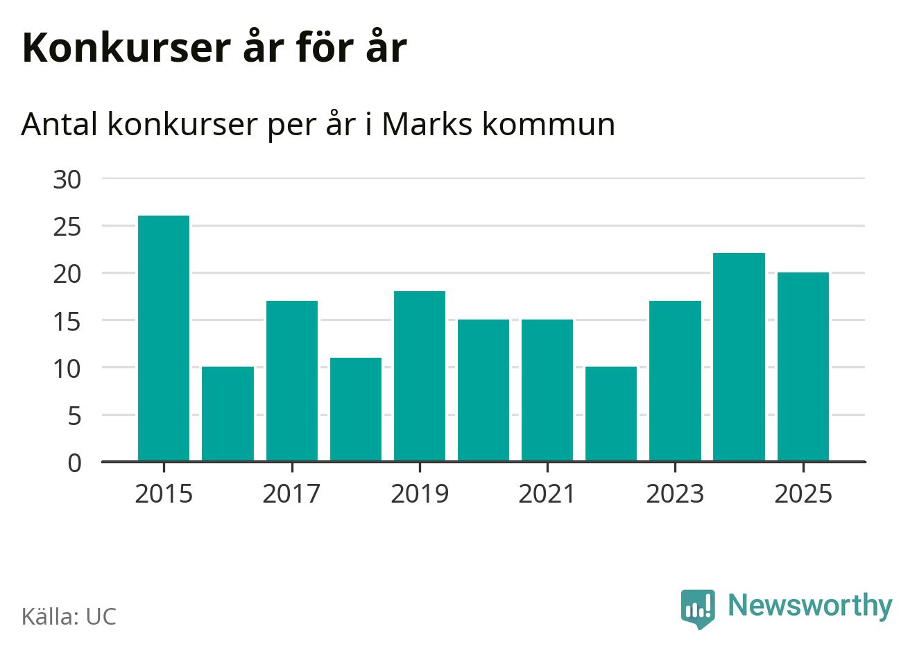 Under år 2025 gick sammanlagt 20 bolag med säte i Marks kommun i konkurs. Det är två färre än året innan. Toppåret, sedan 2015, var 2015 då 26 bolag gick i konkurs. Det visar ny statistik från UC.
