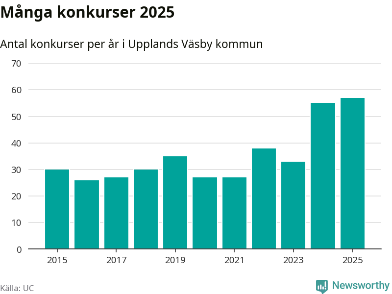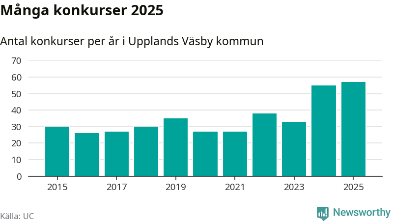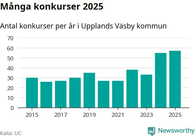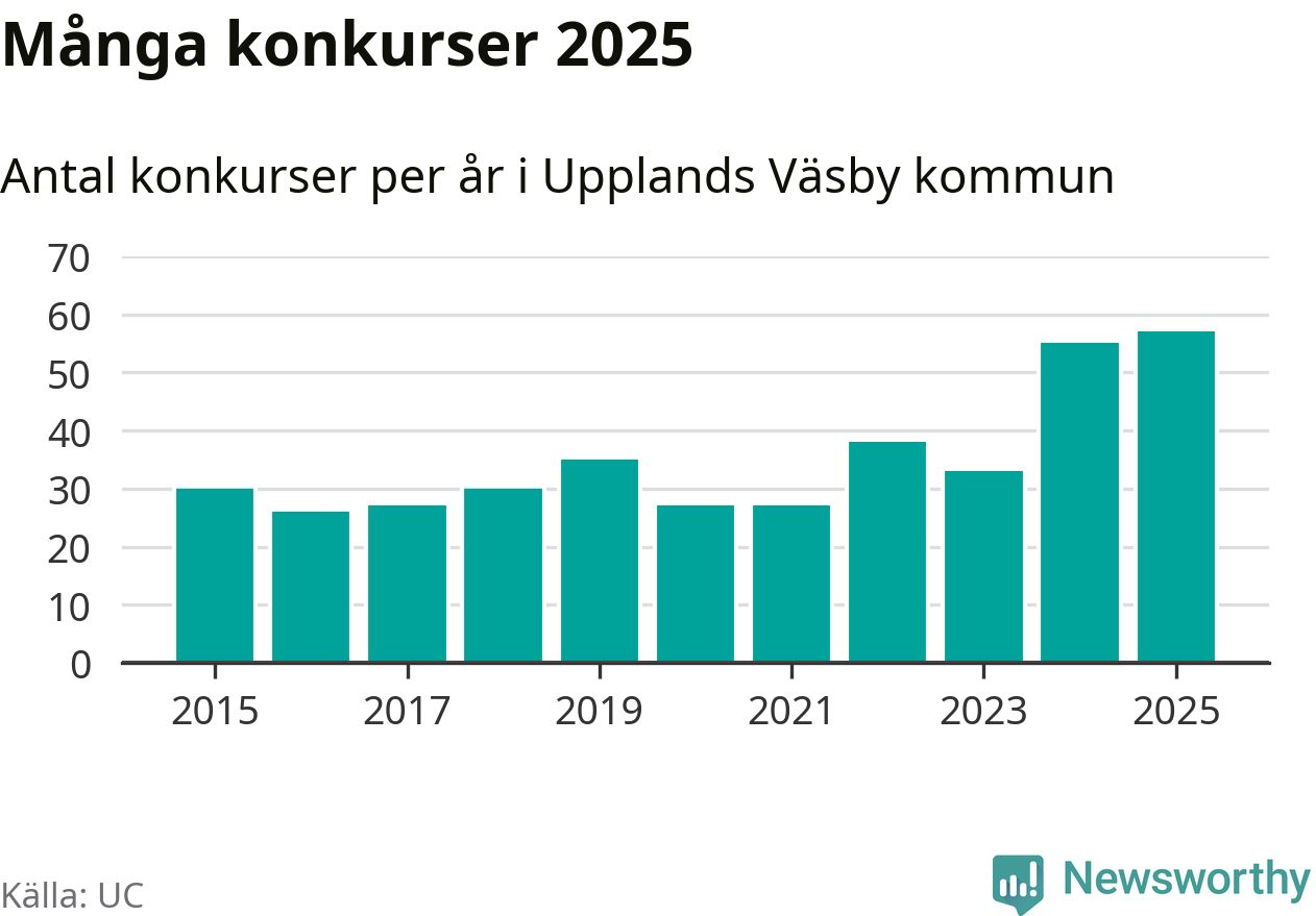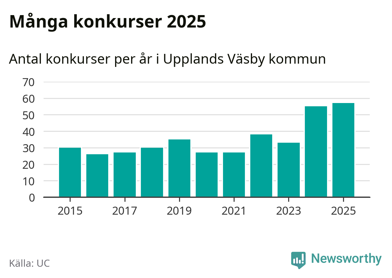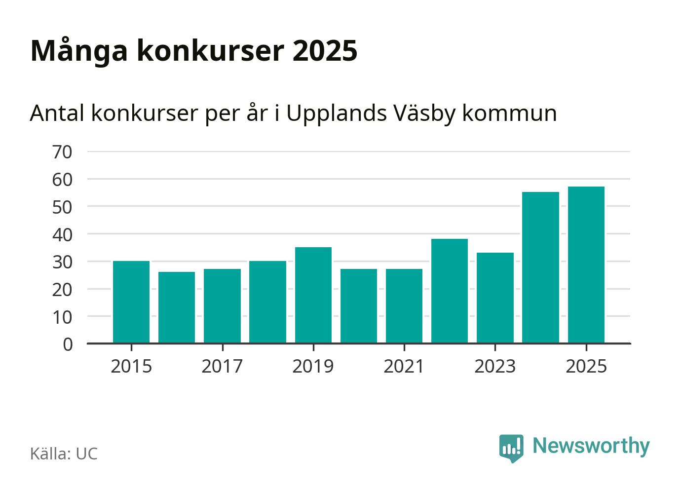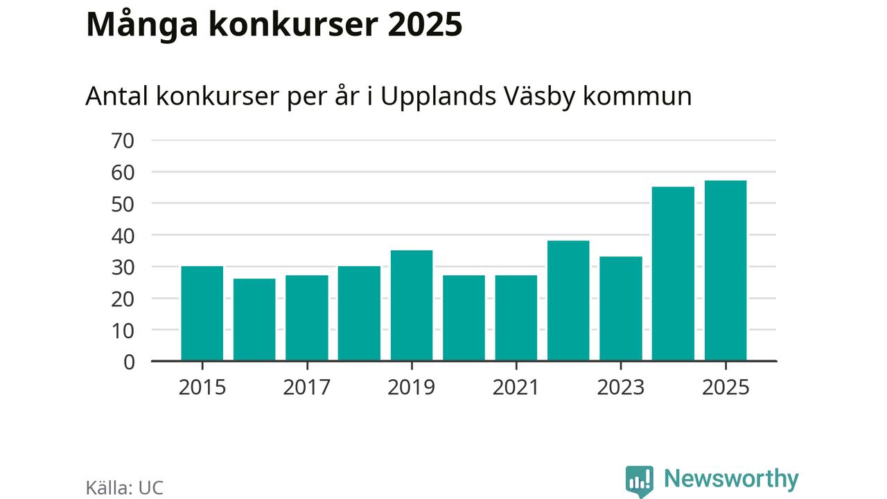 Under år 2025 gick sammanlagt 57 bolag med säte i Upplands Väsby kommun i konkurs. Det är det högsta antalet sedan åtminstone år 2015. Det visar ny statistik från UC.