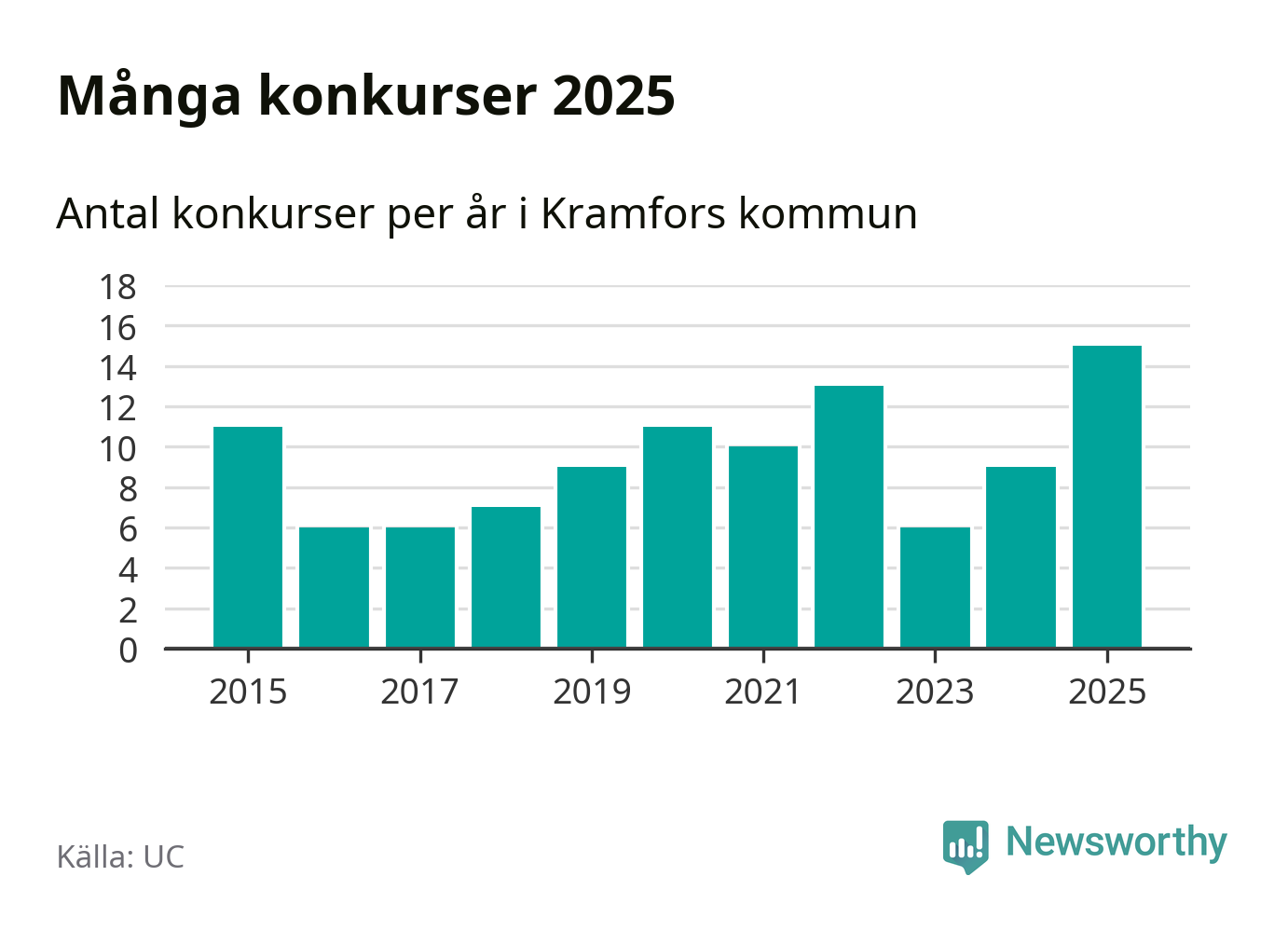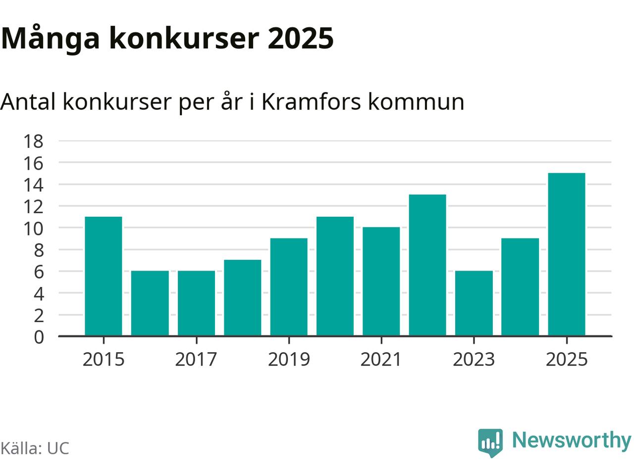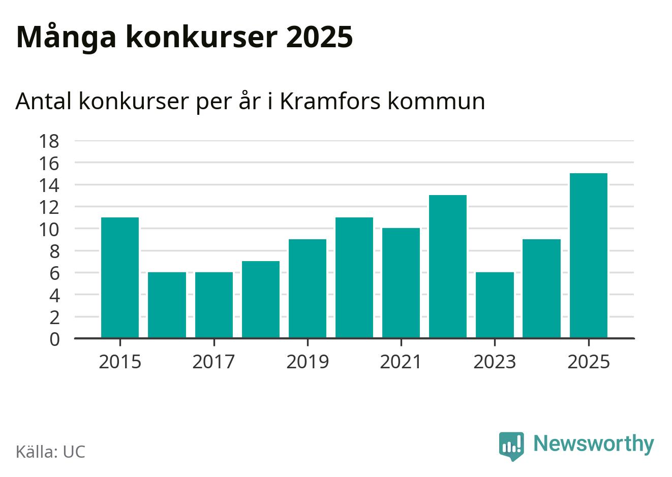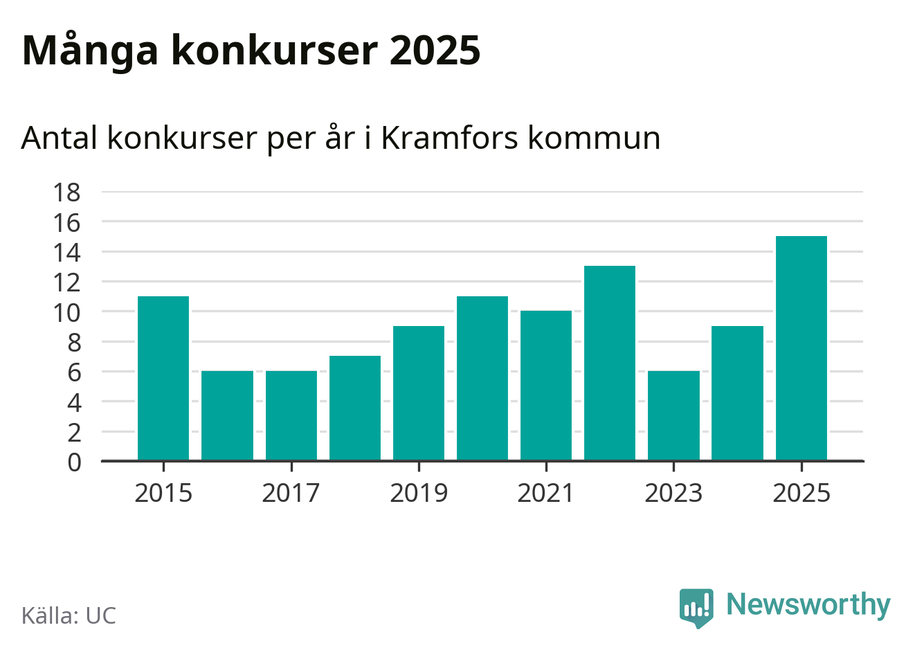 Under år 2025 gick sammanlagt 15 bolag med säte i Kramfors kommun i konkurs. Det är det högsta antalet sedan åtminstone år 2015. Det visar ny statistik från UC.