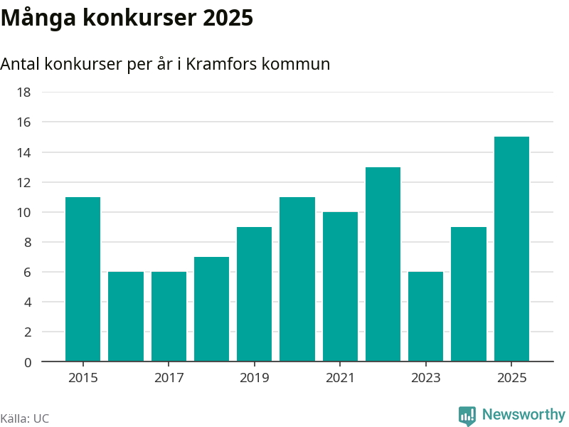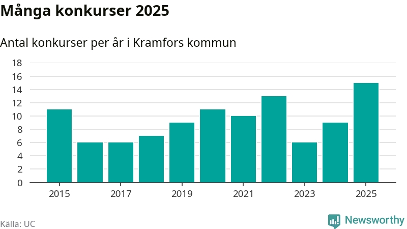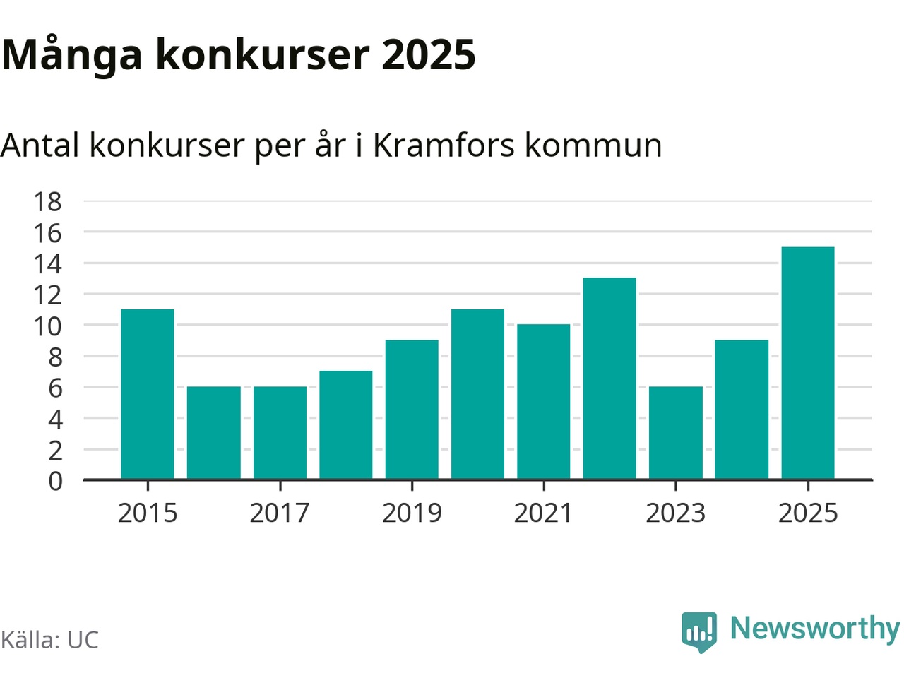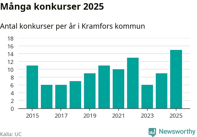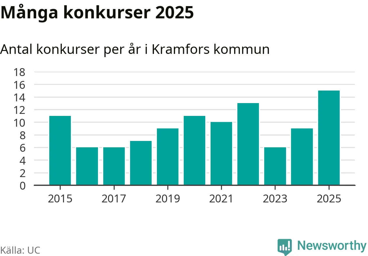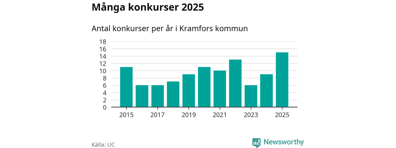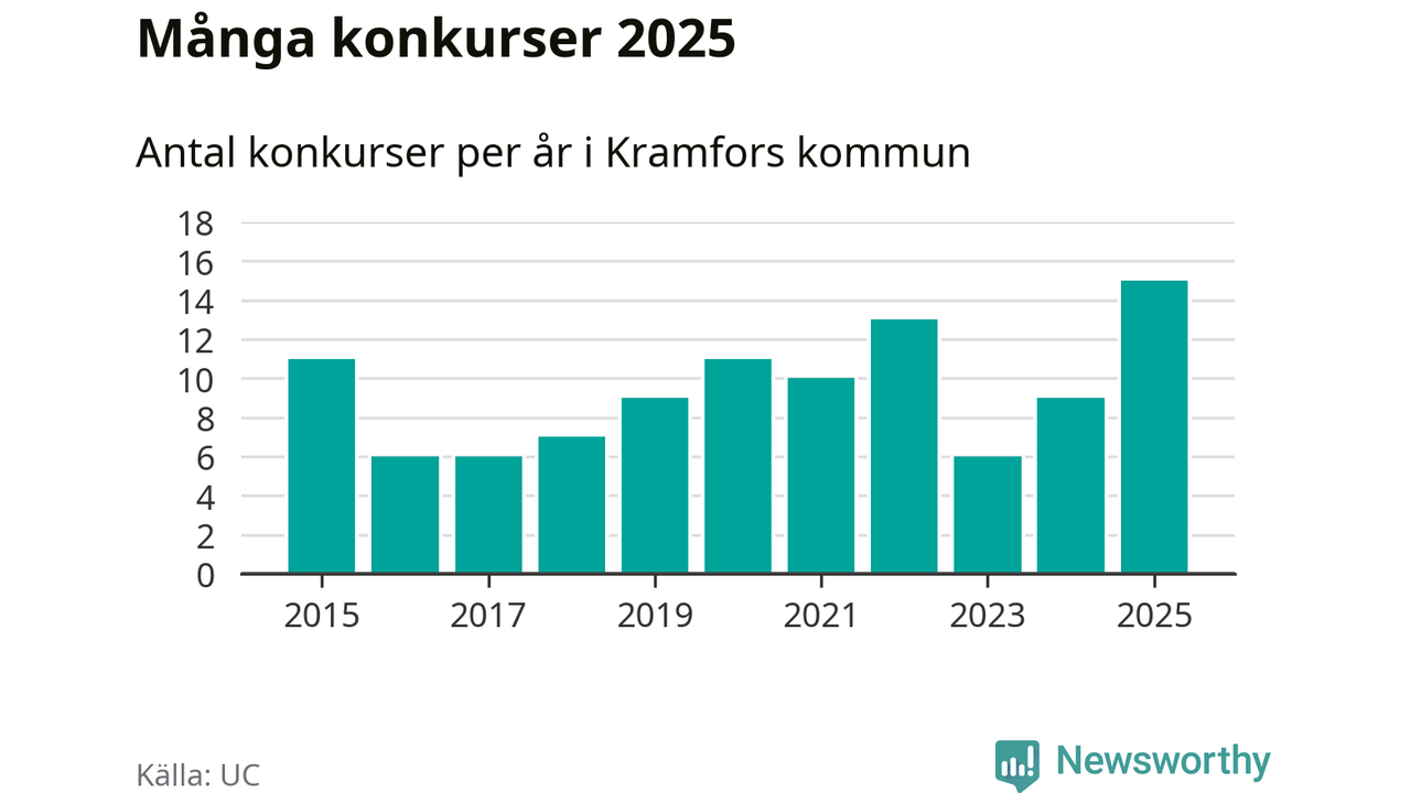 Under år 2025 gick sammanlagt 15 bolag med säte i Kramfors kommun i konkurs. Det är det högsta antalet sedan åtminstone år 2015. Det visar ny statistik från UC.