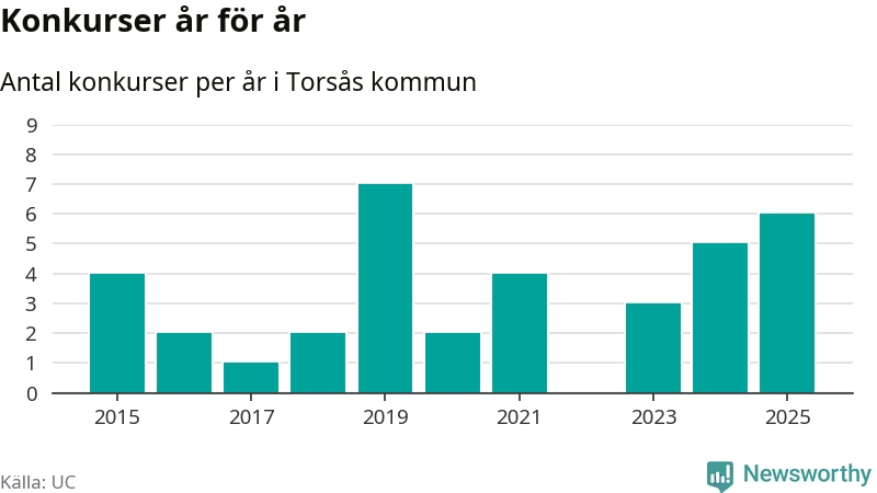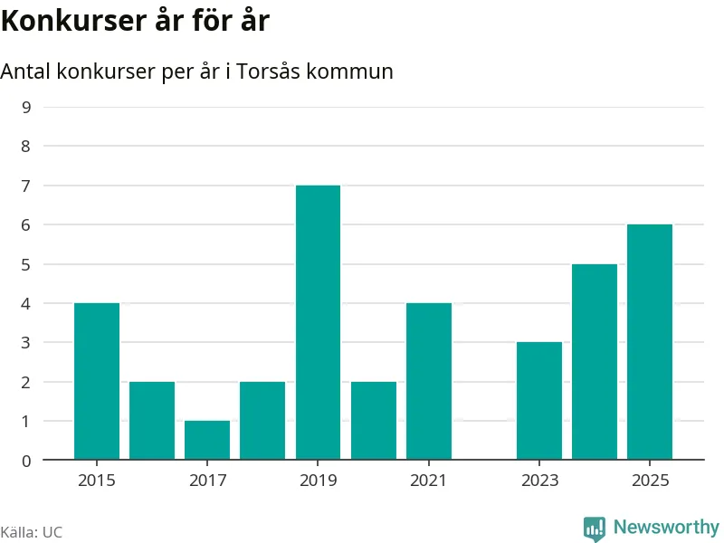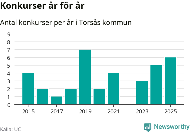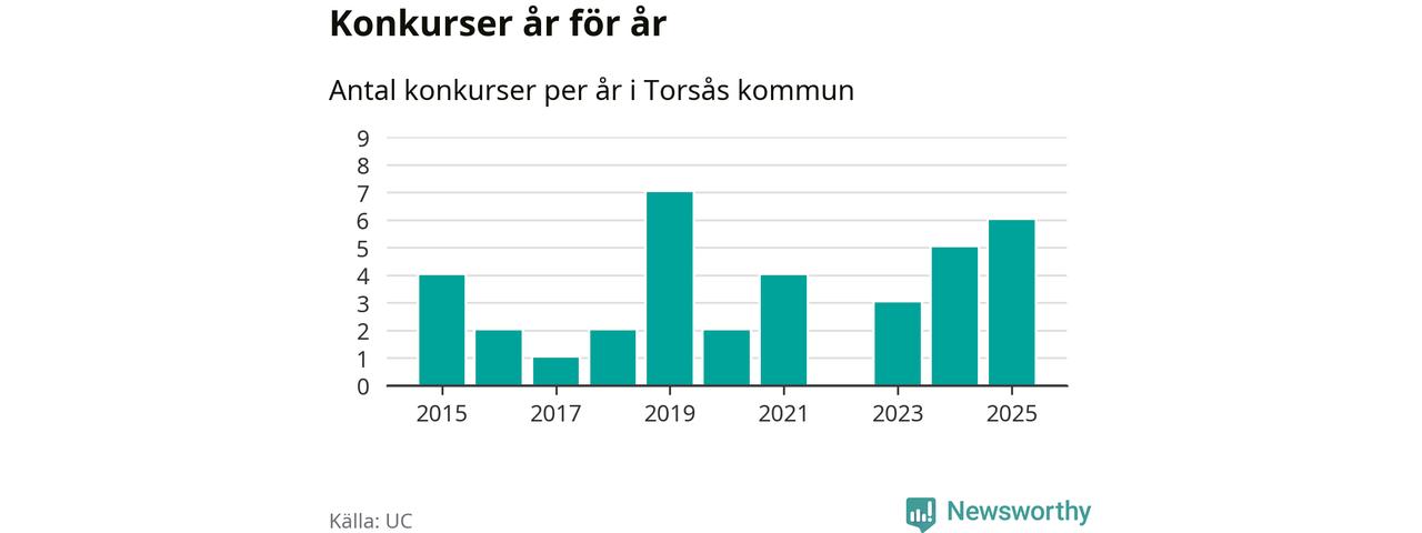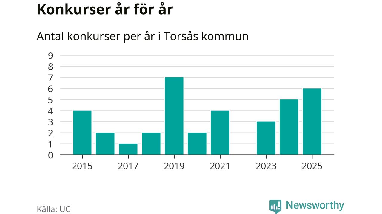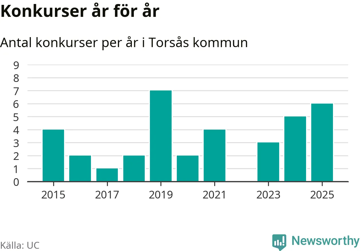 Under år 2025 gick sammanlagt sex bolag med säte i Torsås kommun i konkurs. Det är det högsta antalet sedan år 2019. Det visar ny statistik från UC.
