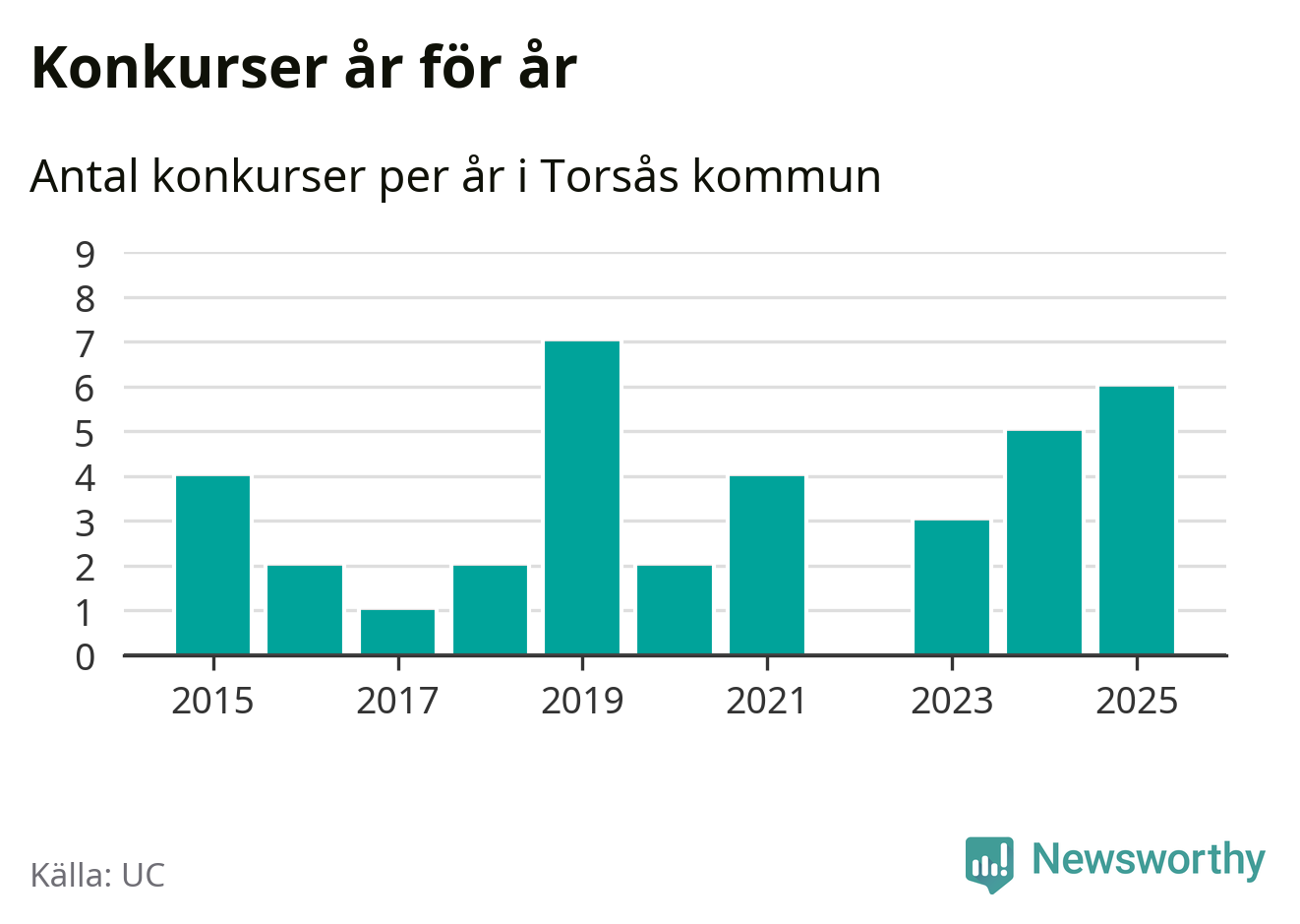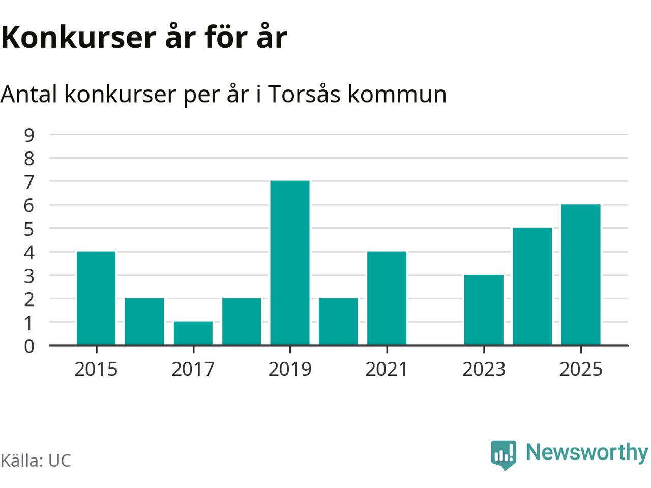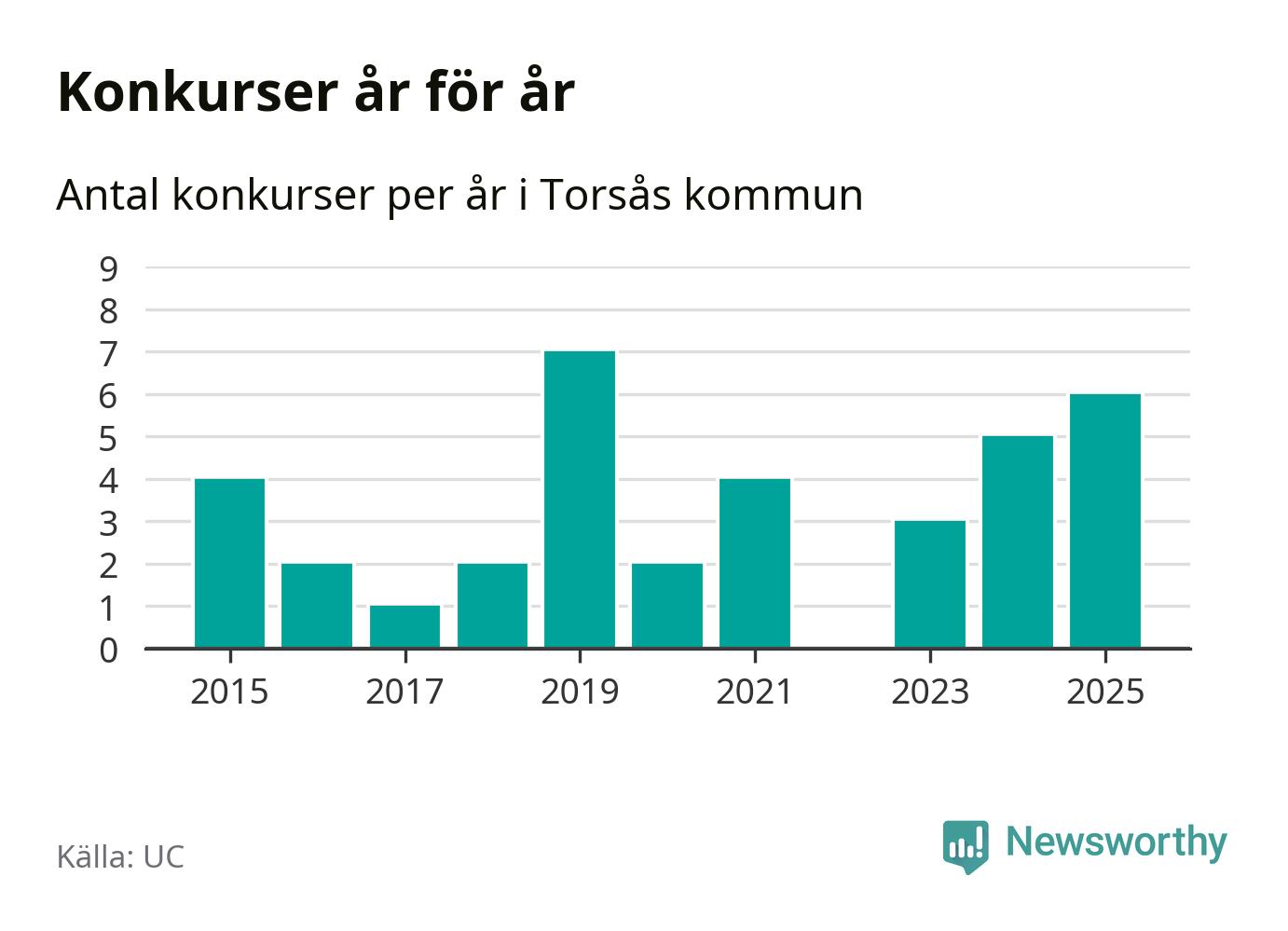 Under år 2025 gick sammanlagt sex bolag med säte i Torsås kommun i konkurs. Det är det högsta antalet sedan år 2019. Det visar ny statistik från UC.