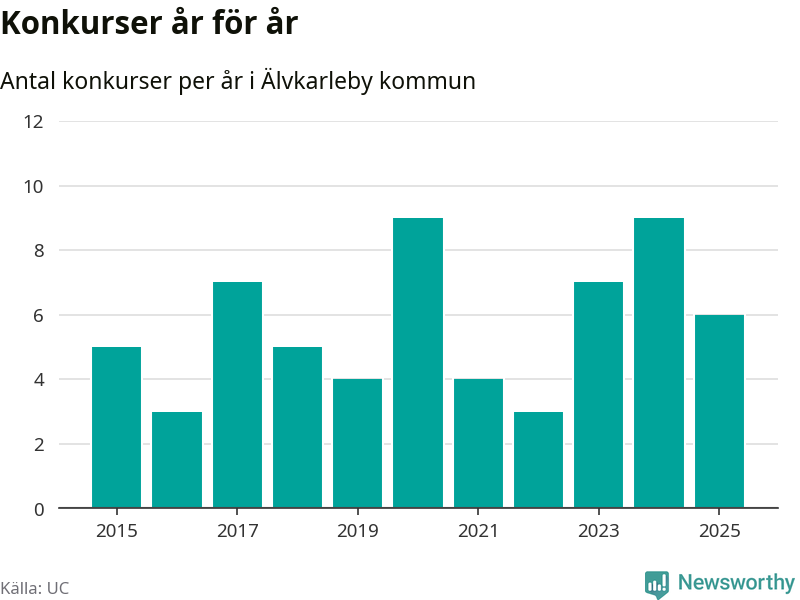 Under år 2025 gick sammanlagt sex bolag med säte i Älvkarleby kommun i konkurs. Det är tre färre än året innan då nio bolag gick i konkurs. Toppåren, sedan 2015, var just 2020 och 2024 sett till antalet konkursföretag. Det visar ny statistik från UC.