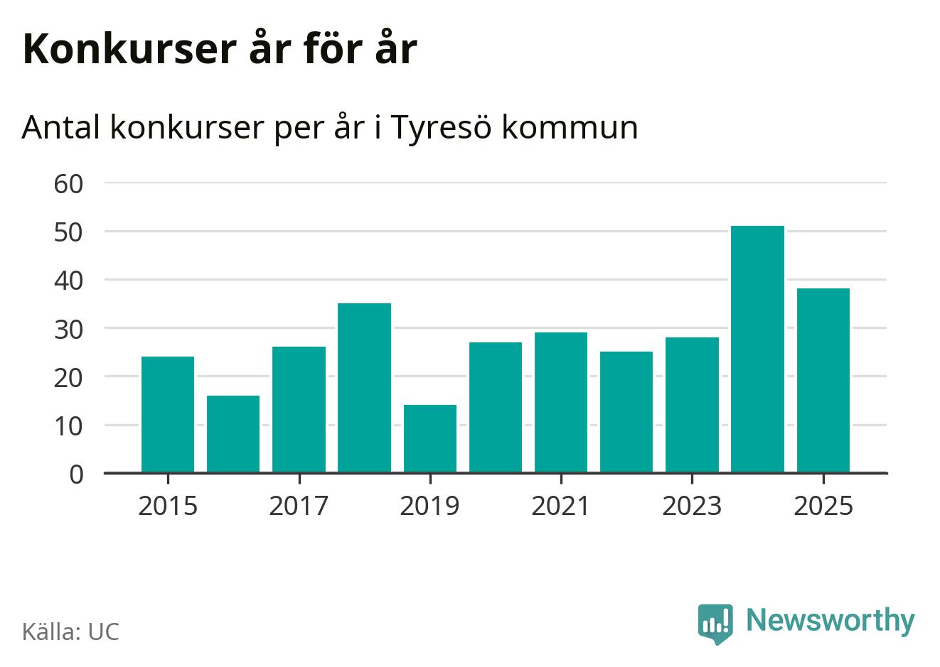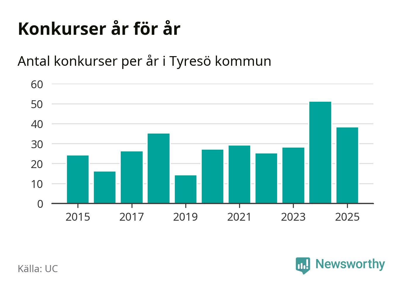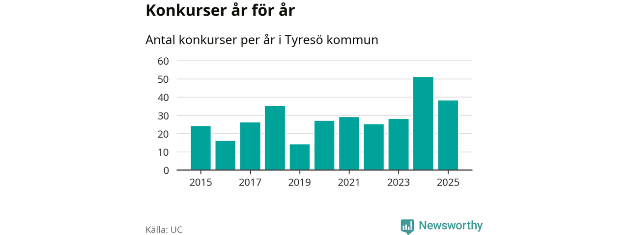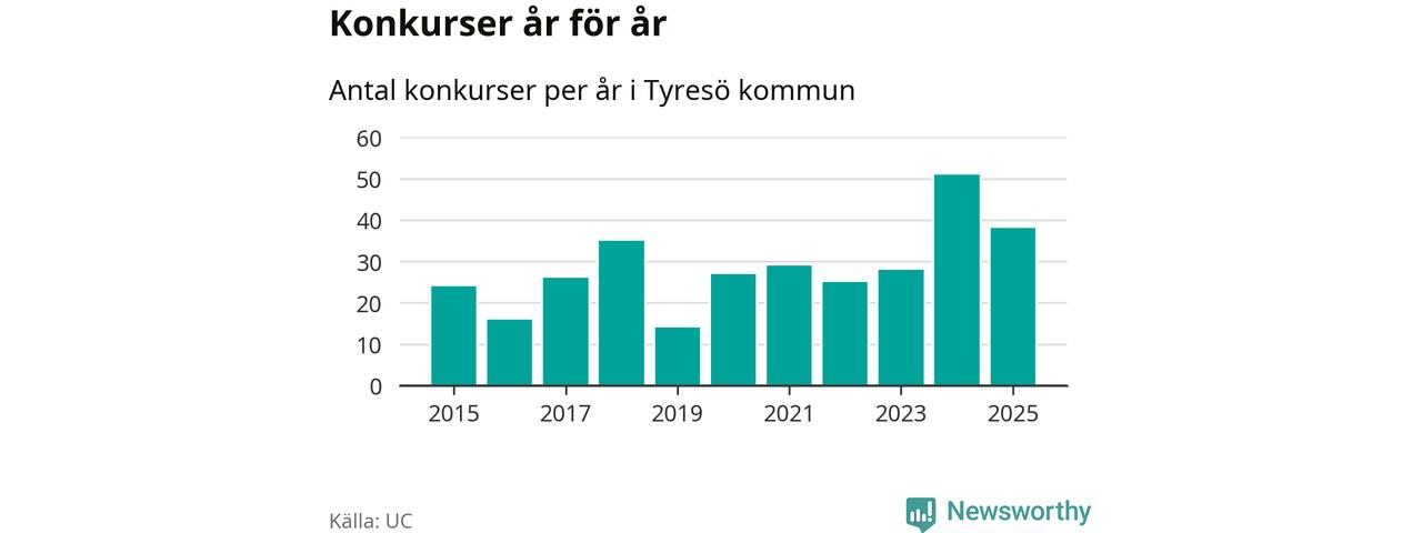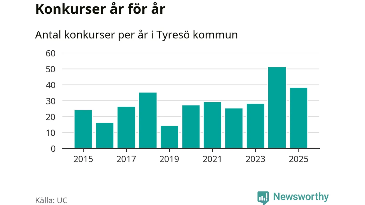 Under år 2025 gick sammanlagt 38 bolag med säte i Tyresö kommun i konkurs. Det är 13 färre än året innan då 51 bolag gick i konkurs. Toppåret, sedan 2015, var just 2024 sett till antalet konkursföretag. Det visar ny statistik från UC.
