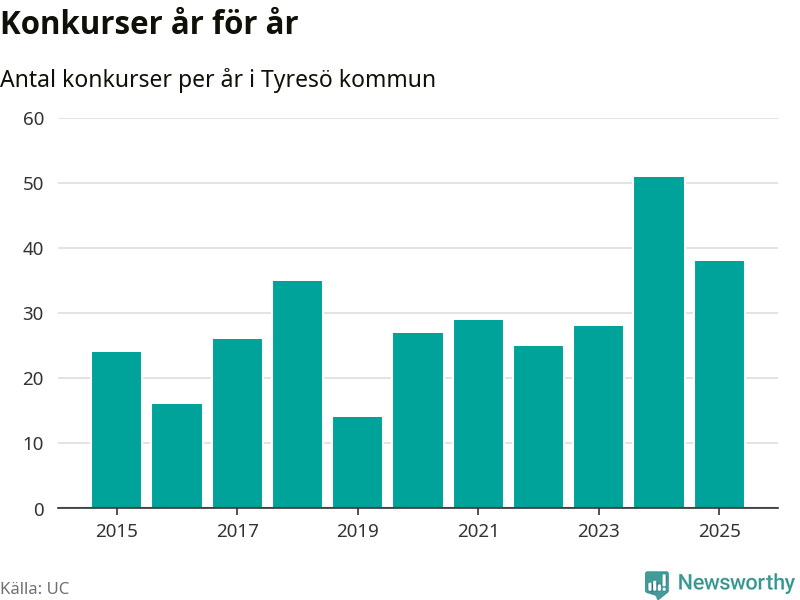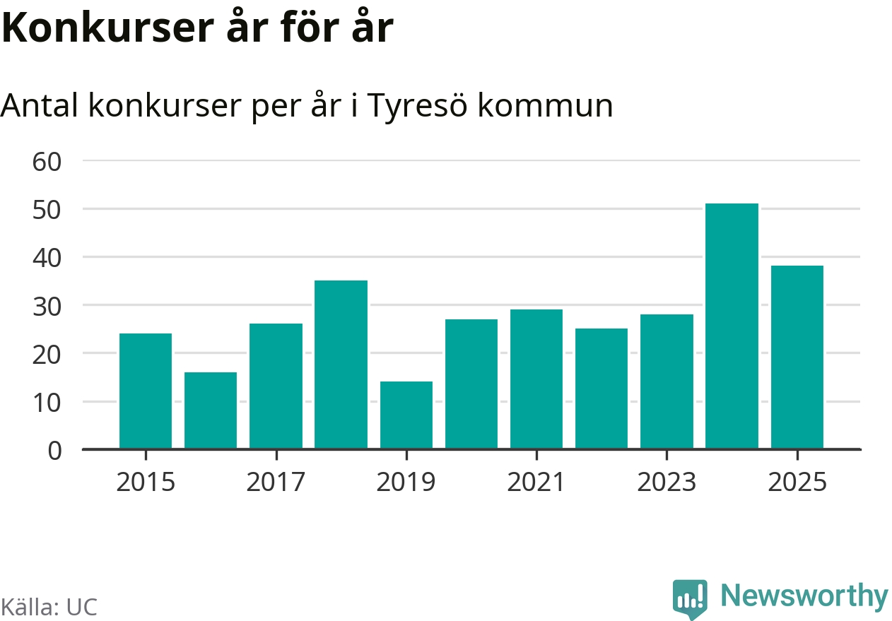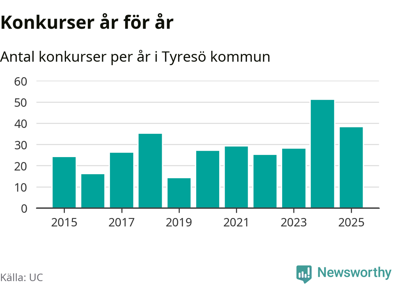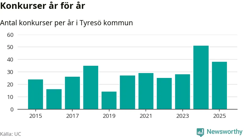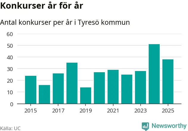 Under år 2025 gick sammanlagt 38 bolag med säte i Tyresö kommun i konkurs. Det är 13 färre än året innan då 51 bolag gick i konkurs. Toppåret, sedan 2015, var just 2024 sett till antalet konkursföretag. Det visar ny statistik från UC.