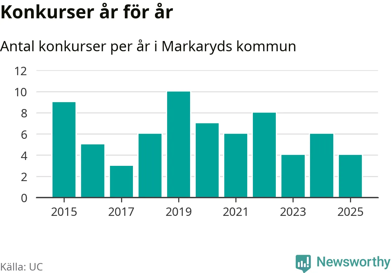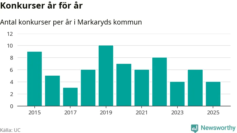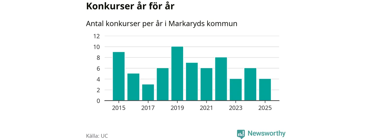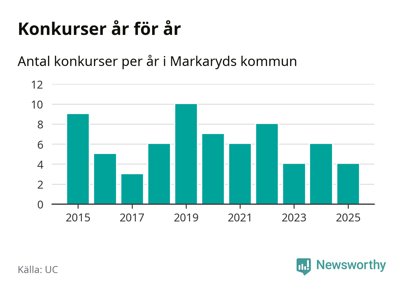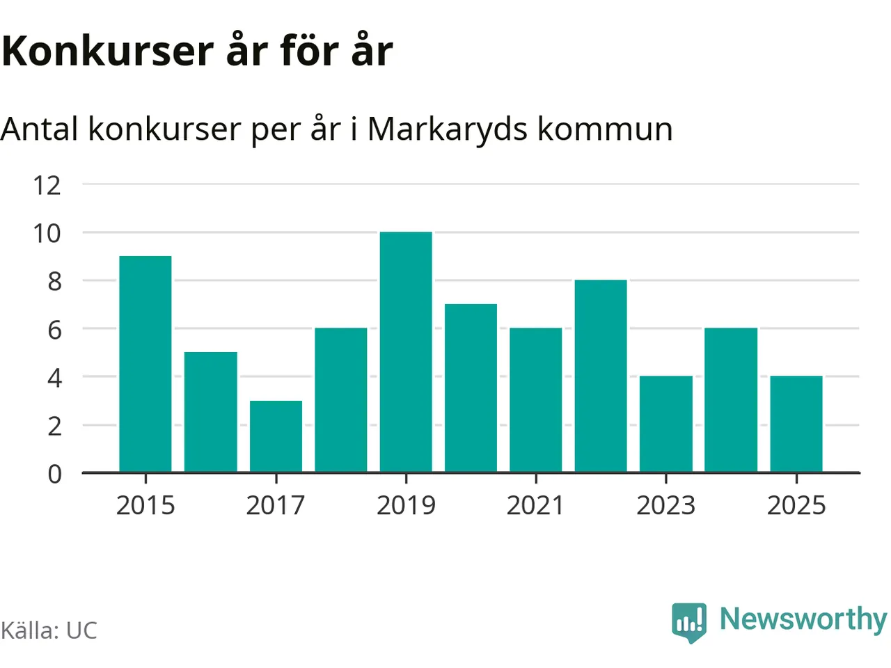 Under år 2025 gick sammanlagt fyra bolag med säte i Markaryds kommun i konkurs. Det är två färre än året innan. Toppåret, sedan 2015, var 2019 då tio bolag gick i konkurs. Det visar ny statistik från UC.
