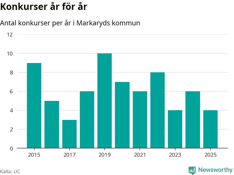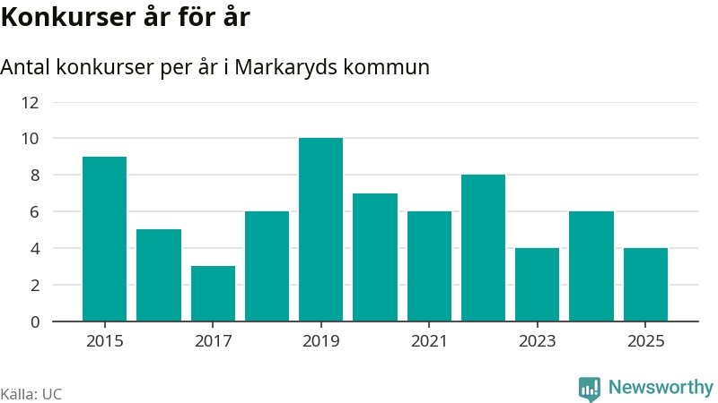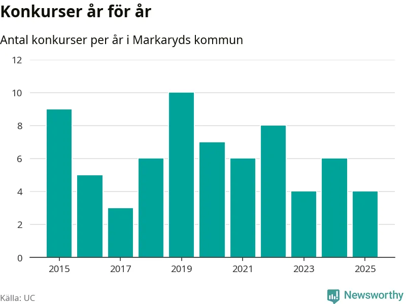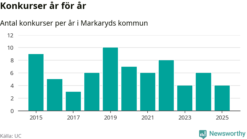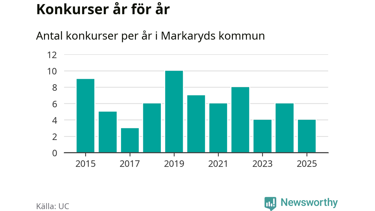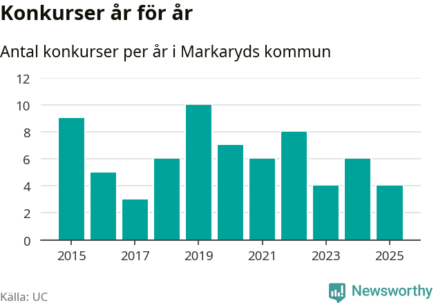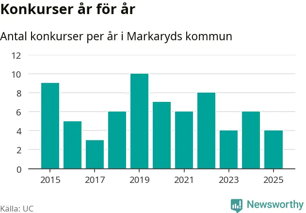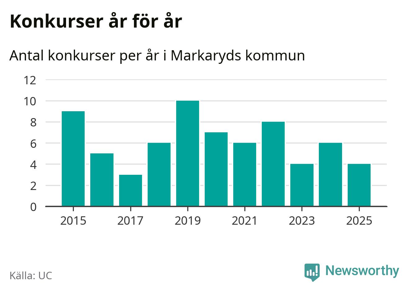 Under år 2025 gick sammanlagt fyra bolag med säte i Markaryds kommun i konkurs. Det är två färre än året innan. Toppåret, sedan 2015, var 2019 då tio bolag gick i konkurs. Det visar ny statistik från UC.