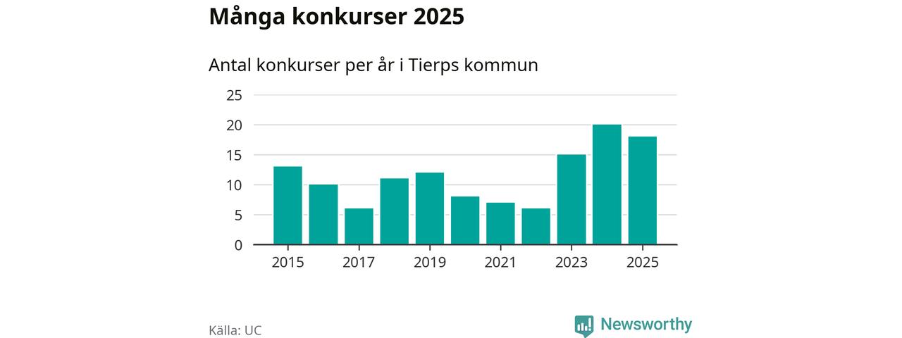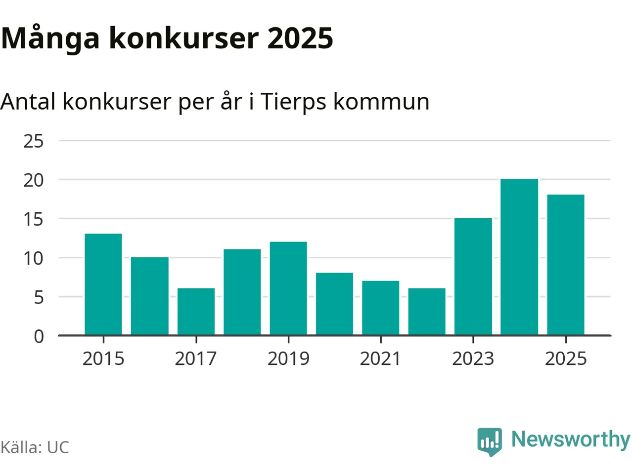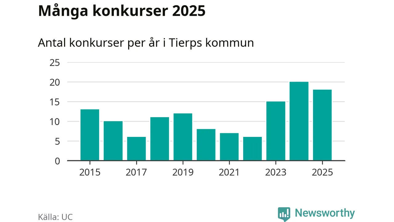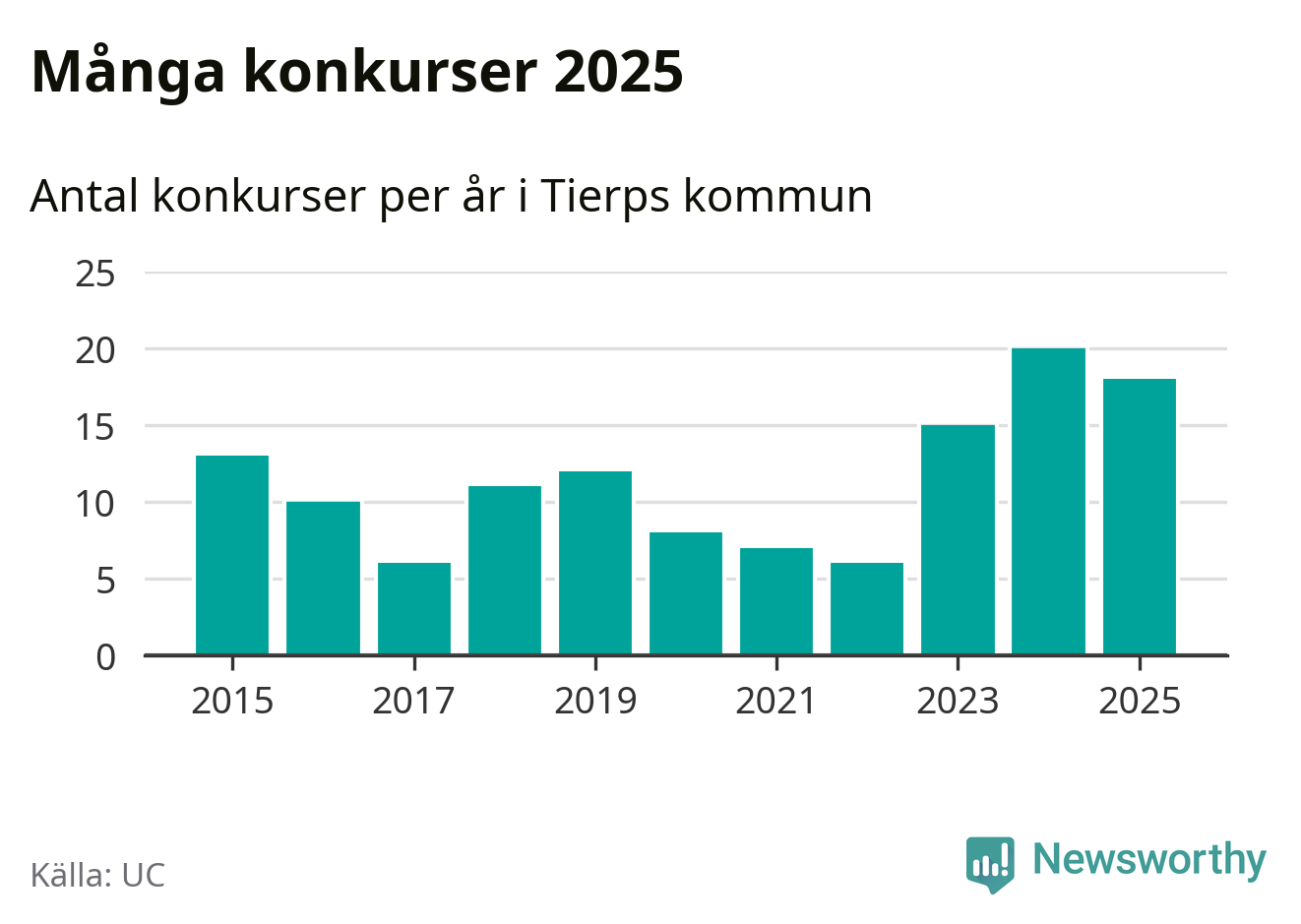 Under år 2025 gick sammanlagt 18 bolag med säte i Tierps kommun i konkurs. Det är två färre än året innan. Toppåret, sedan 2015, var just 2024 sett till antalet konkursföretag. Det visar ny statistik från UC.