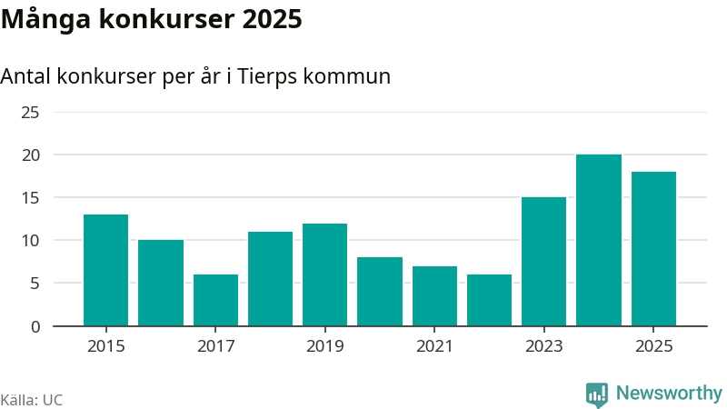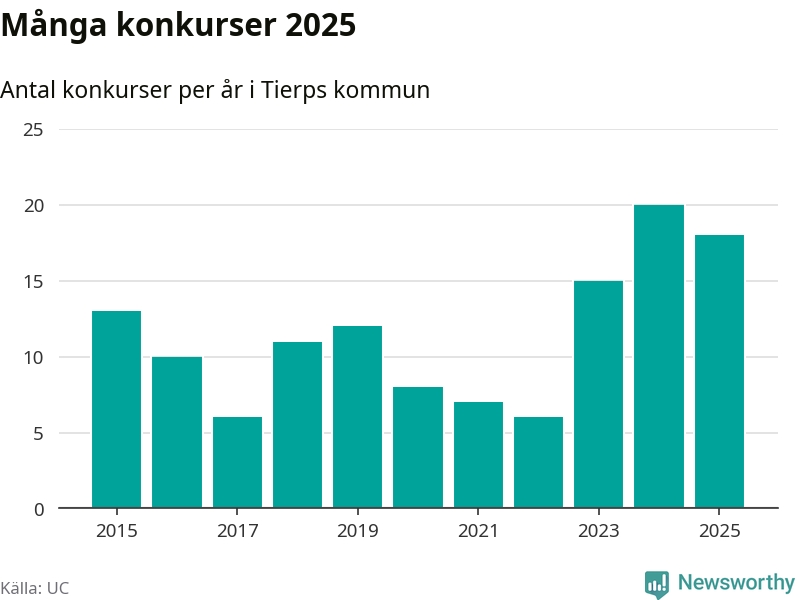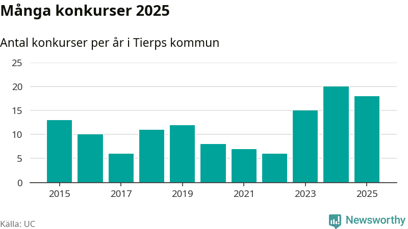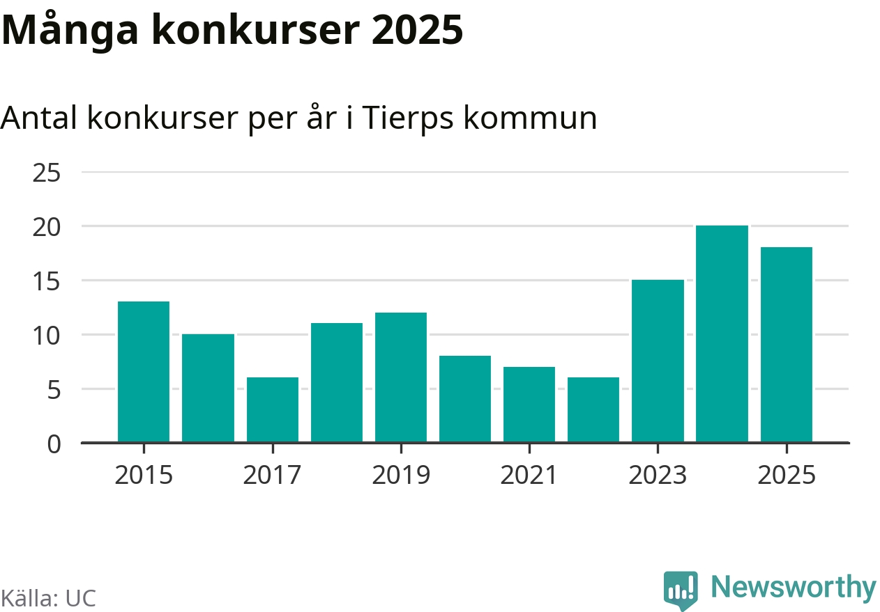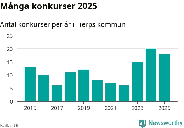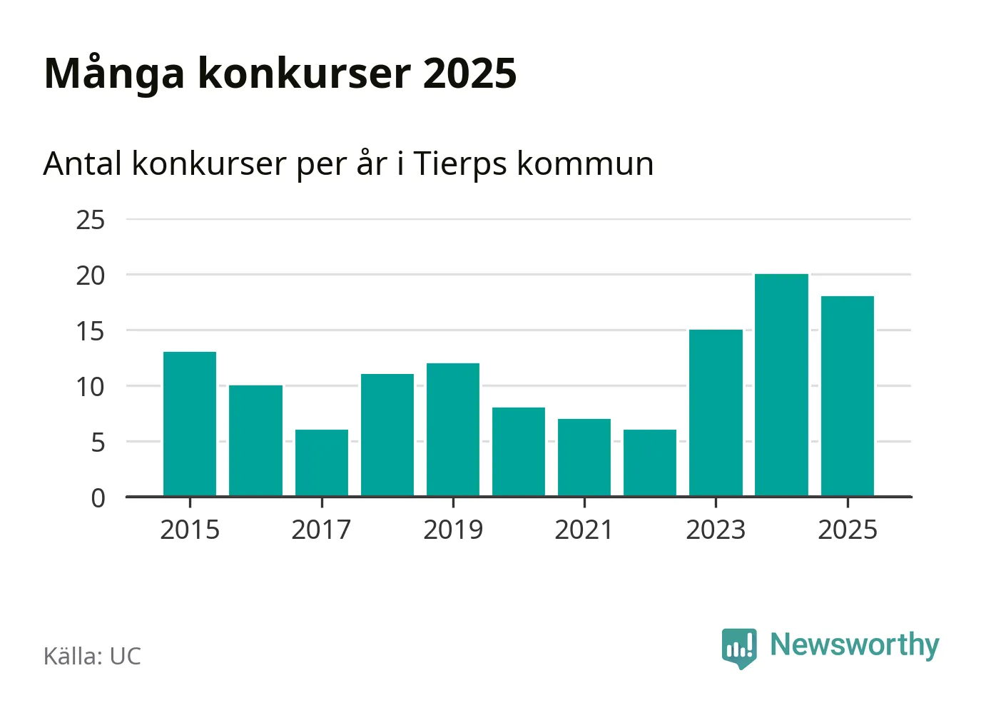 Under år 2025 gick sammanlagt 18 bolag med säte i Tierps kommun i konkurs. Det är två färre än året innan. Toppåret, sedan 2015, var just 2024 sett till antalet konkursföretag. Det visar ny statistik från UC.
