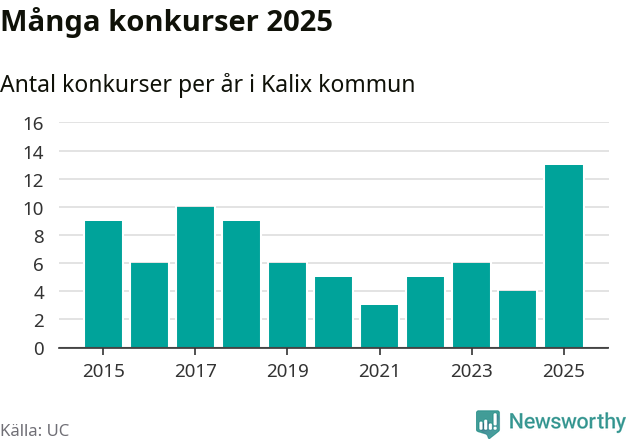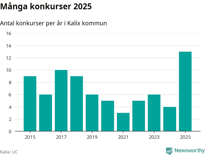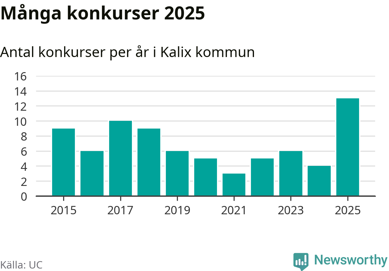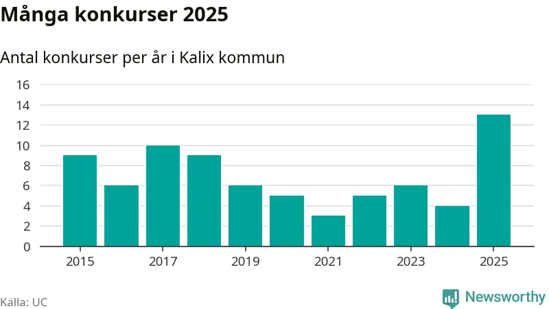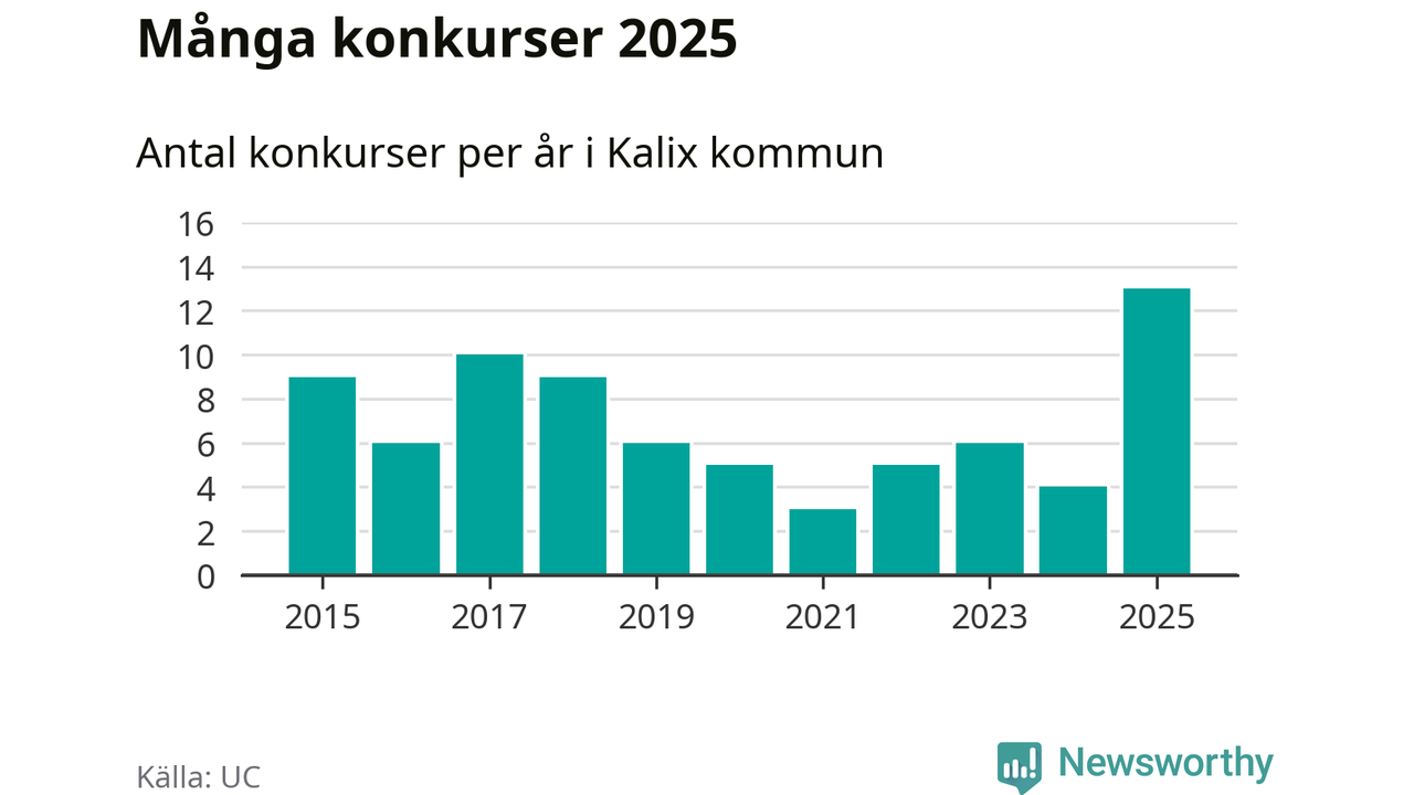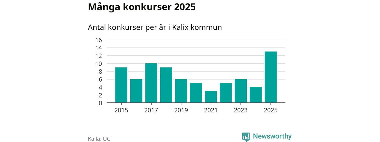 Under år 2025 gick sammanlagt 13 bolag med säte i Kalix kommun i konkurs. Det är det högsta antalet sedan åtminstone år 2015. Det visar ny statistik från UC.