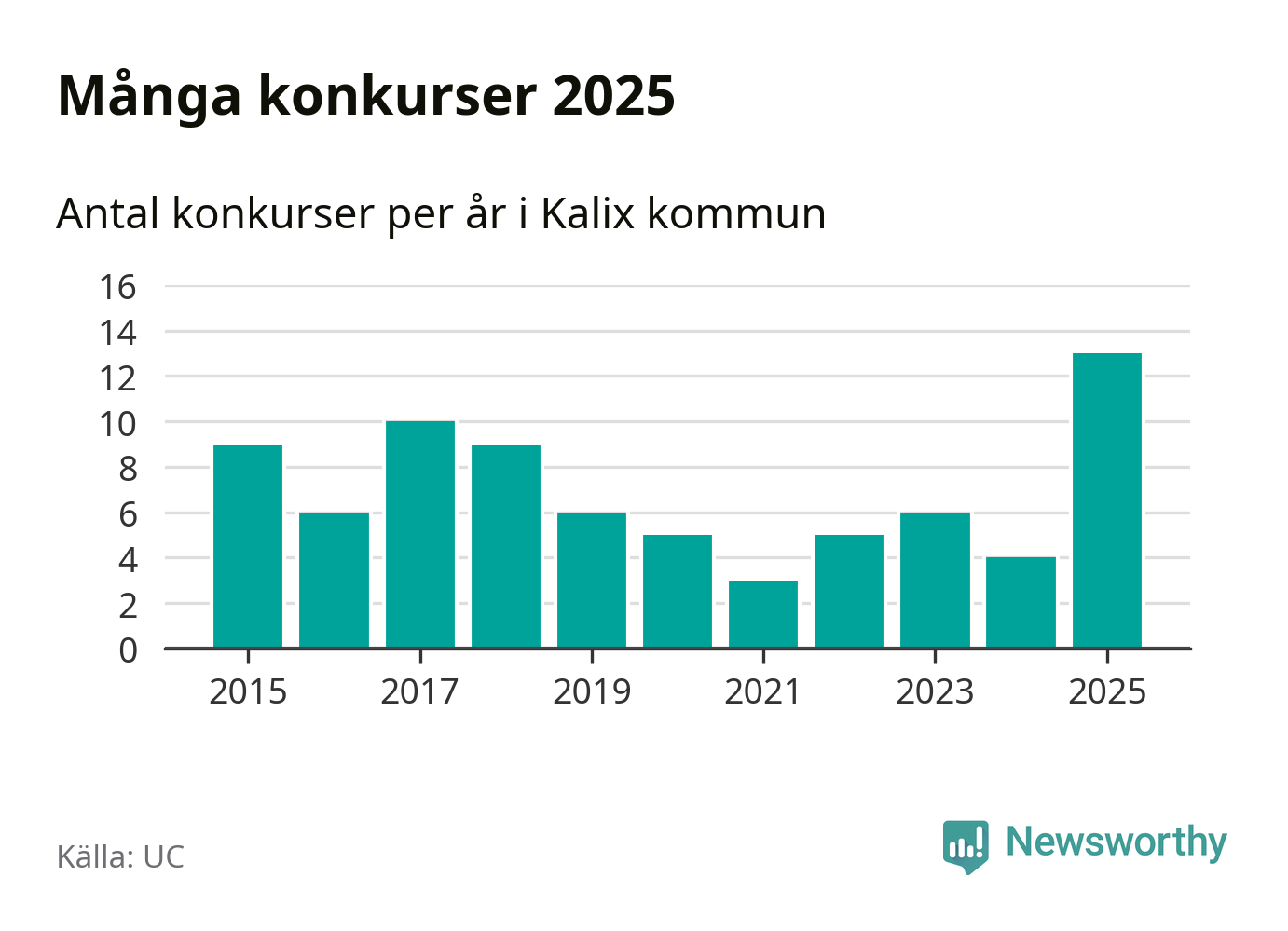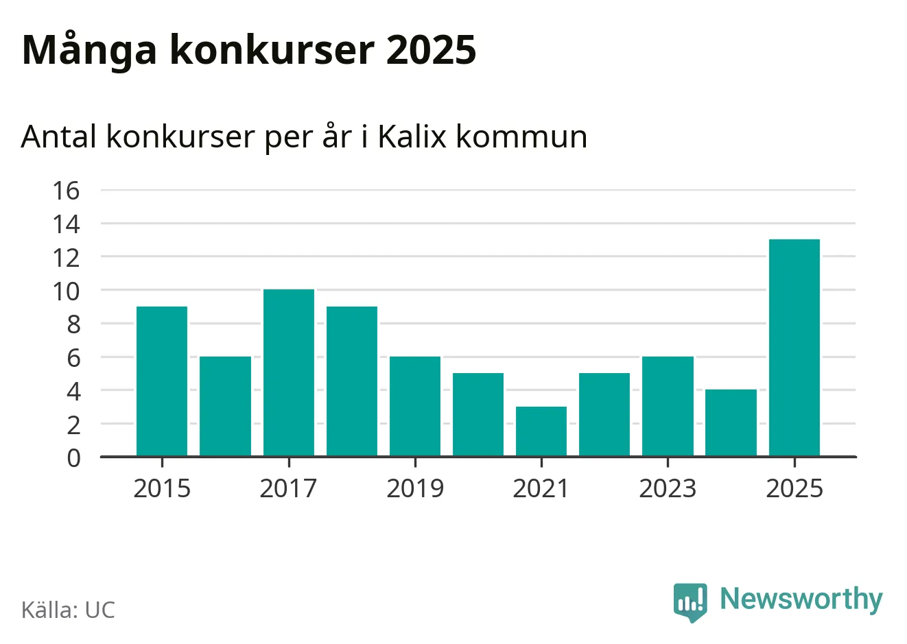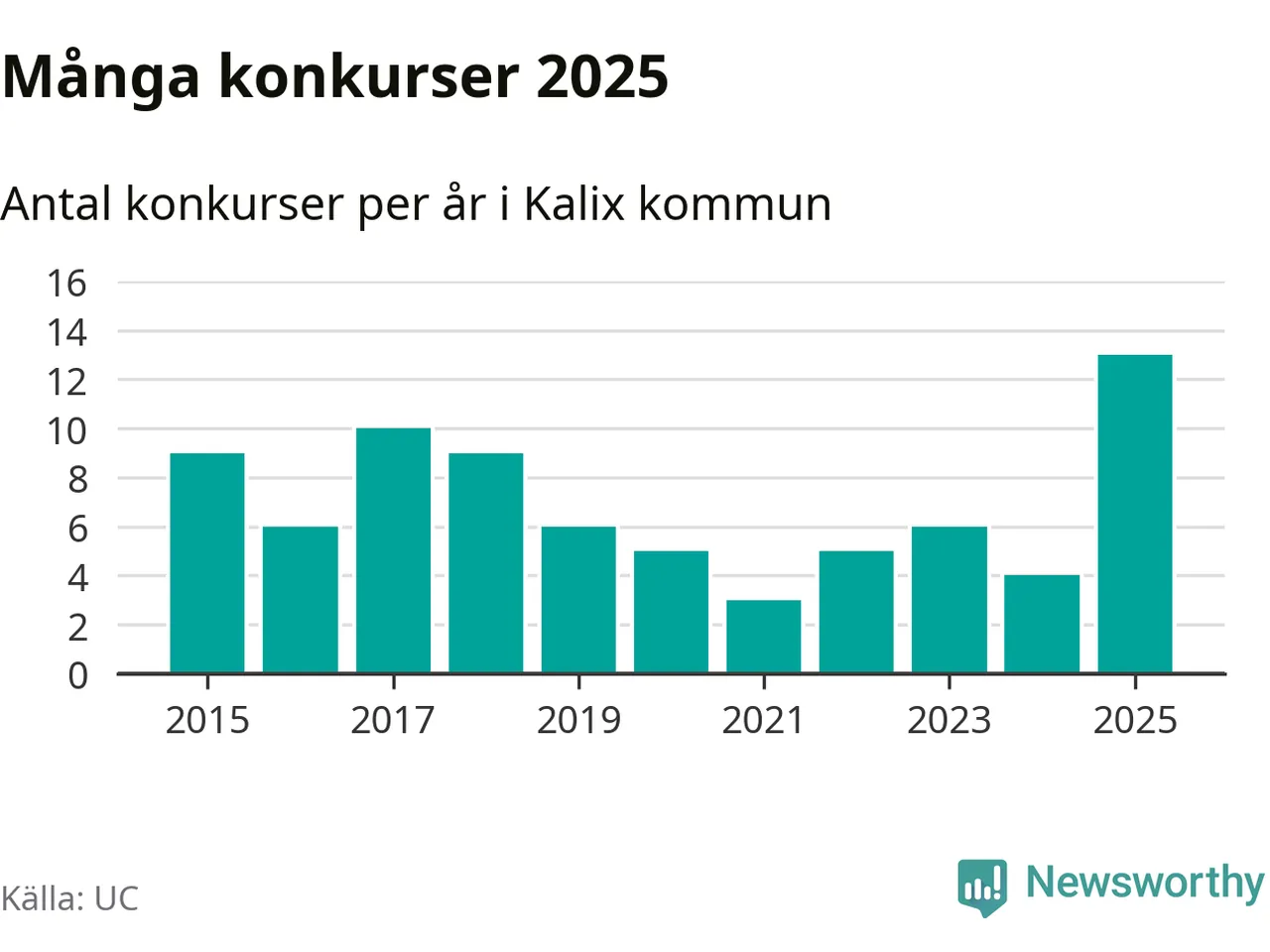 Under år 2025 gick sammanlagt 13 bolag med säte i Kalix kommun i konkurs. Det är det högsta antalet sedan åtminstone år 2015. Det visar ny statistik från UC.