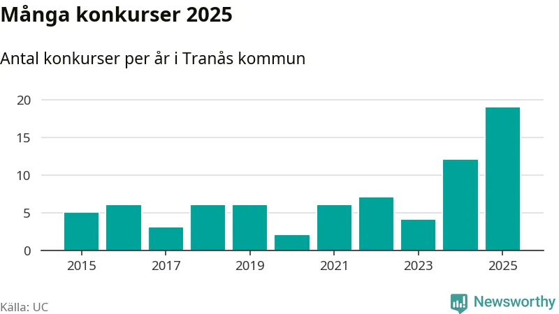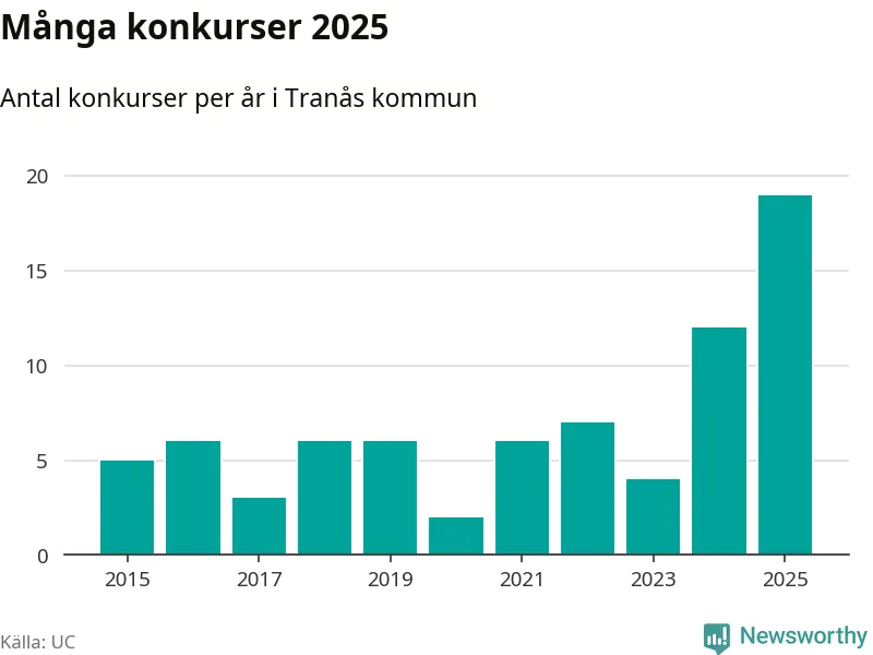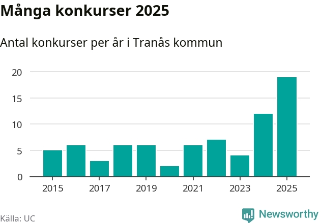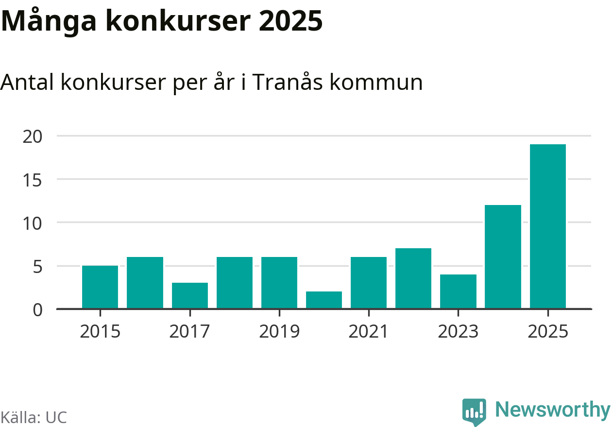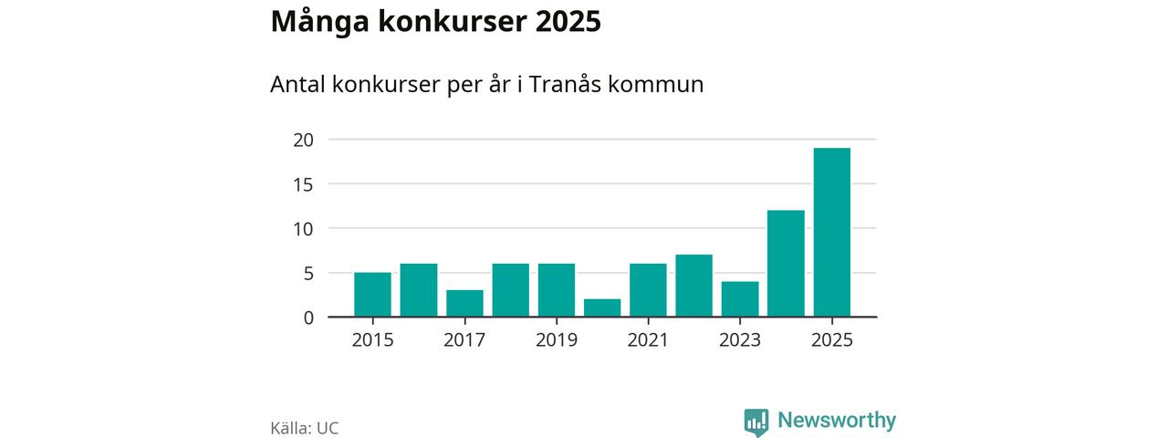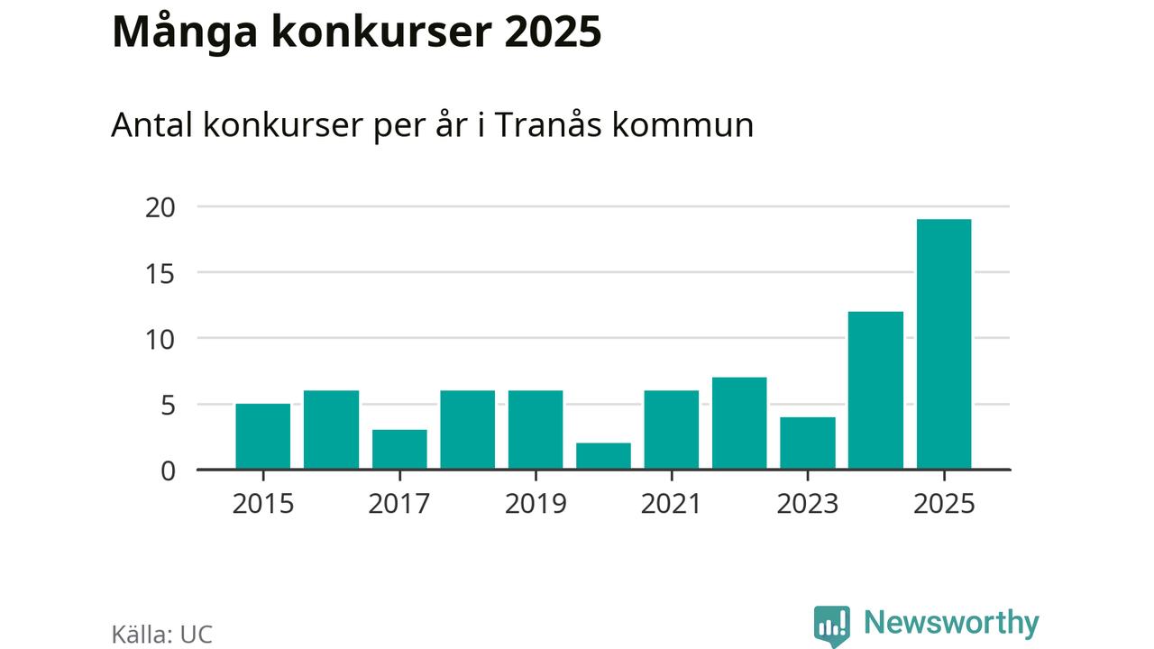 Under år 2025 gick sammanlagt 19 bolag med säte i Tranås kommun i konkurs. Det är det högsta antalet sedan åtminstone år 2015. Det visar ny statistik från UC.