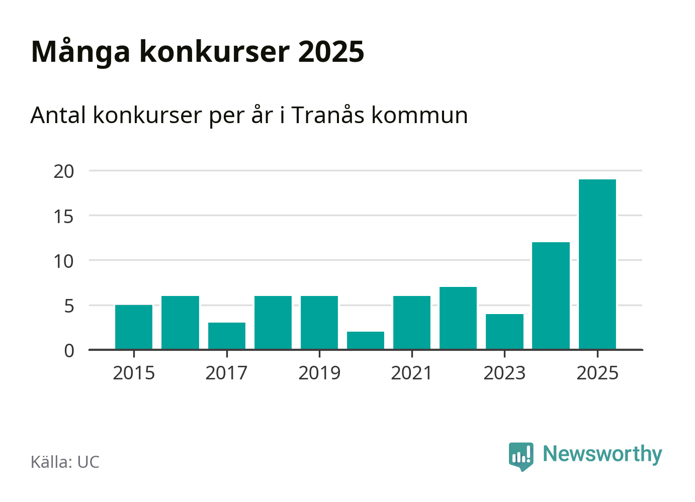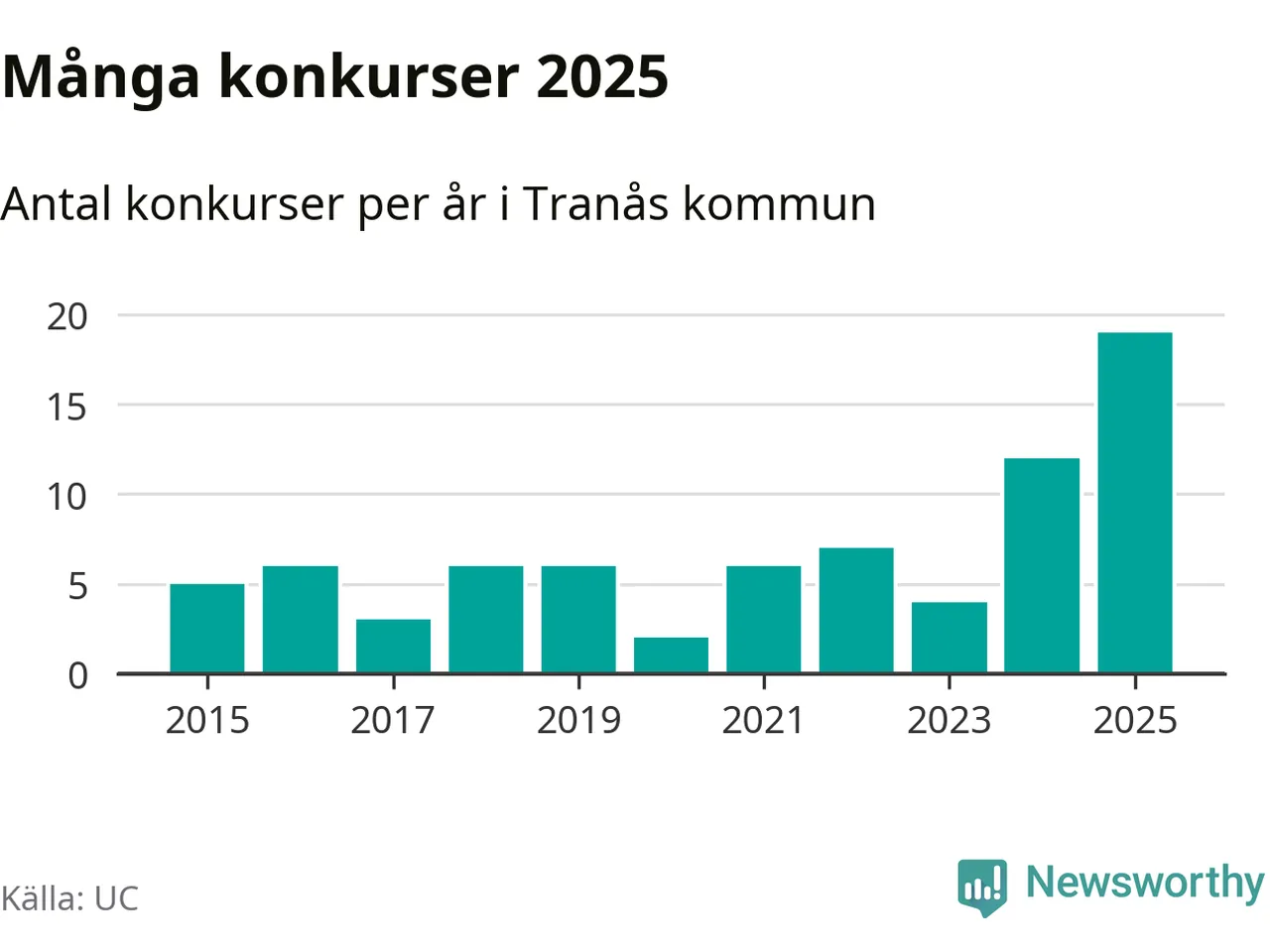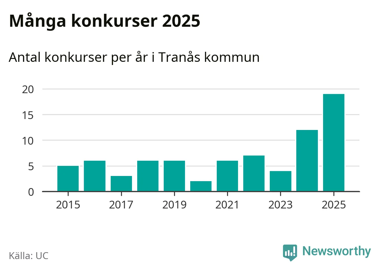 Under år 2025 gick sammanlagt 19 bolag med säte i Tranås kommun i konkurs. Det är det högsta antalet sedan åtminstone år 2015. Det visar ny statistik från UC.