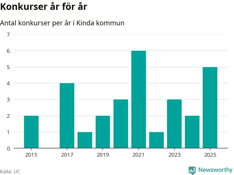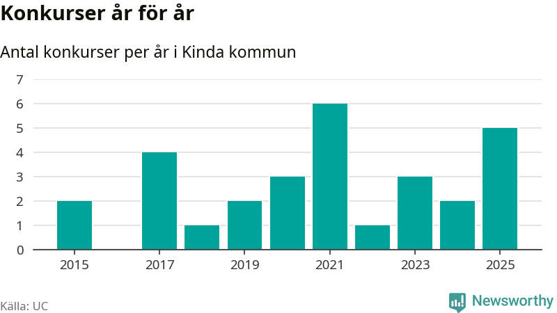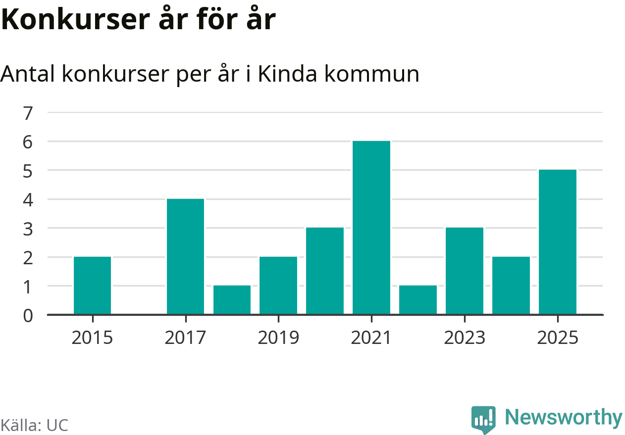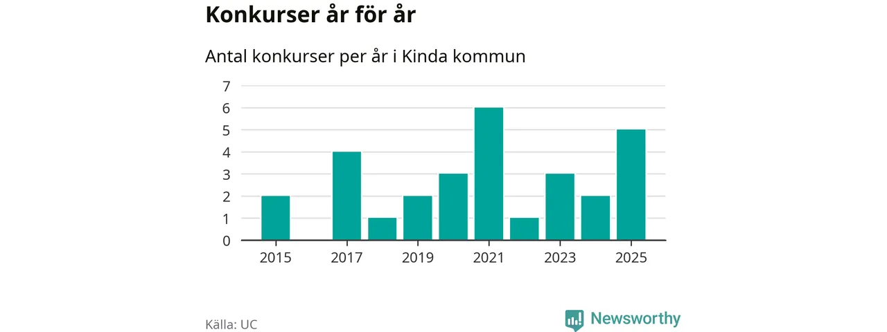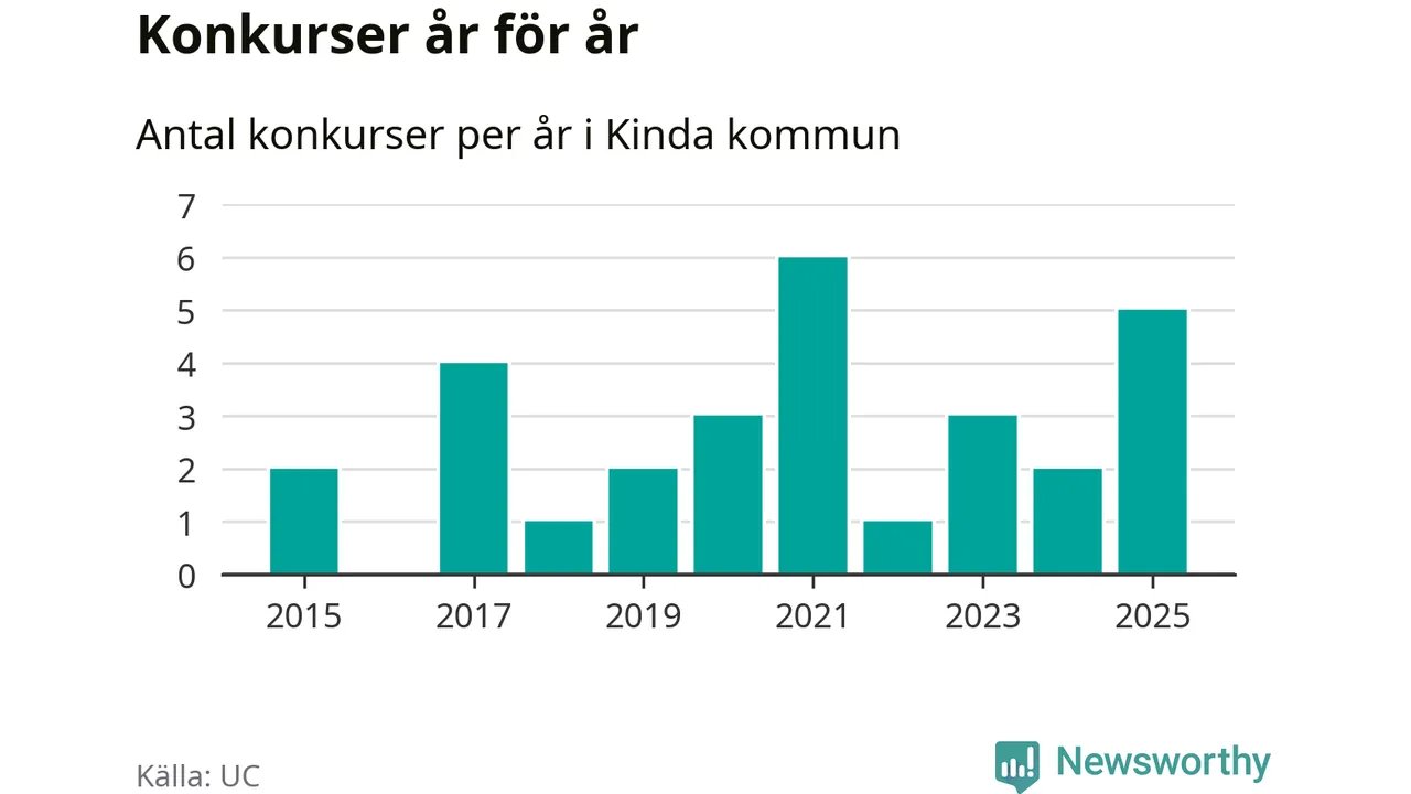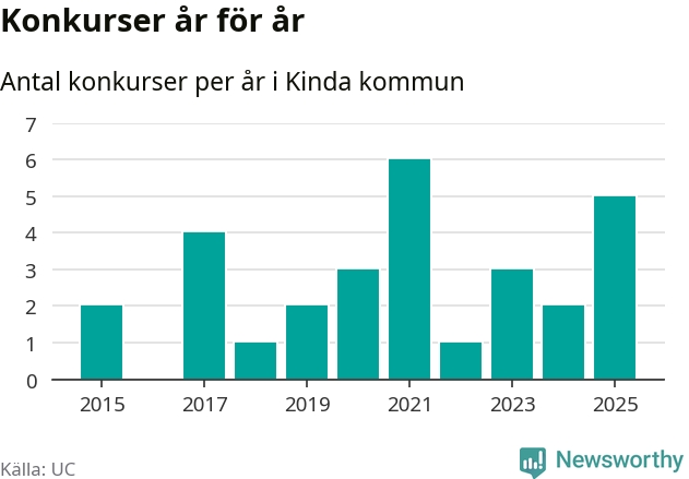 Under år 2025 gick sammanlagt fem bolag med säte i Kinda kommun i konkurs. Det är fler än året innan, men samtidigt färre än toppåret 2021 då sex bolag gick i konkurs. Det visar ny statistik från UC.