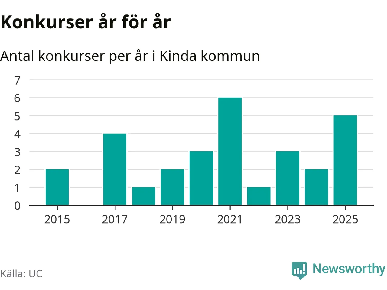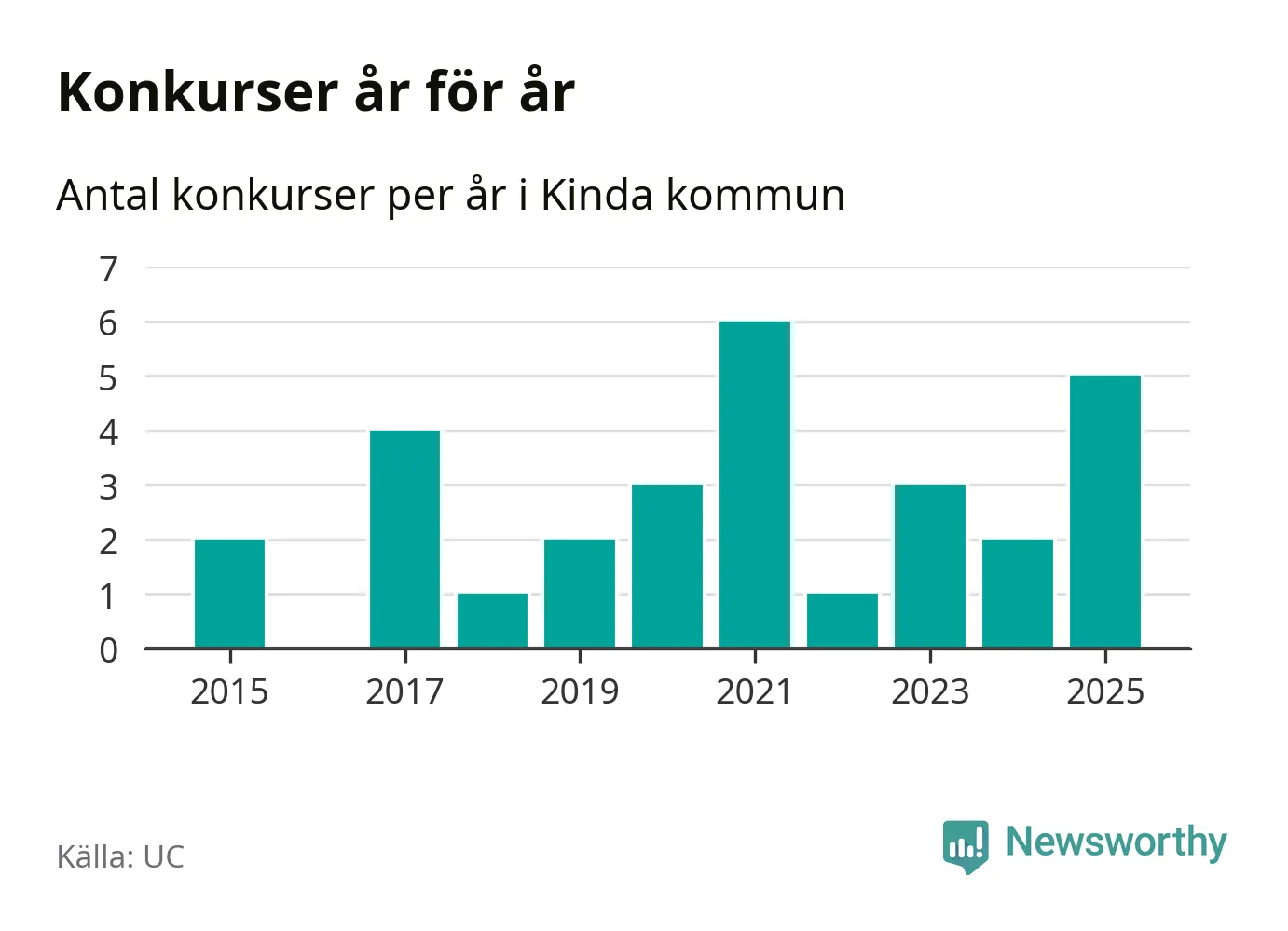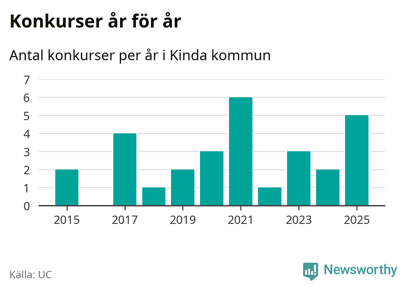 Under år 2025 gick sammanlagt fem bolag med säte i Kinda kommun i konkurs. Det är fler än året innan, men samtidigt färre än toppåret 2021 då sex bolag gick i konkurs. Det visar ny statistik från UC.
