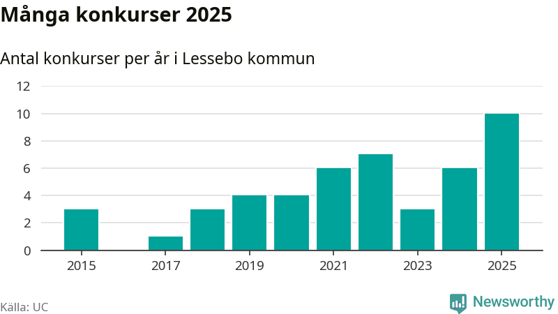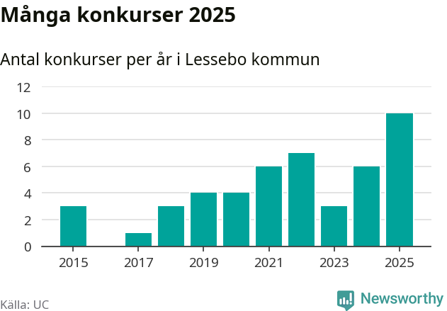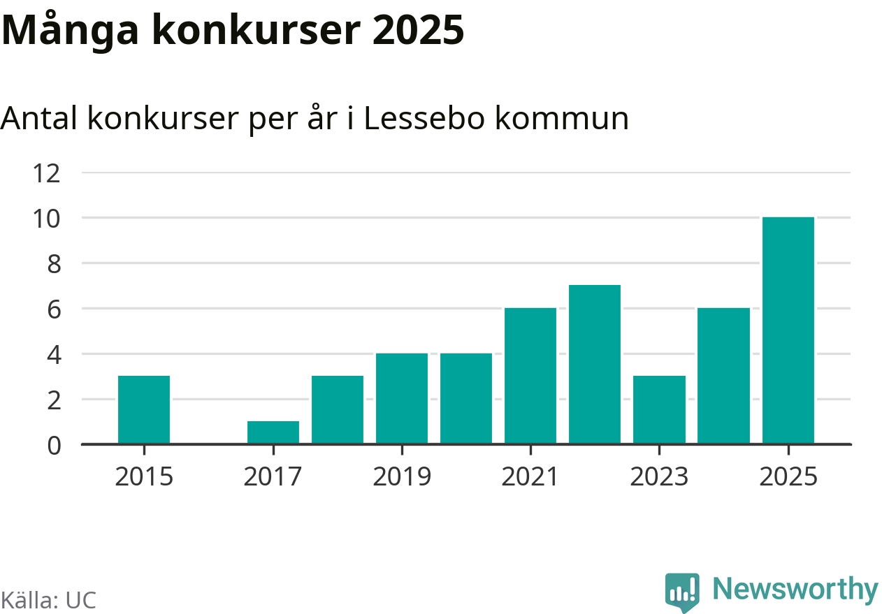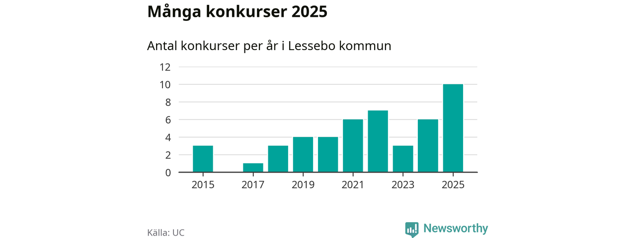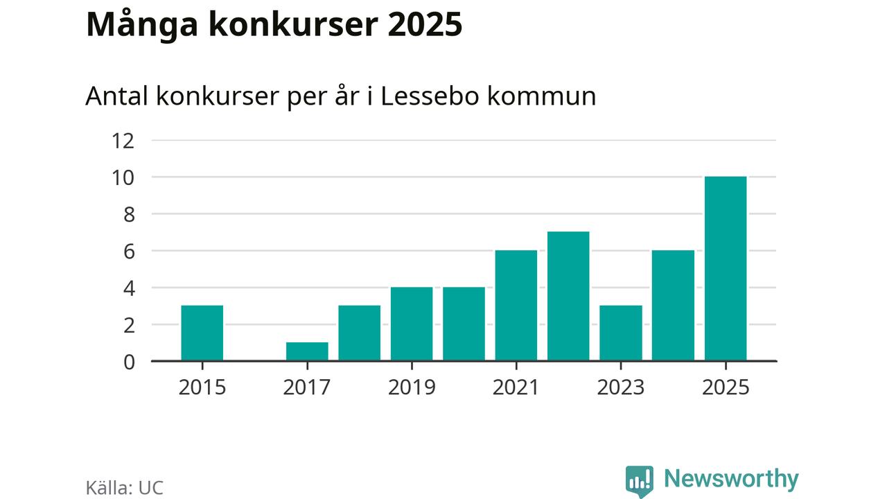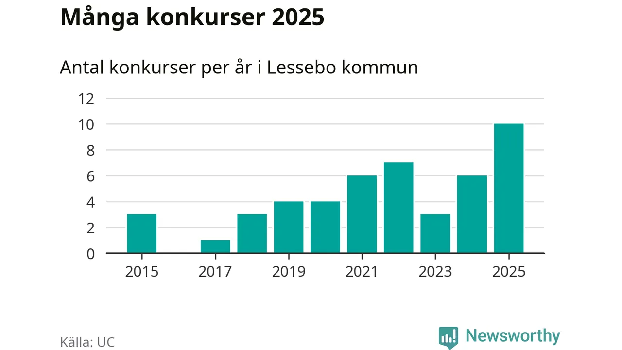 Under år 2025 gick sammanlagt tio bolag med säte i Lessebo kommun i konkurs. Det är det högsta antalet sedan åtminstone år 2015. Det visar ny statistik från UC.