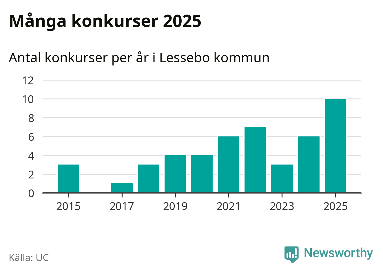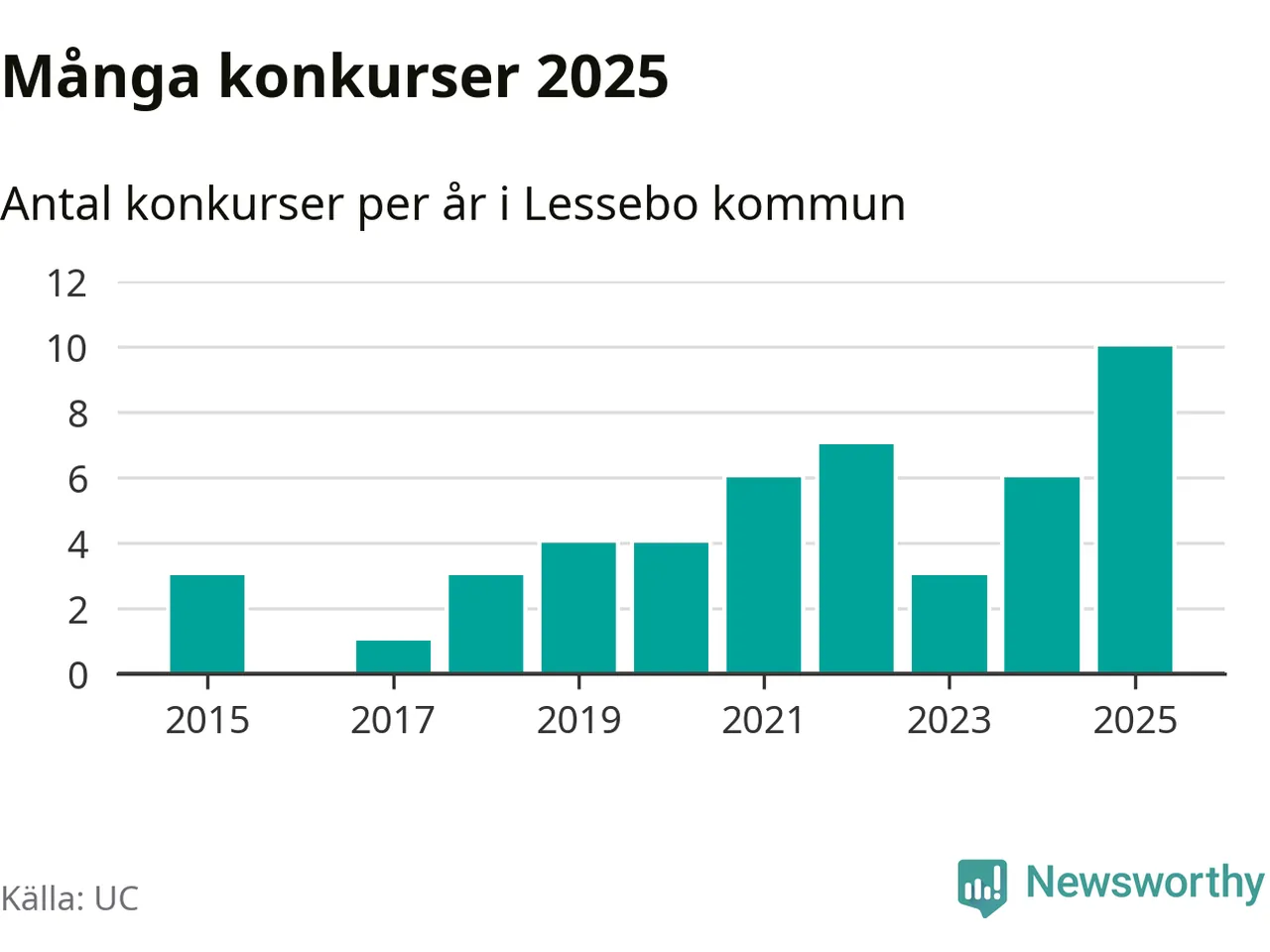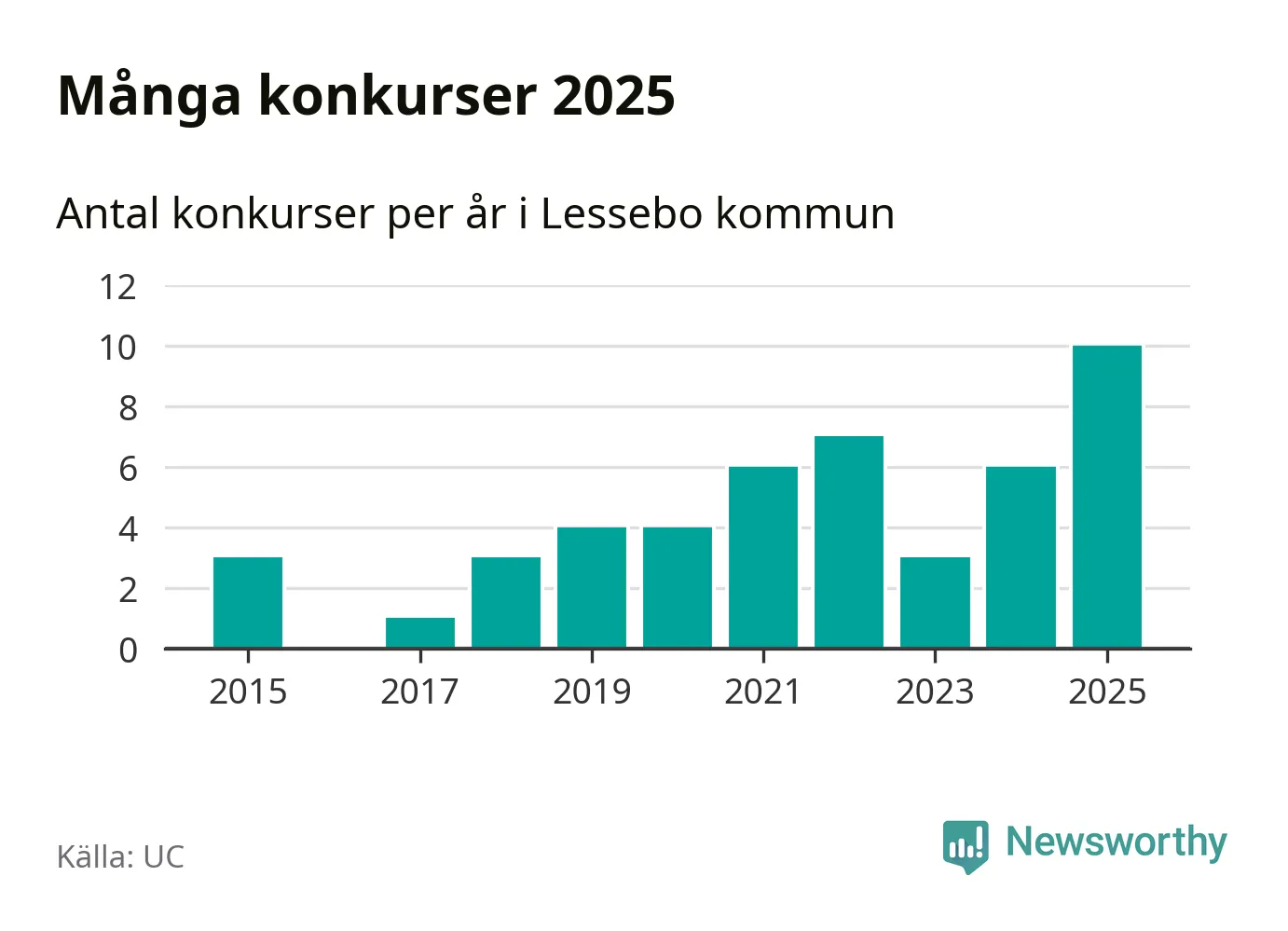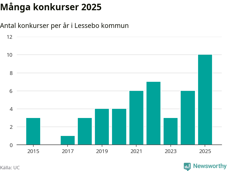 Under år 2025 gick sammanlagt tio bolag med säte i Lessebo kommun i konkurs. Det är det högsta antalet sedan åtminstone år 2015. Det visar ny statistik från UC.