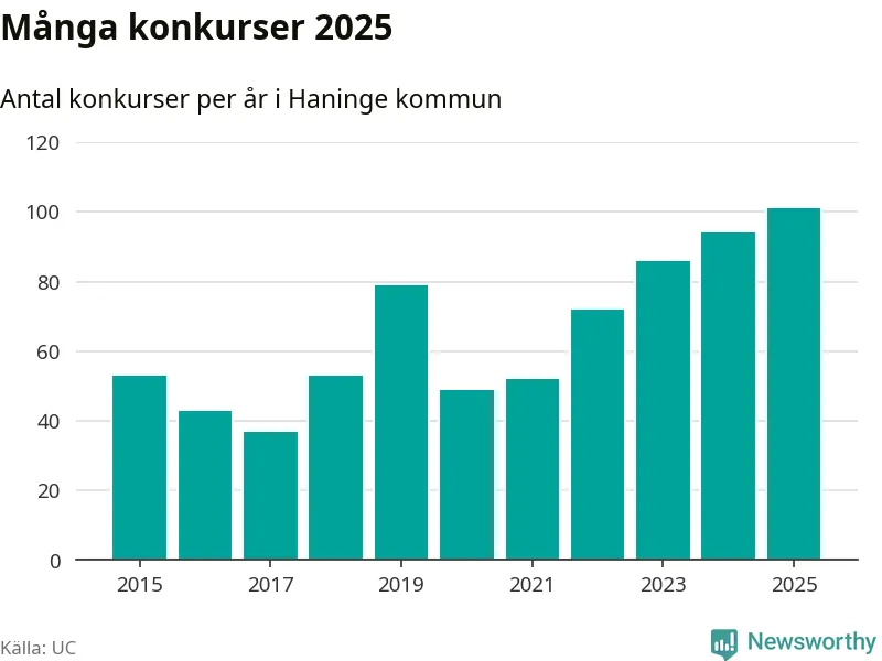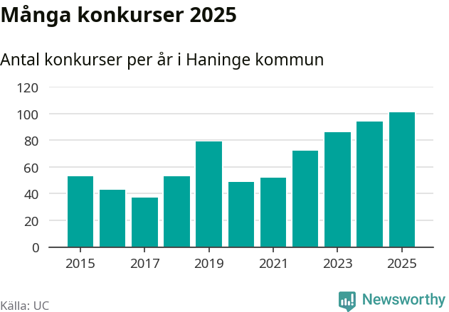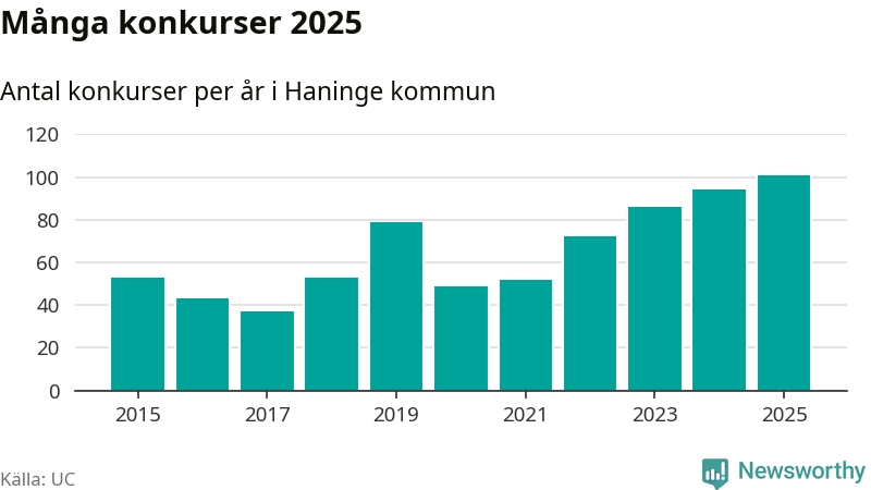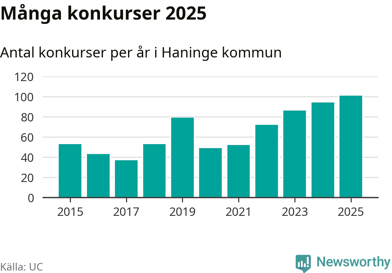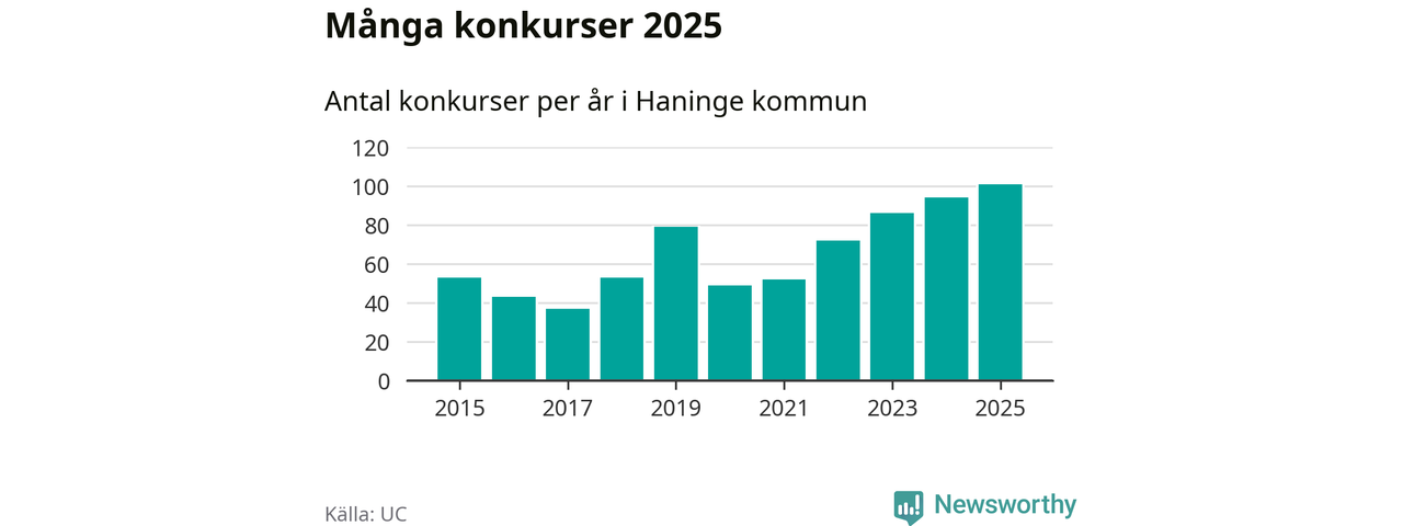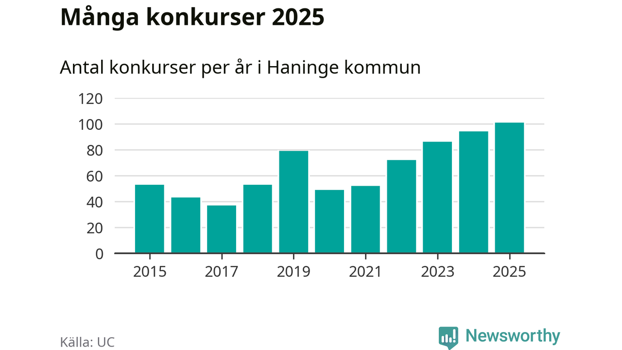 Under år 2025 gick sammanlagt 101 bolag med säte i Haninge kommun i konkurs. Det är det högsta antalet sedan åtminstone år 2015. Det visar ny statistik från UC.