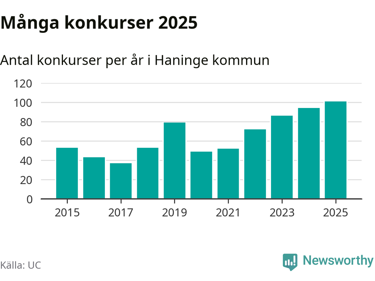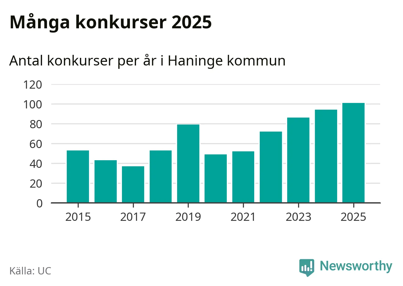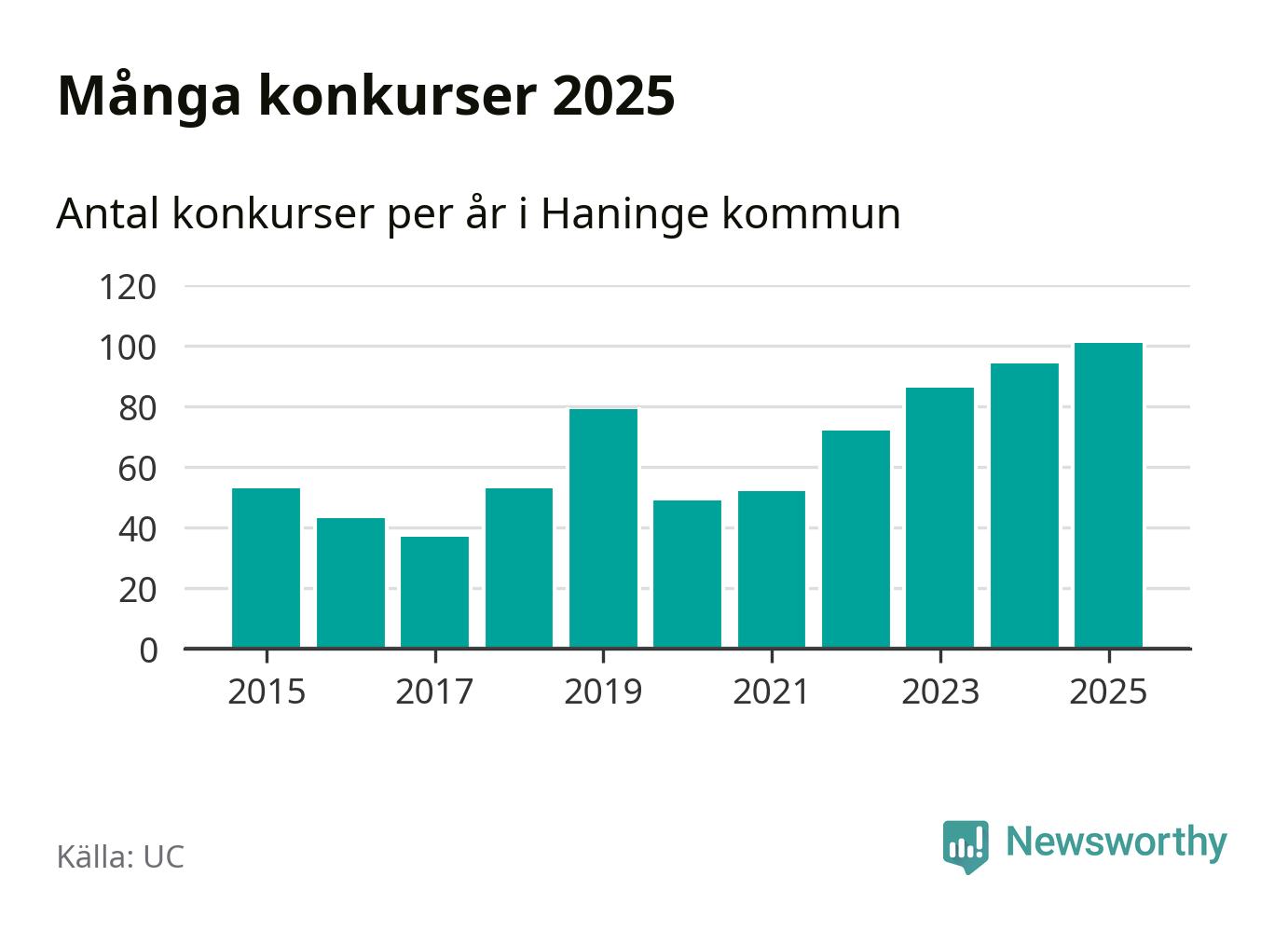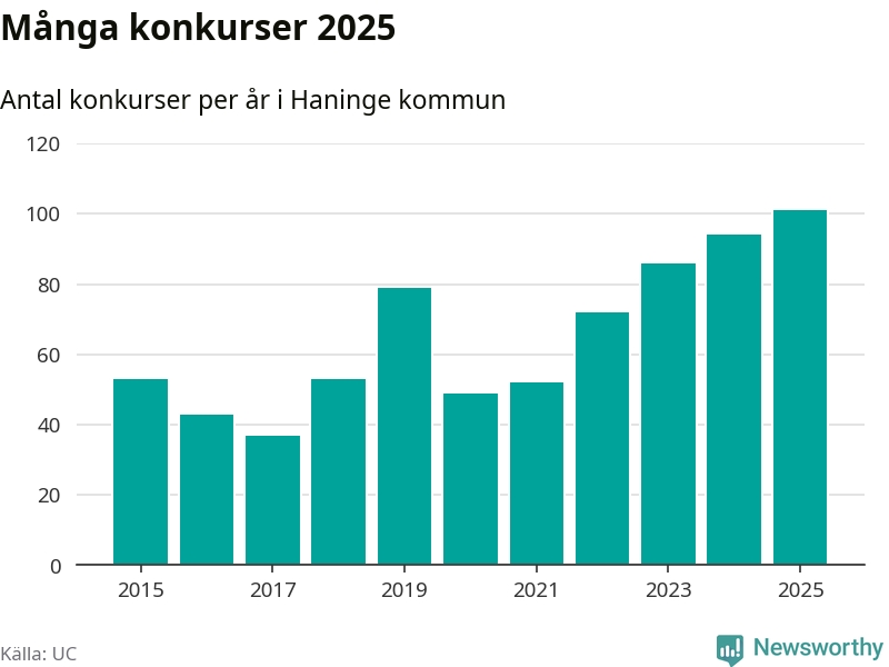 Under år 2025 gick sammanlagt 101 bolag med säte i Haninge kommun i konkurs. Det är det högsta antalet sedan åtminstone år 2015. Det visar ny statistik från UC.