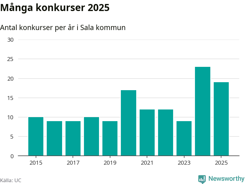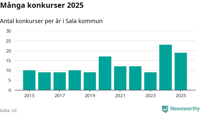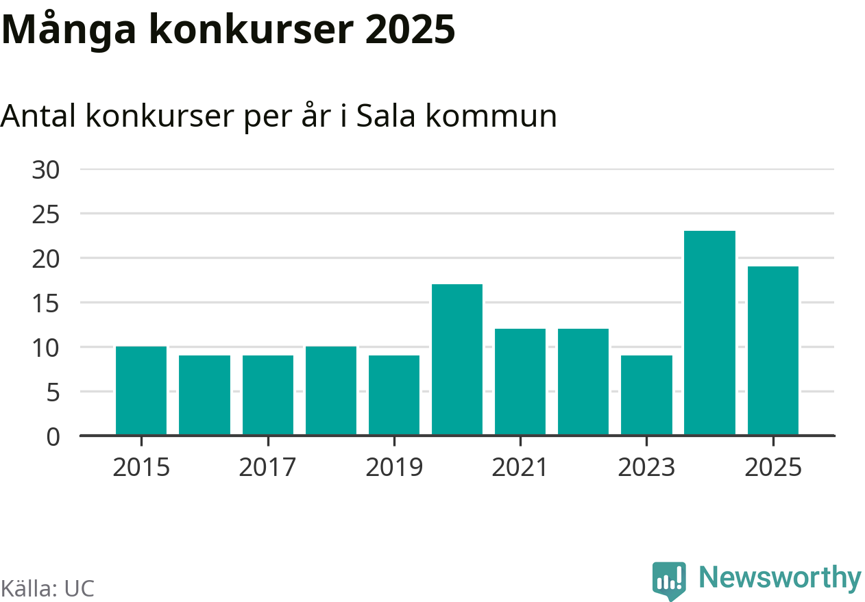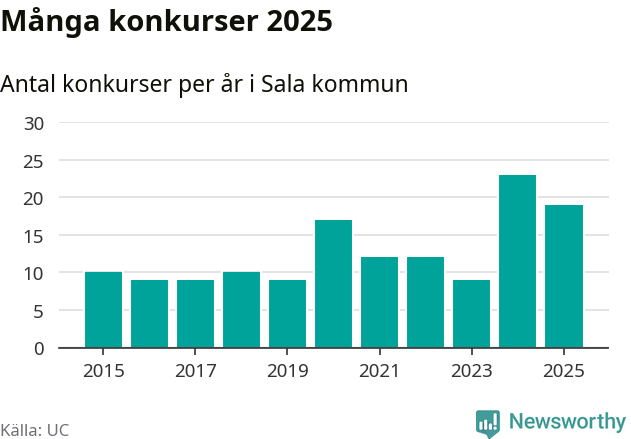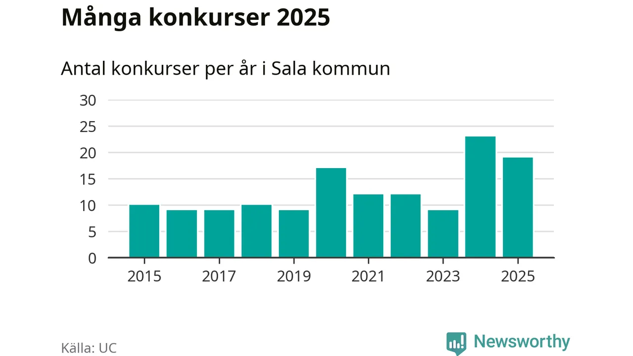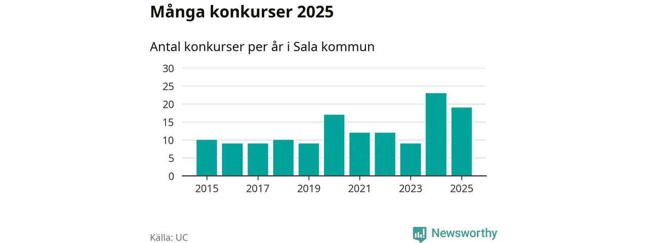 Under år 2025 gick sammanlagt 19 bolag med säte i Sala kommun i konkurs. Det är fyra färre än året innan då 23 bolag gick i konkurs. Toppåret, sedan 2015, var just 2024 sett till antalet konkursföretag. Det visar ny statistik från UC.