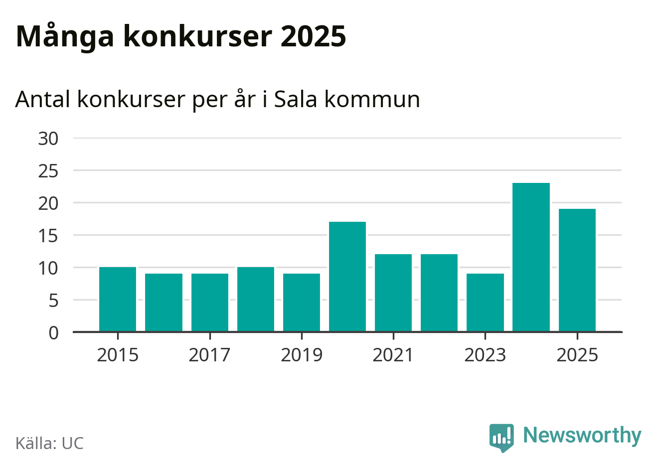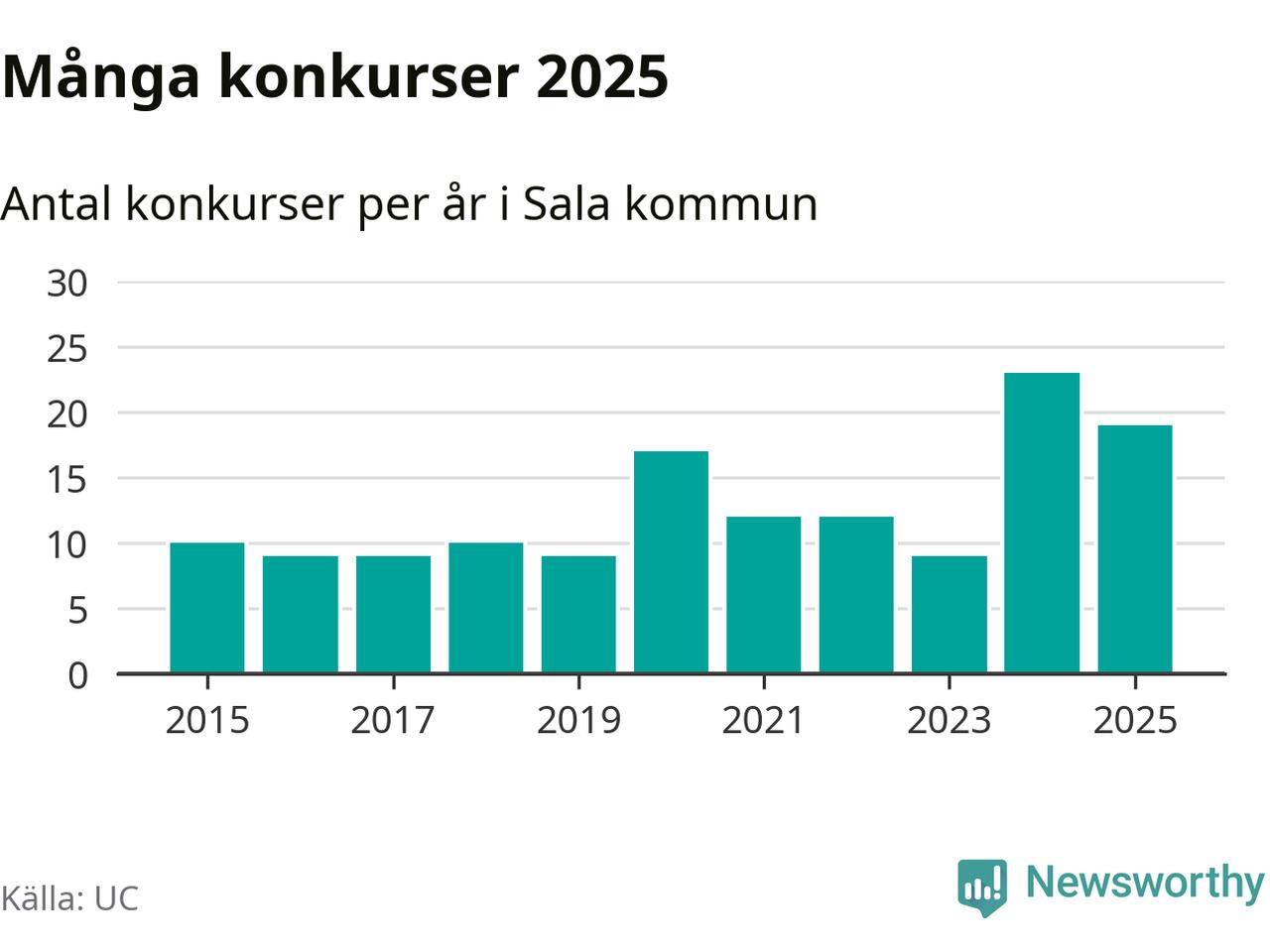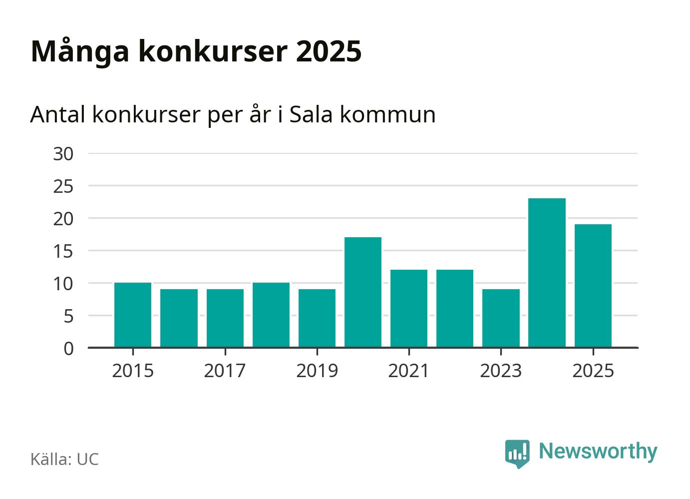 Under år 2025 gick sammanlagt 19 bolag med säte i Sala kommun i konkurs. Det är fyra färre än året innan då 23 bolag gick i konkurs. Toppåret, sedan 2015, var just 2024 sett till antalet konkursföretag. Det visar ny statistik från UC.