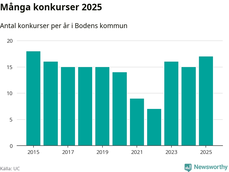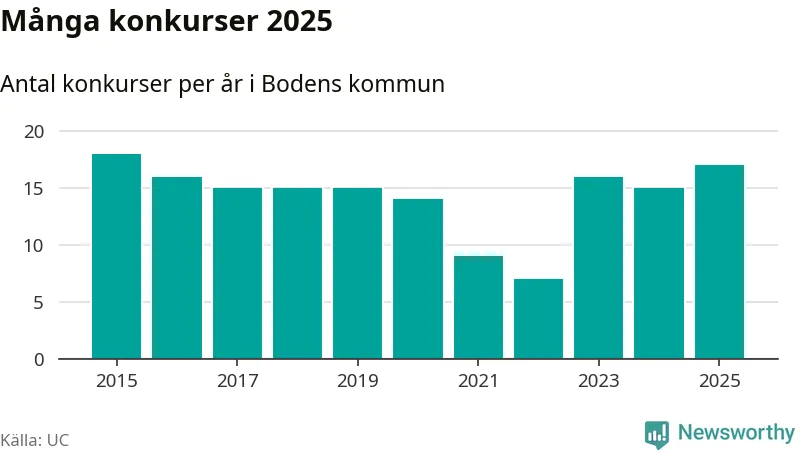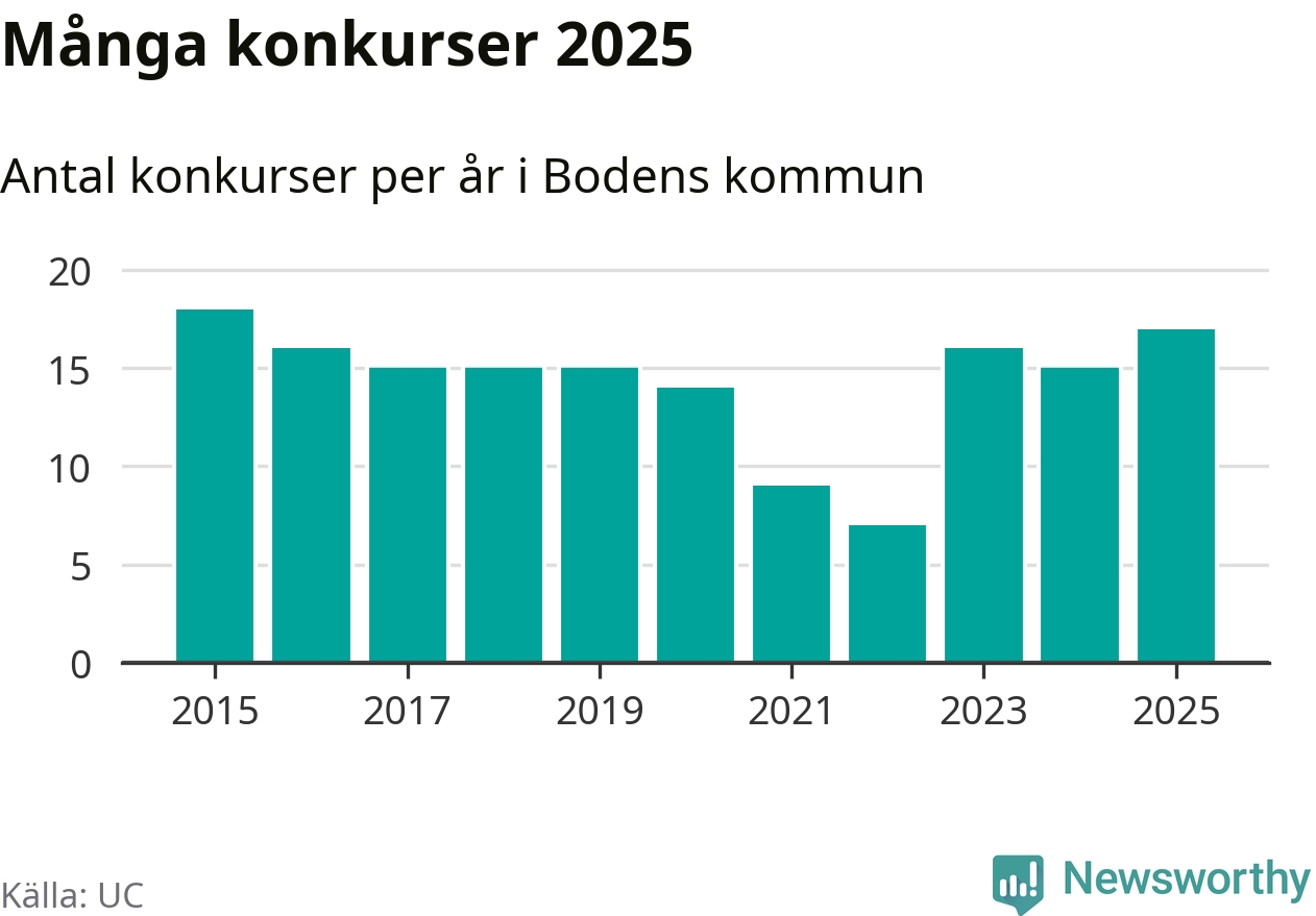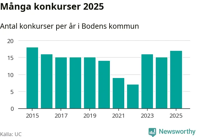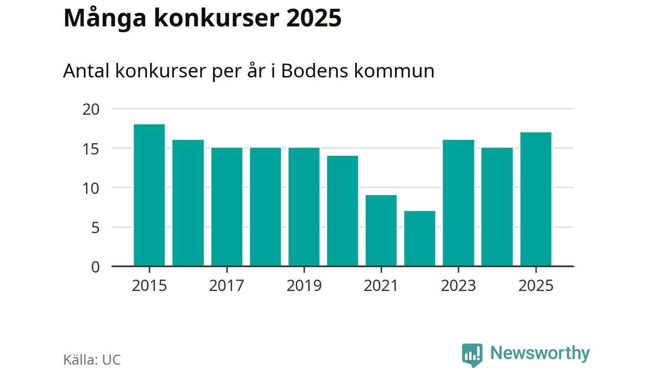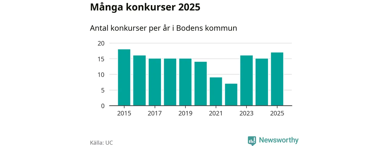 Under år 2025 gick sammanlagt 17 bolag med säte i Bodens kommun i konkurs. Det är det högsta antalet sedan år 2015. Det visar ny statistik från UC.
