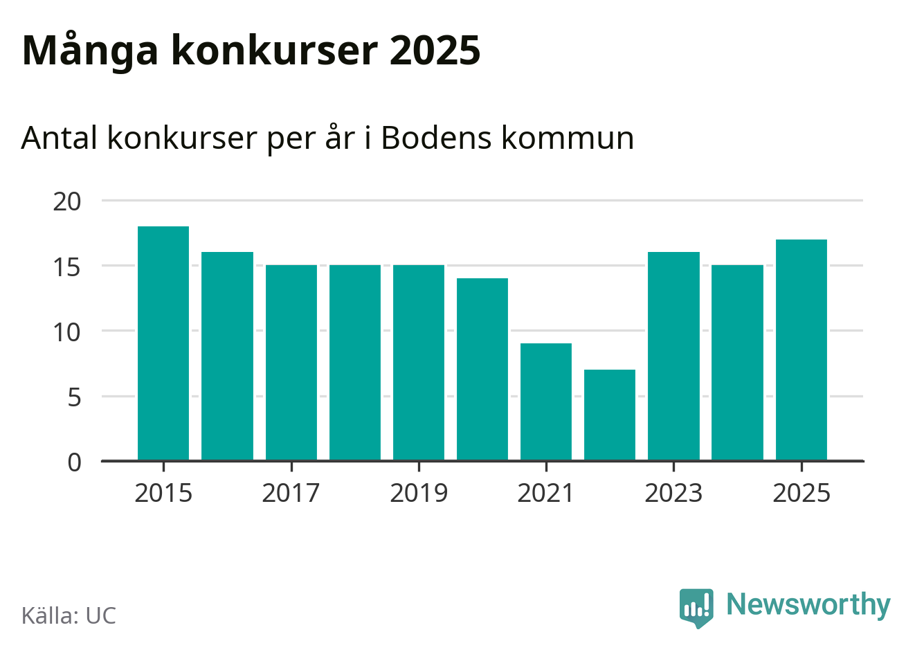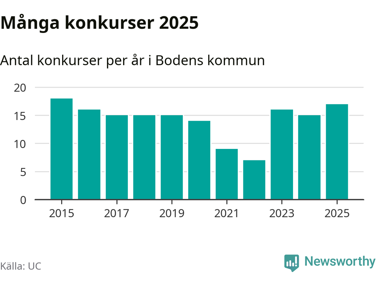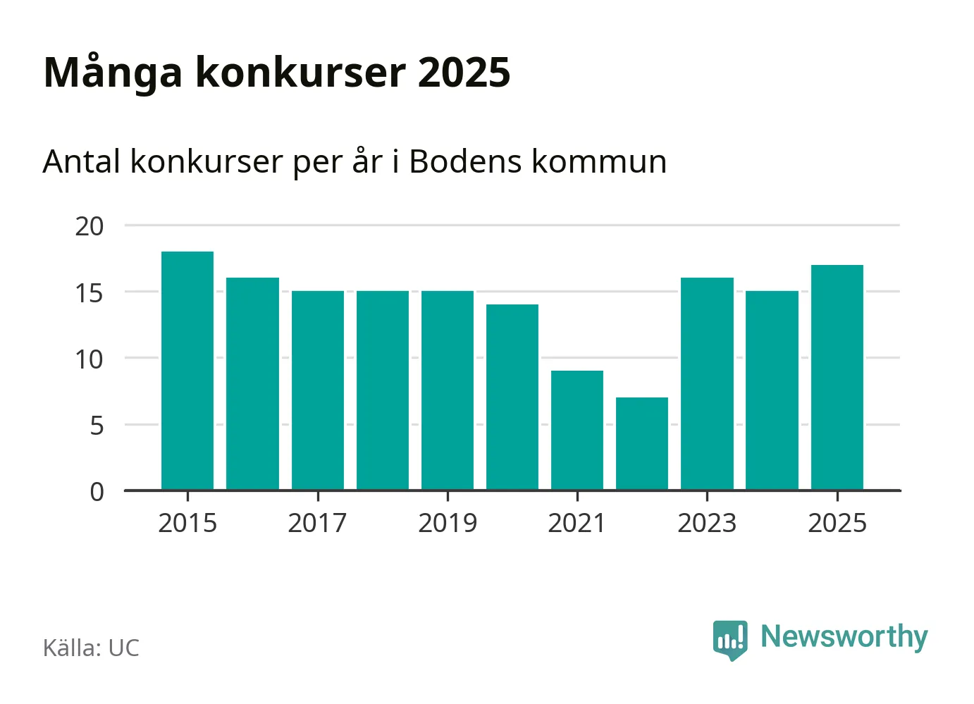 Under år 2025 gick sammanlagt 17 bolag med säte i Bodens kommun i konkurs. Det är det högsta antalet sedan år 2015. Det visar ny statistik från UC.