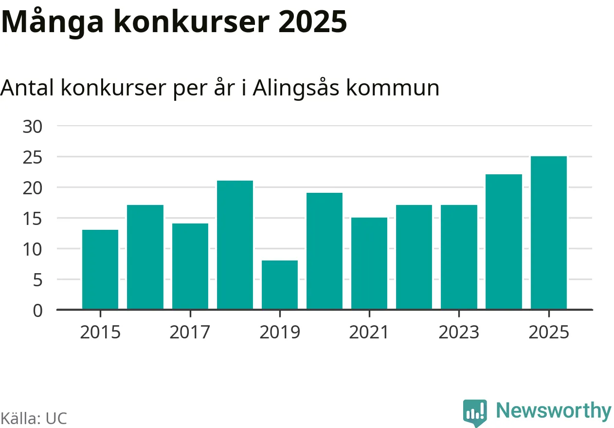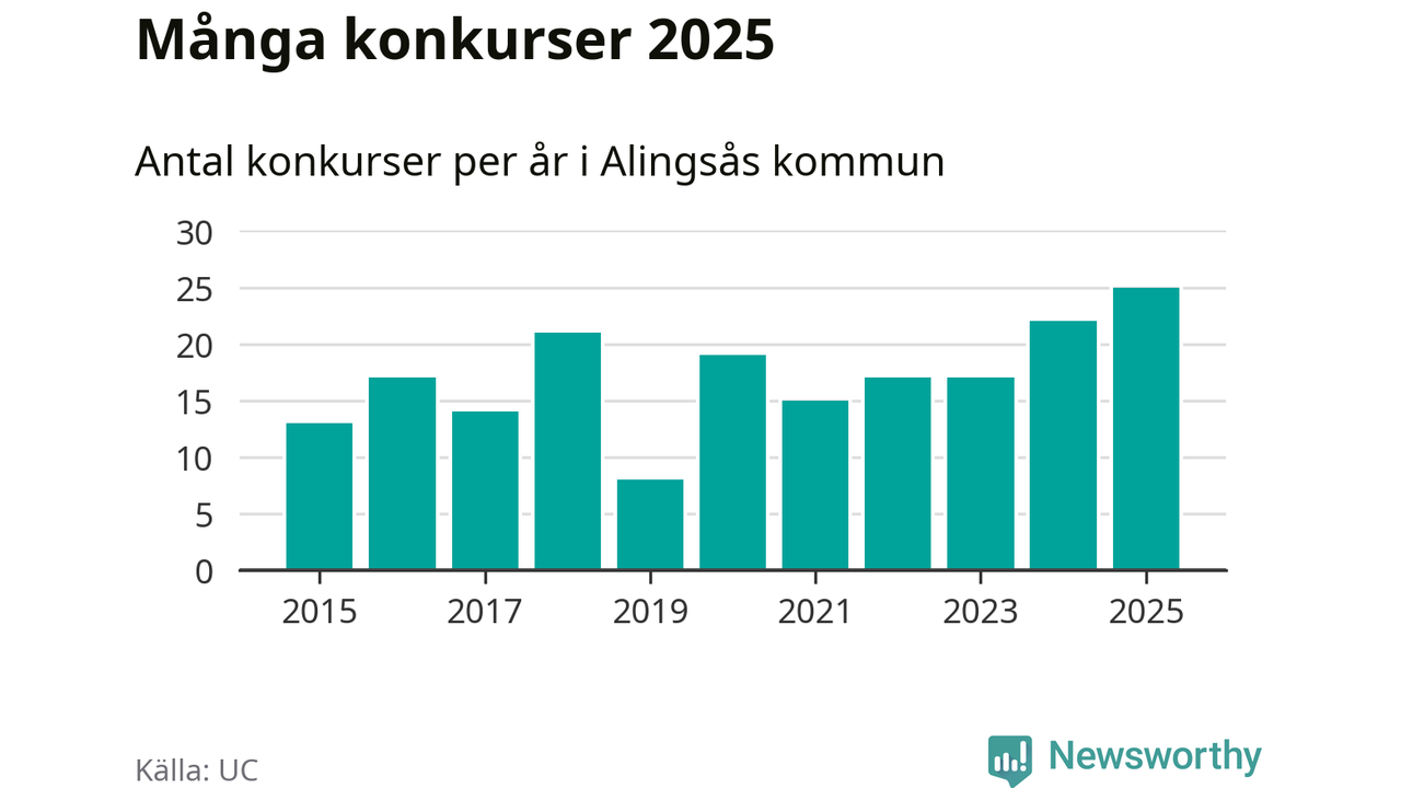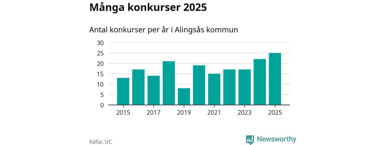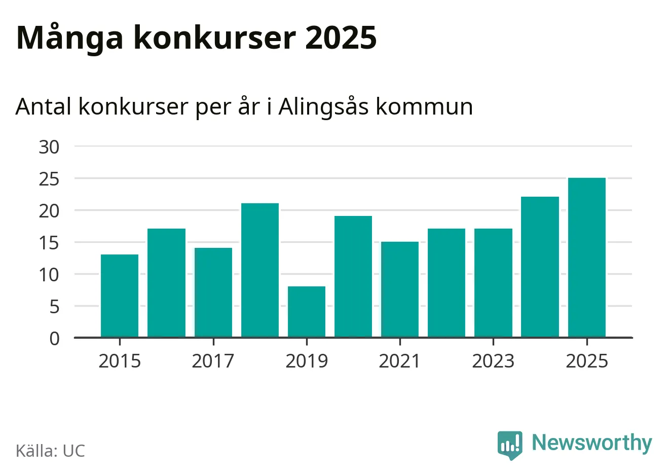 Under år 2025 gick sammanlagt 25 bolag med säte i Alingsås kommun i konkurs. Det är det högsta antalet sedan åtminstone år 2015. Det visar ny statistik från UC.
