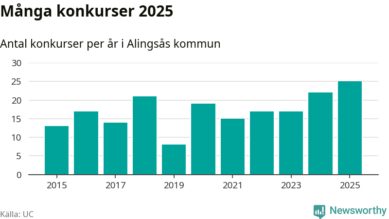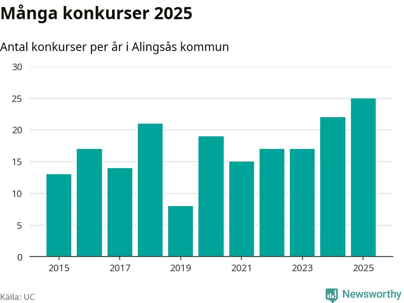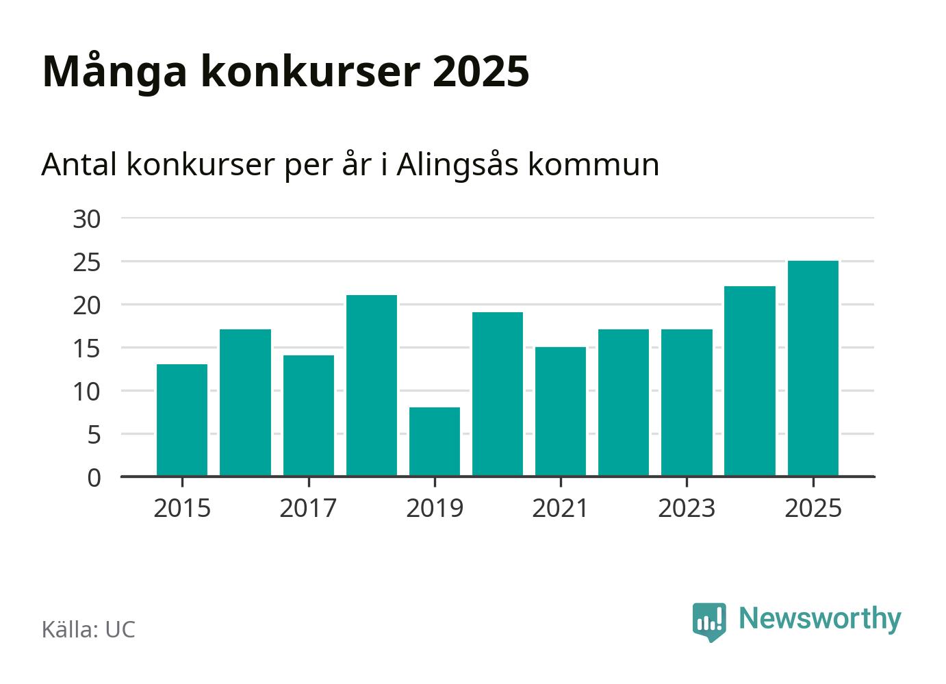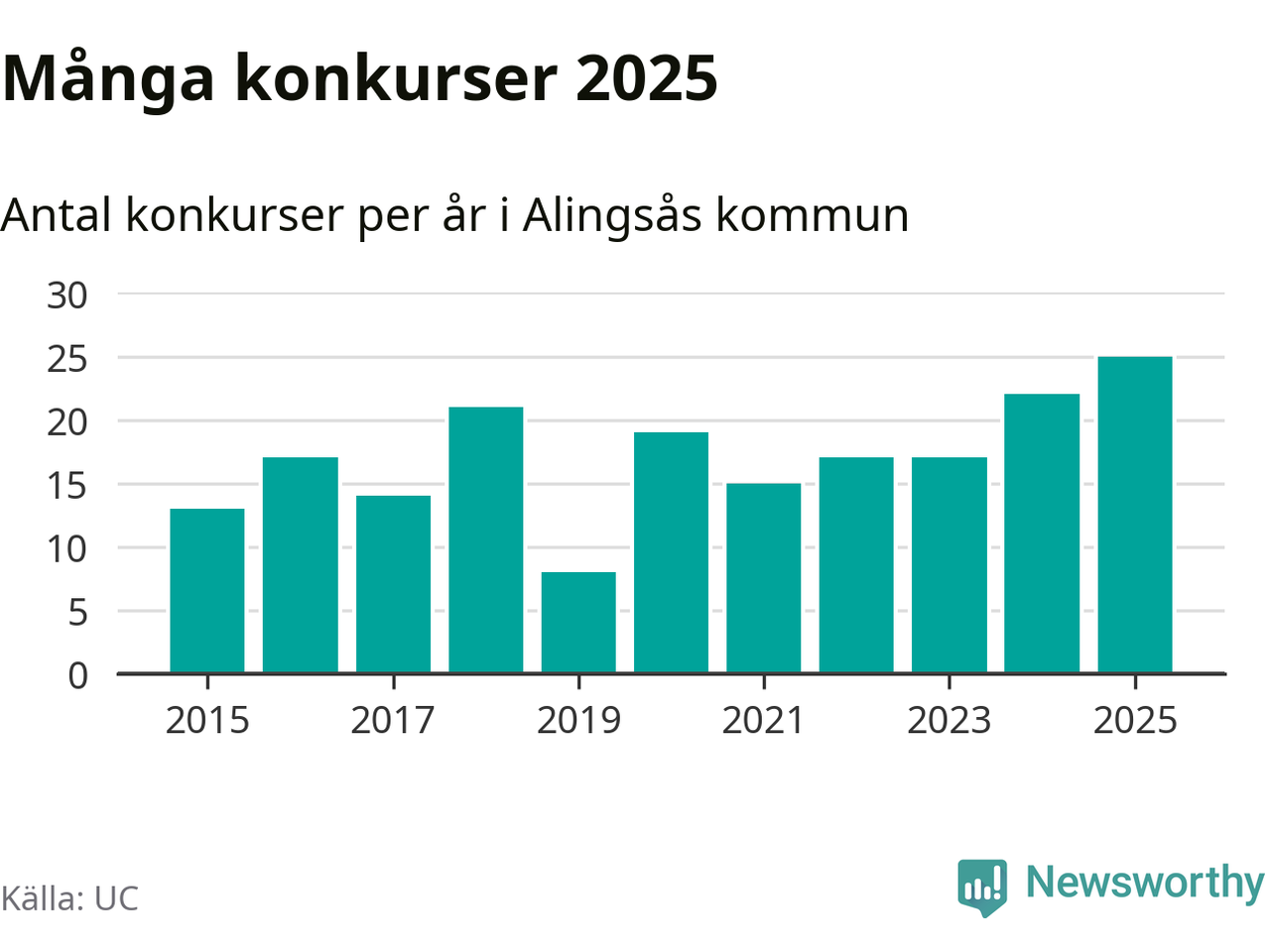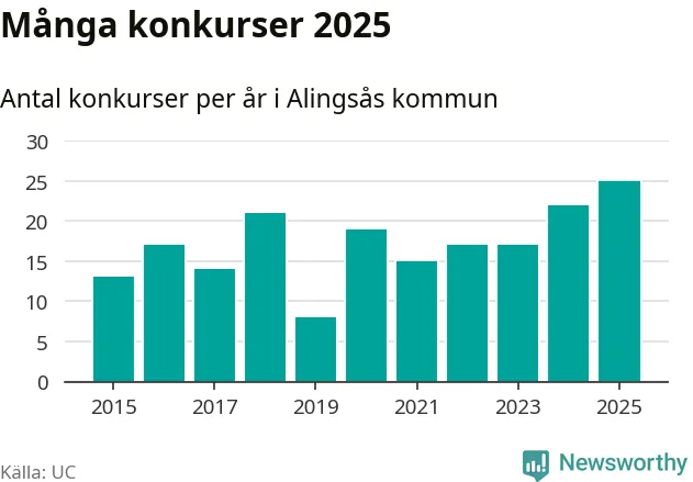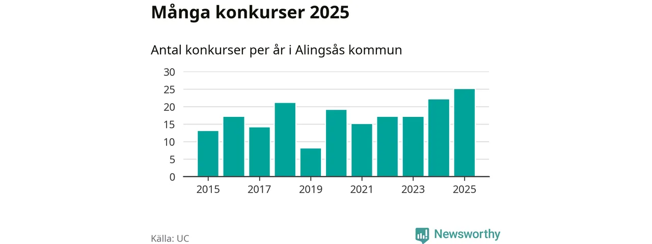 Under år 2025 gick sammanlagt 25 bolag med säte i Alingsås kommun i konkurs. Det är det högsta antalet sedan åtminstone år 2015. Det visar ny statistik från UC.