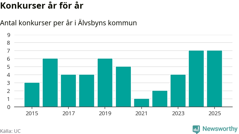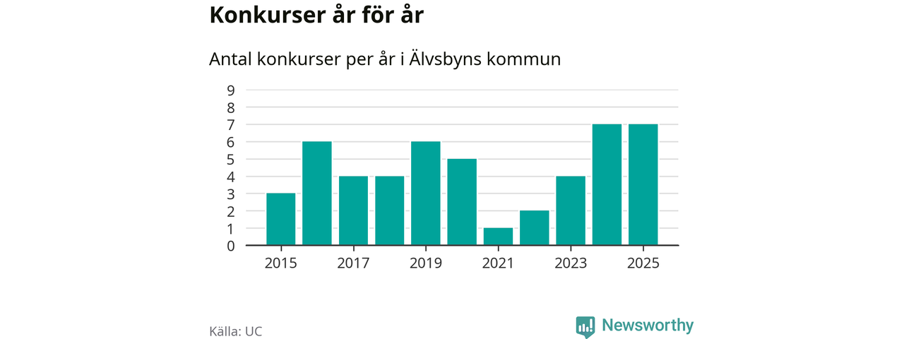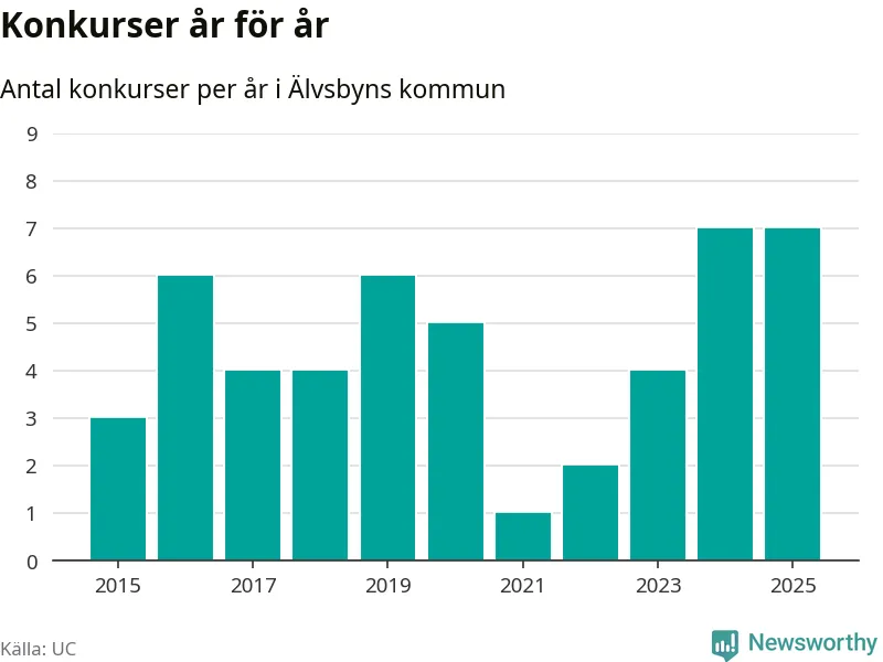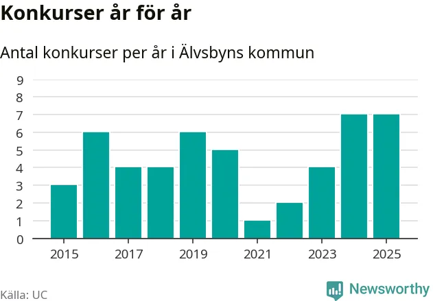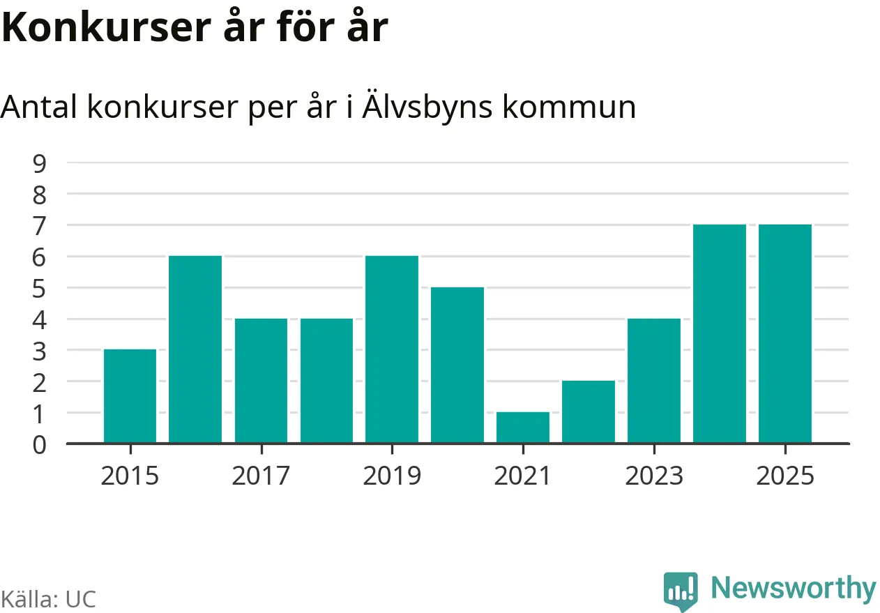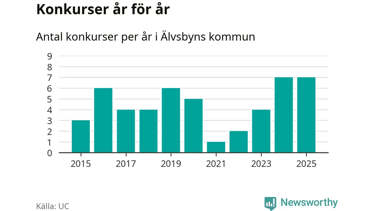 Under år 2025 gick sammanlagt sju bolag med säte i Älvsbyns kommun i konkurs. Det är, tillsammans med 2024, det högsta antalet sedan åtminstone år 2015. Det visar ny statistik från UC.