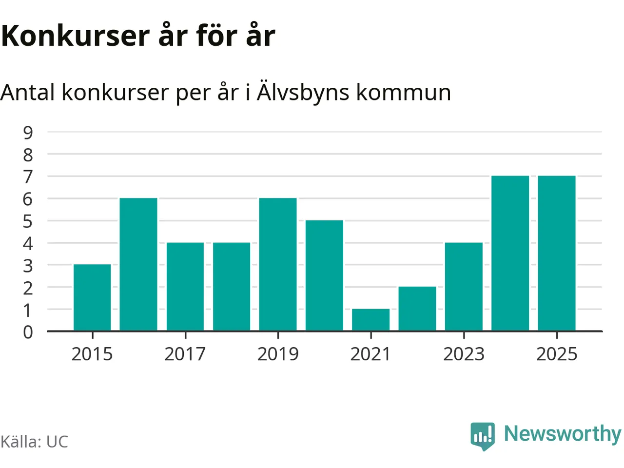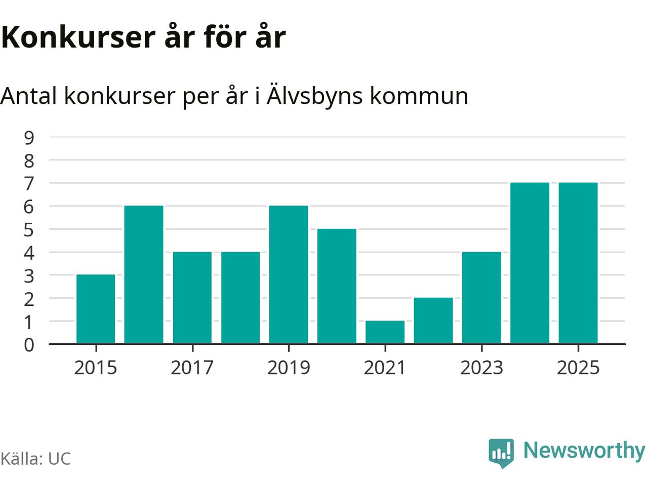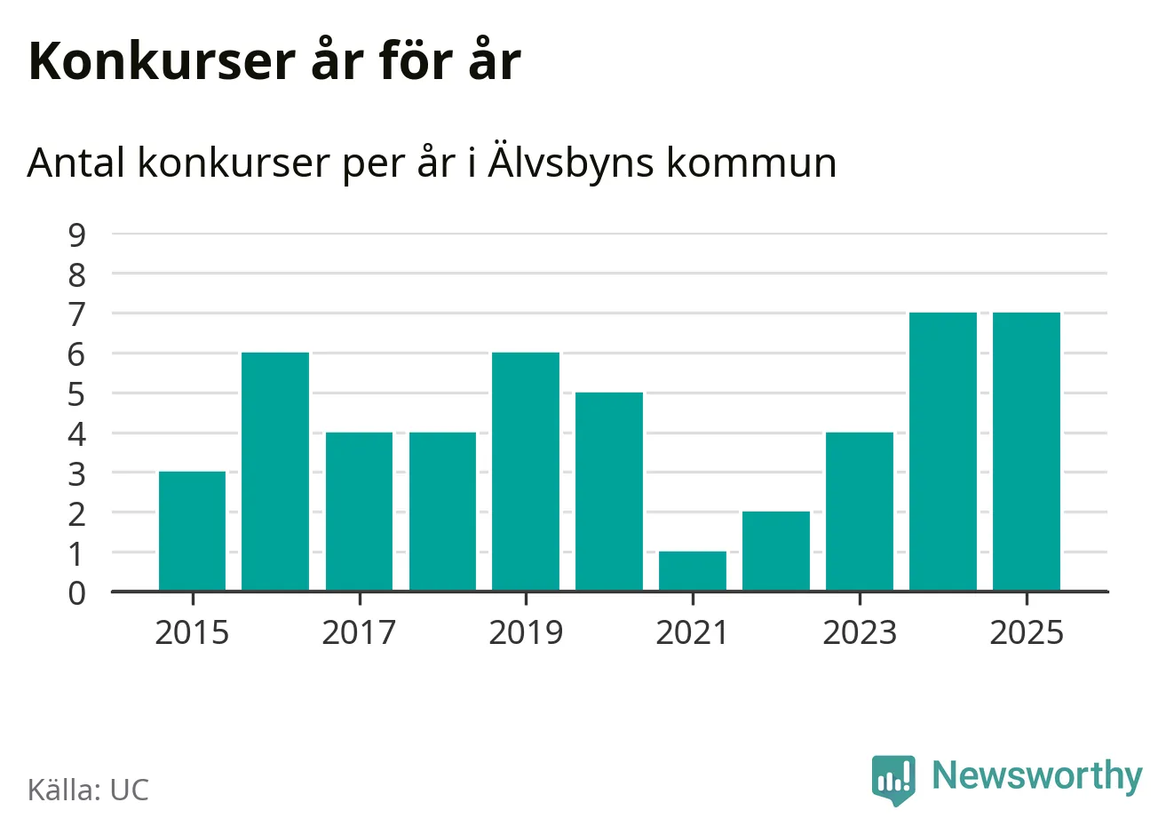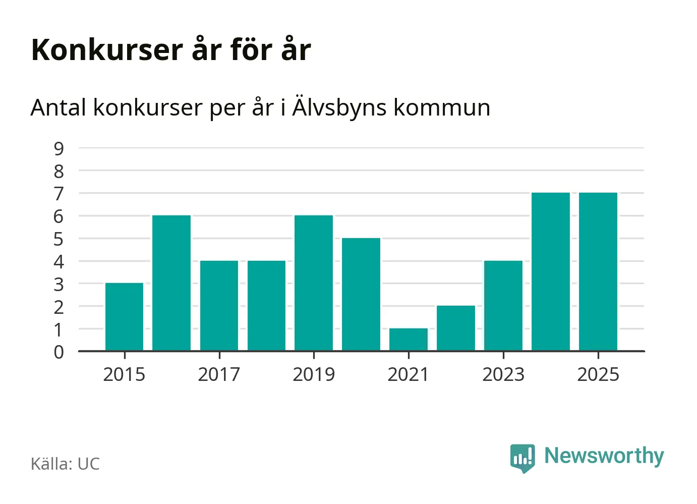 Under år 2025 gick sammanlagt sju bolag med säte i Älvsbyns kommun i konkurs. Det är, tillsammans med 2024, det högsta antalet sedan åtminstone år 2015. Det visar ny statistik från UC.