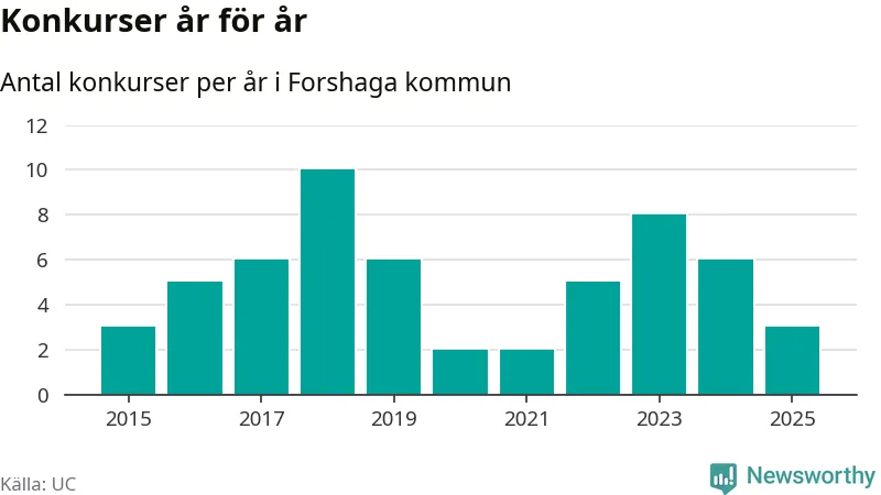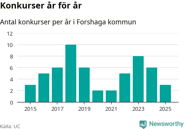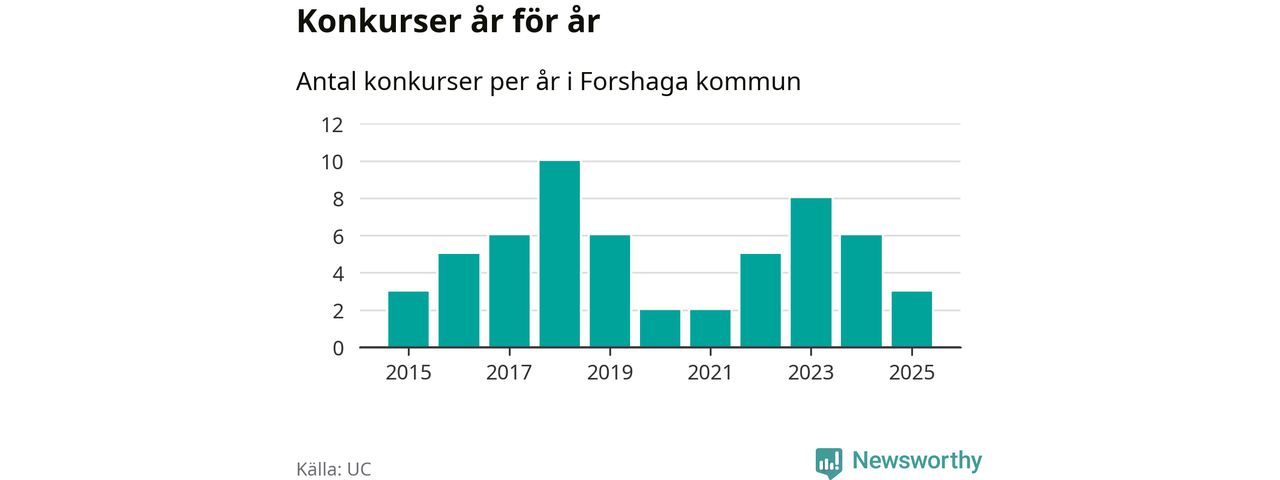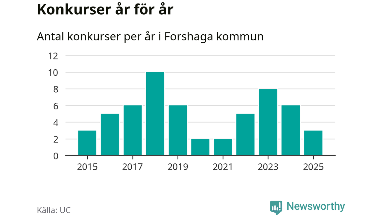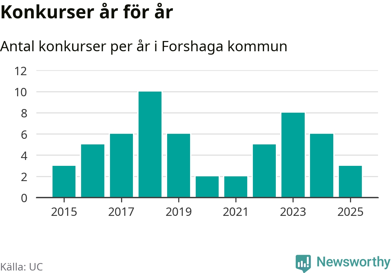 Under år 2025 gick sammanlagt tre bolag med säte i Forshaga kommun i konkurs. Det är tre färre än året innan då sex bolag gick i konkurs och andra året i följd som konkurserna minskar. Toppåret, sedan 2015, var 2018 då tio bolag gick i konkurs. Det visar ny statistik från UC.