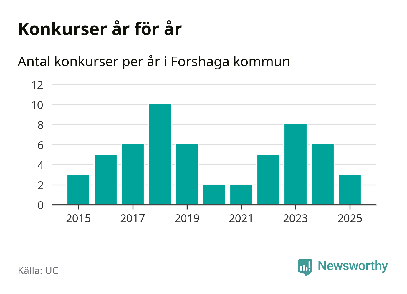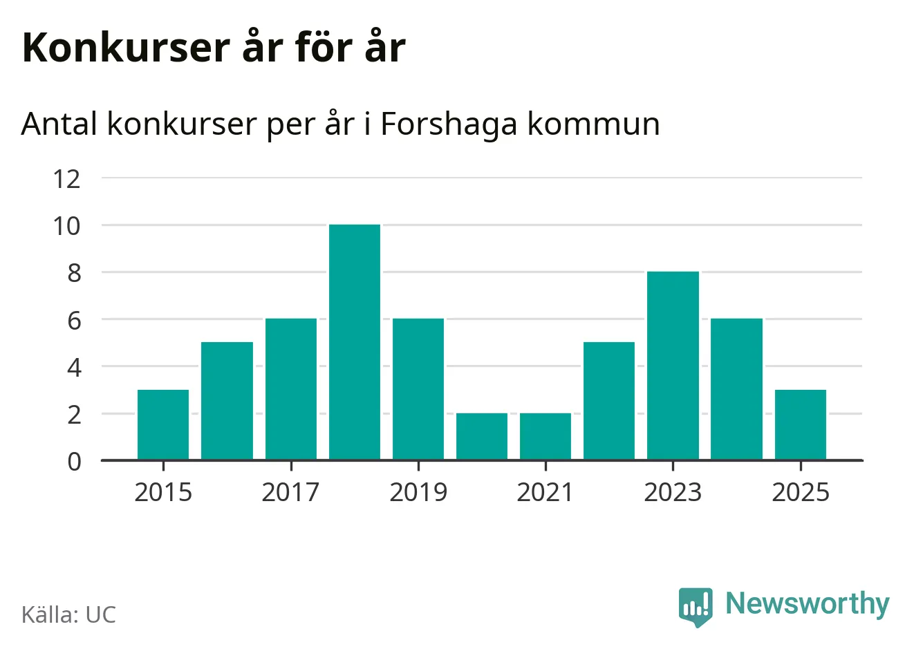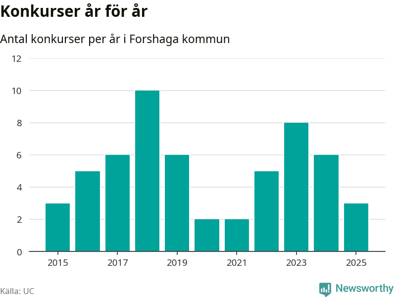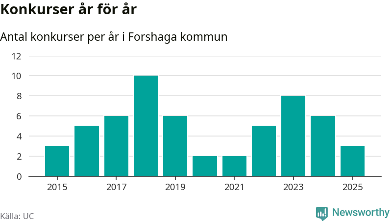 Under år 2025 gick sammanlagt tre bolag med säte i Forshaga kommun i konkurs. Det är tre färre än året innan då sex bolag gick i konkurs och andra året i följd som konkurserna minskar. Toppåret, sedan 2015, var 2018 då tio bolag gick i konkurs. Det visar ny statistik från UC.