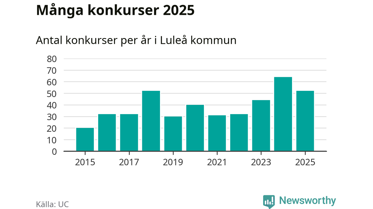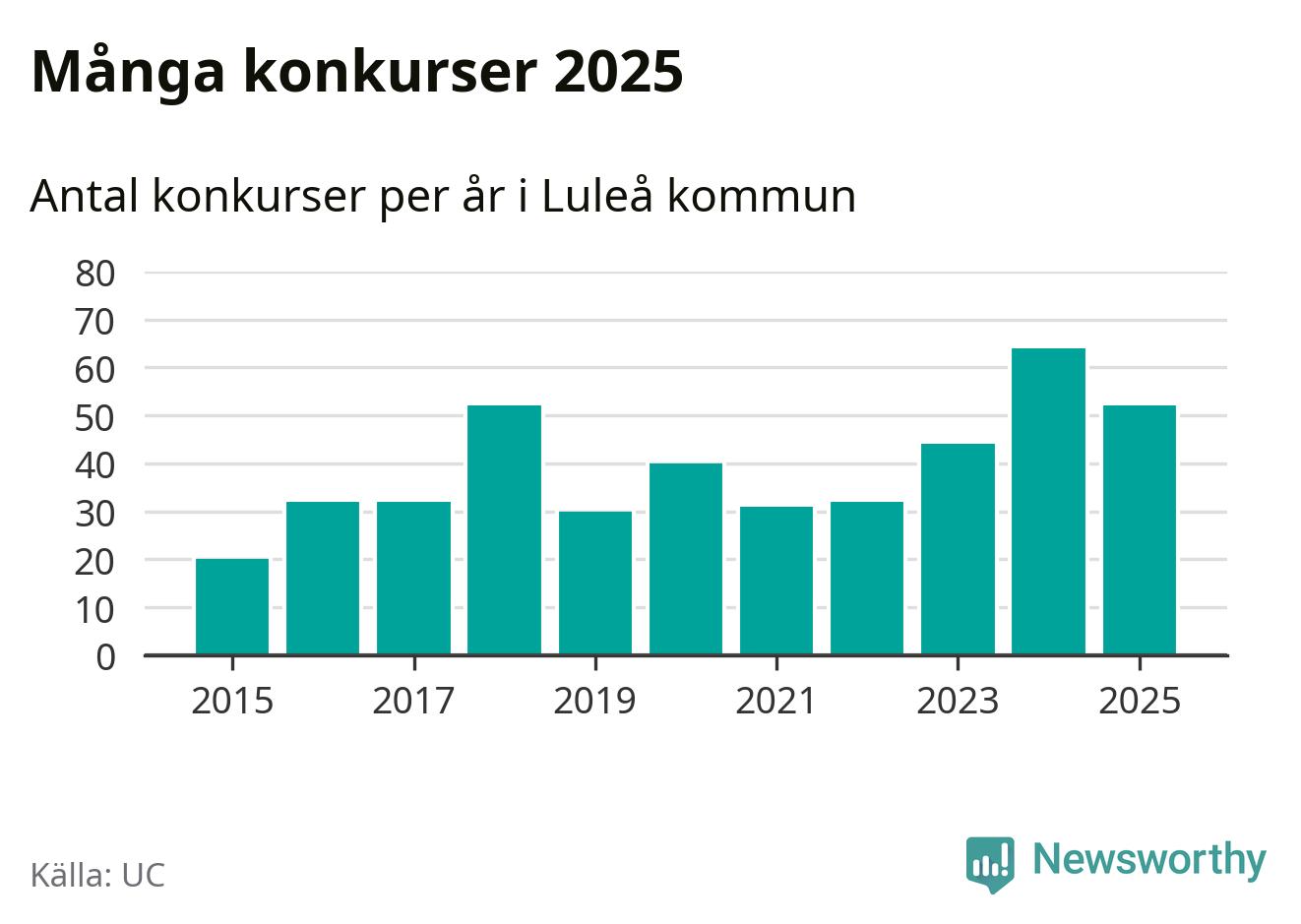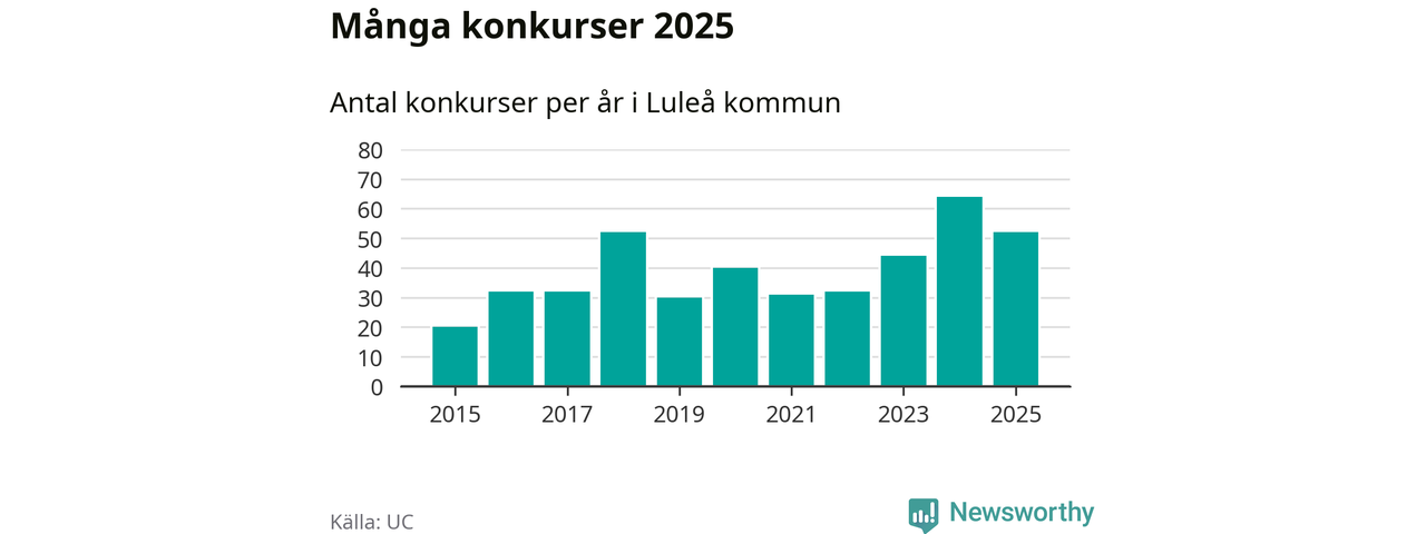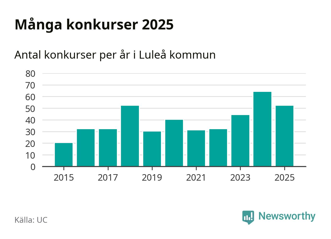Under år 2025 gick sammanlagt 52 bolag med säte i Luleå kommun i konkurs. Det är tolv färre än året innan då 64 bolag gick i konkurs. Toppåret, sedan 2015, var just 2024 sett till antalet konkursföretag. Det visar ny statistik från UC.