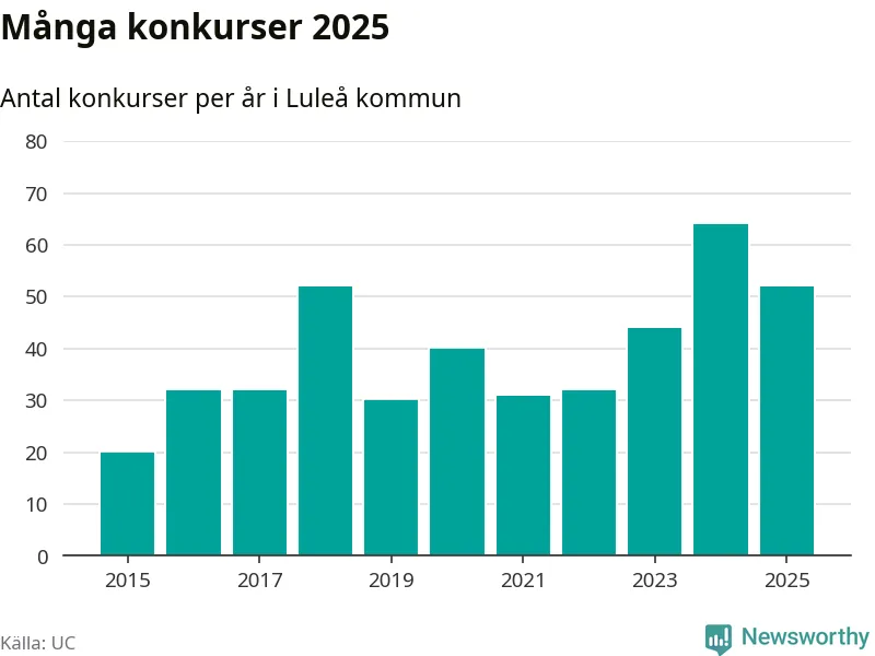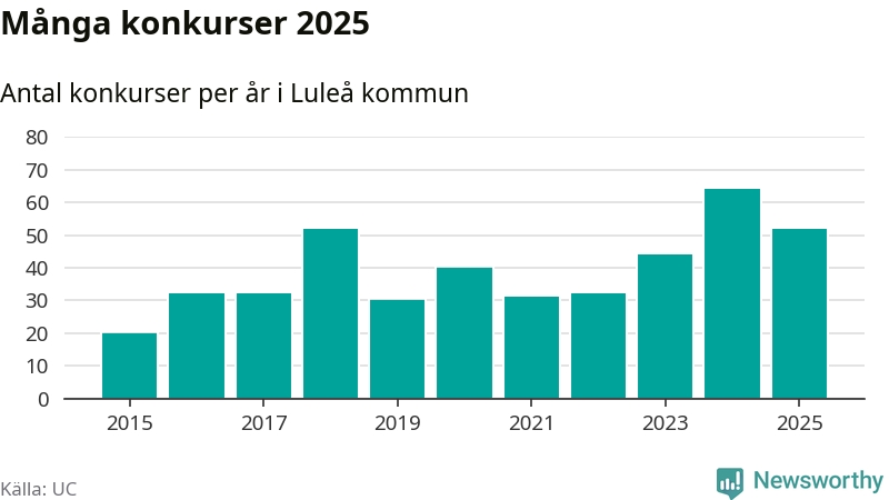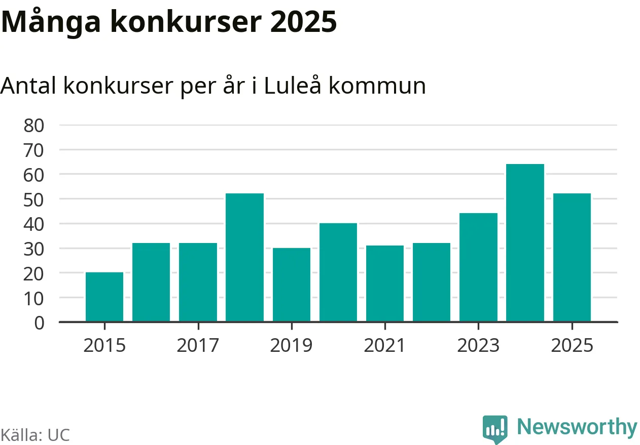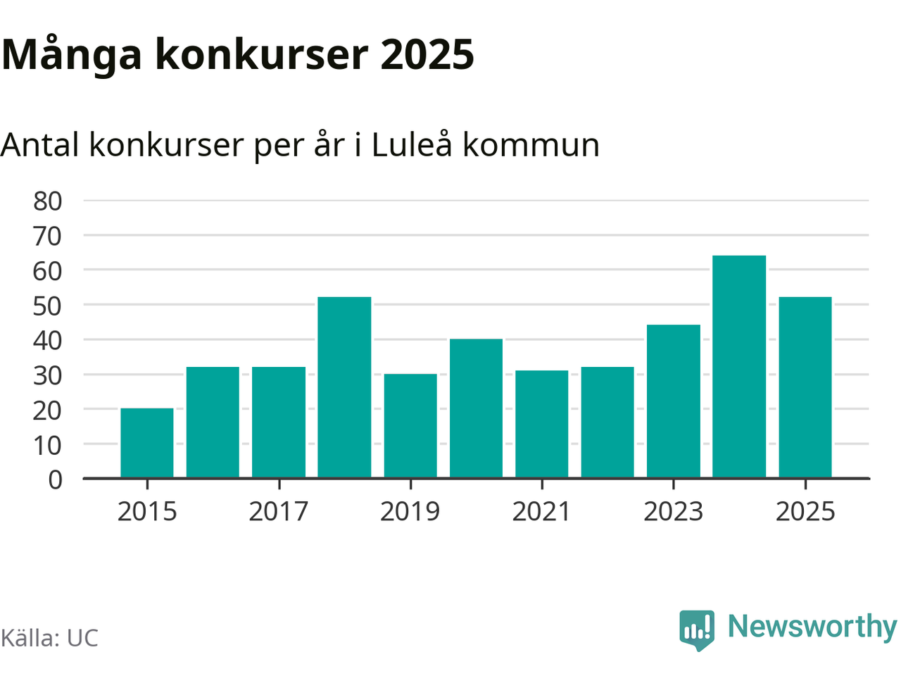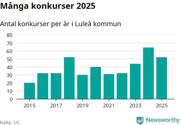 Under år 2025 gick sammanlagt 52 bolag med säte i Luleå kommun i konkurs. Det är tolv färre än året innan då 64 bolag gick i konkurs. Toppåret, sedan 2015, var just 2024 sett till antalet konkursföretag. Det visar ny statistik från UC.
