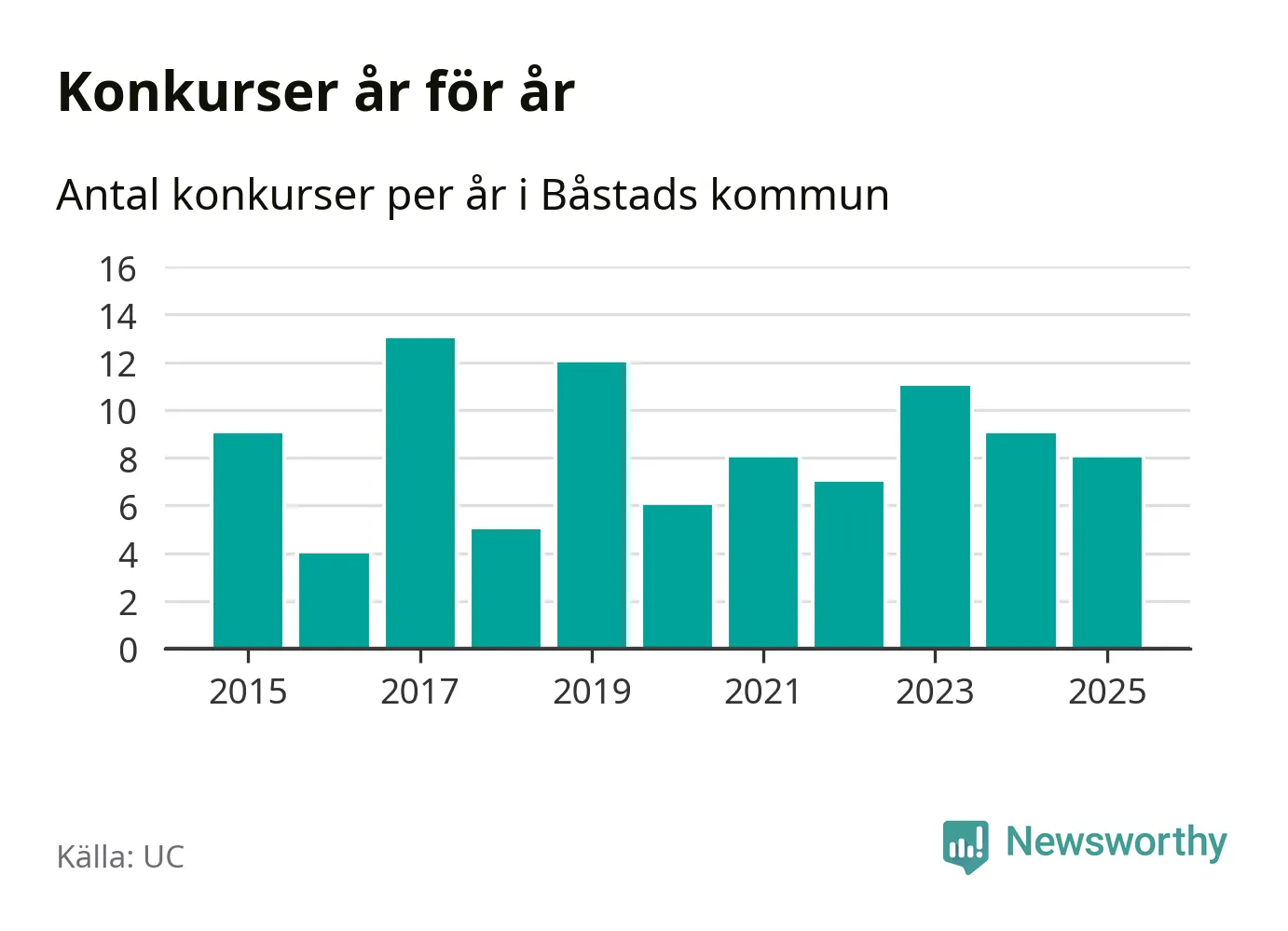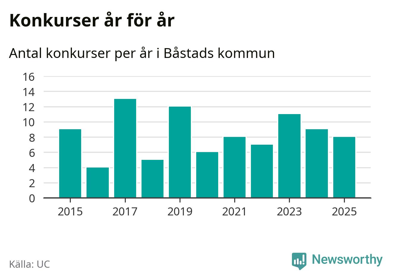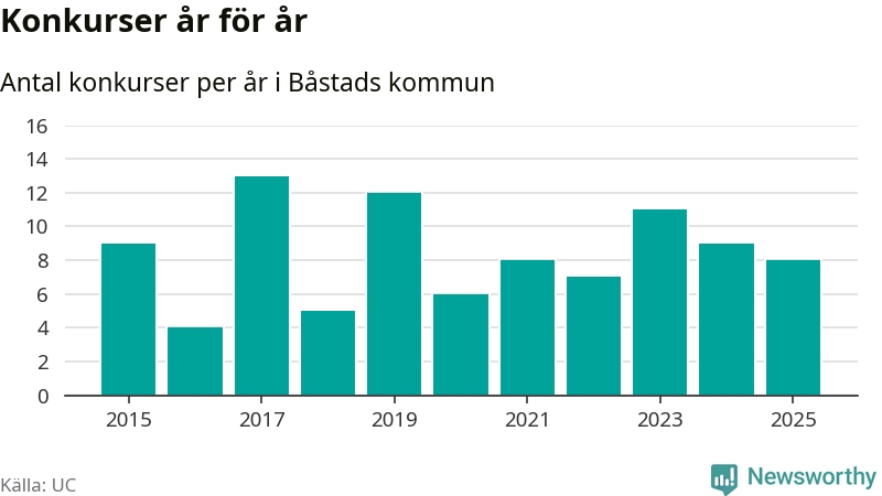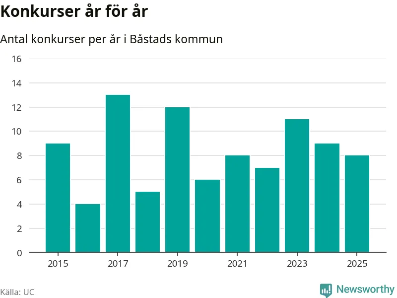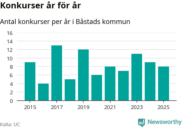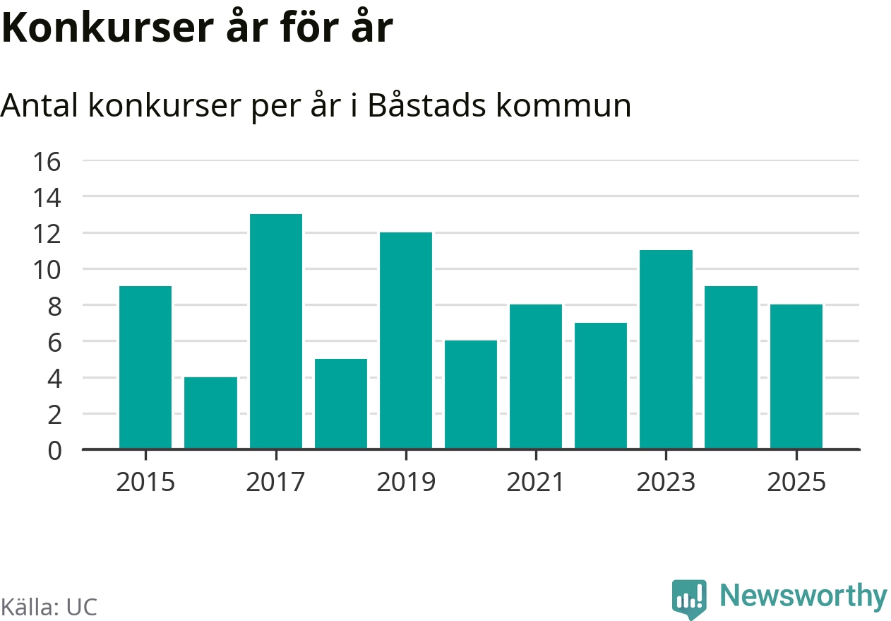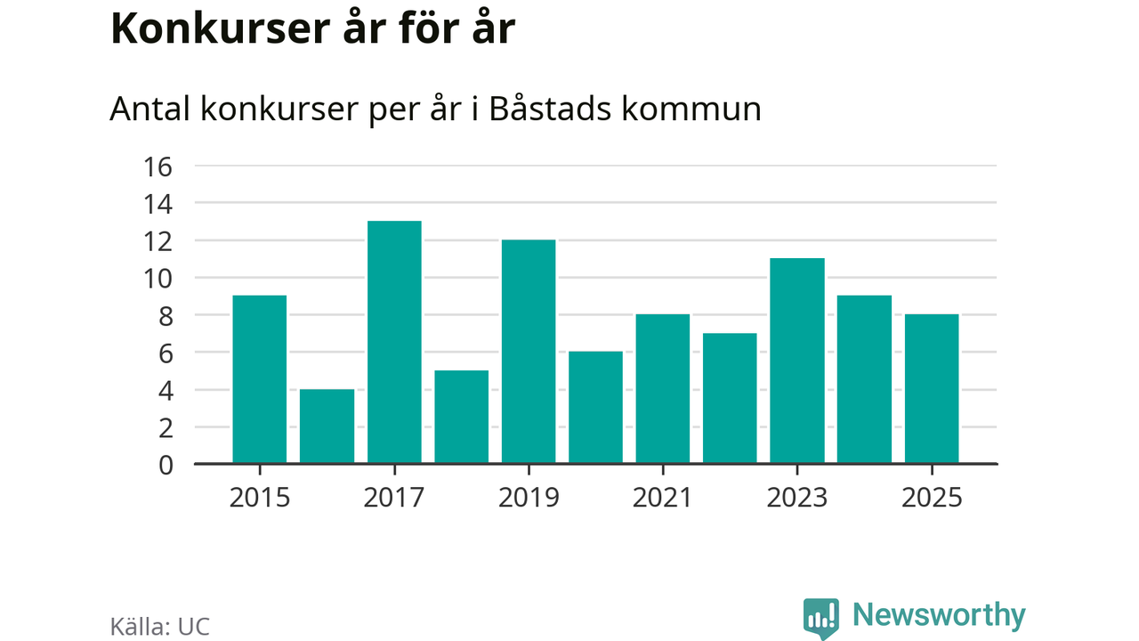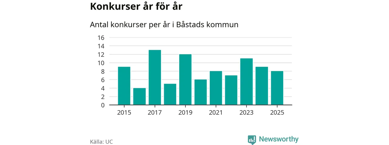 Under år 2025 gick sammanlagt åtta bolag med säte i Båstads kommun i konkurs. Det är ett färre än året innan och andra året i följd som konkurserna minskar. Toppåret, sedan 2015, var 2017 då 13 bolag gick i konkurs. Det visar ny statistik från UC.