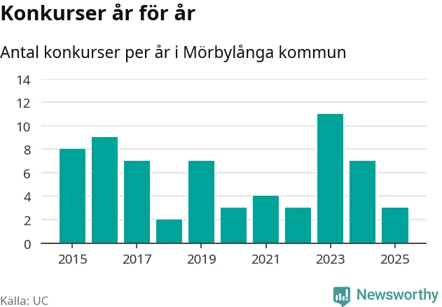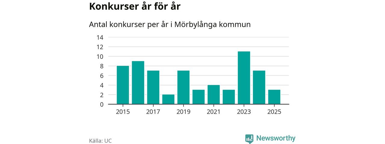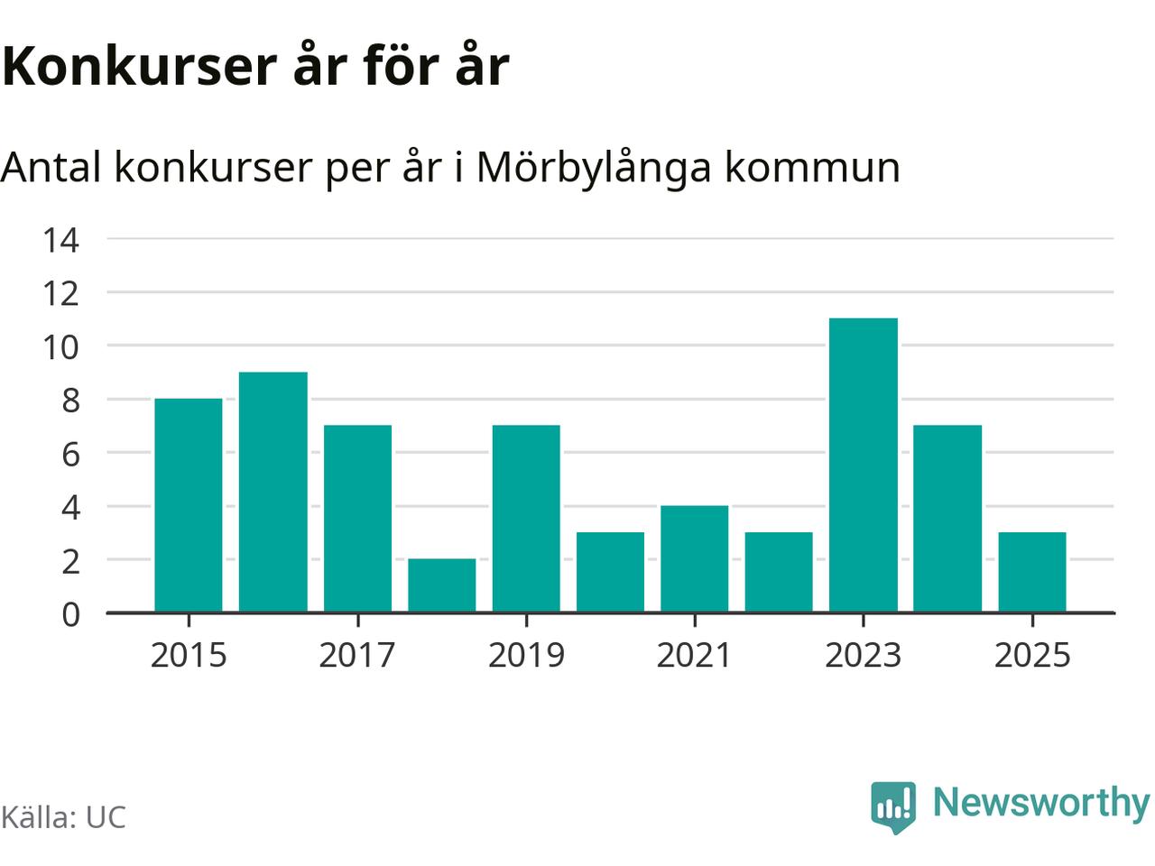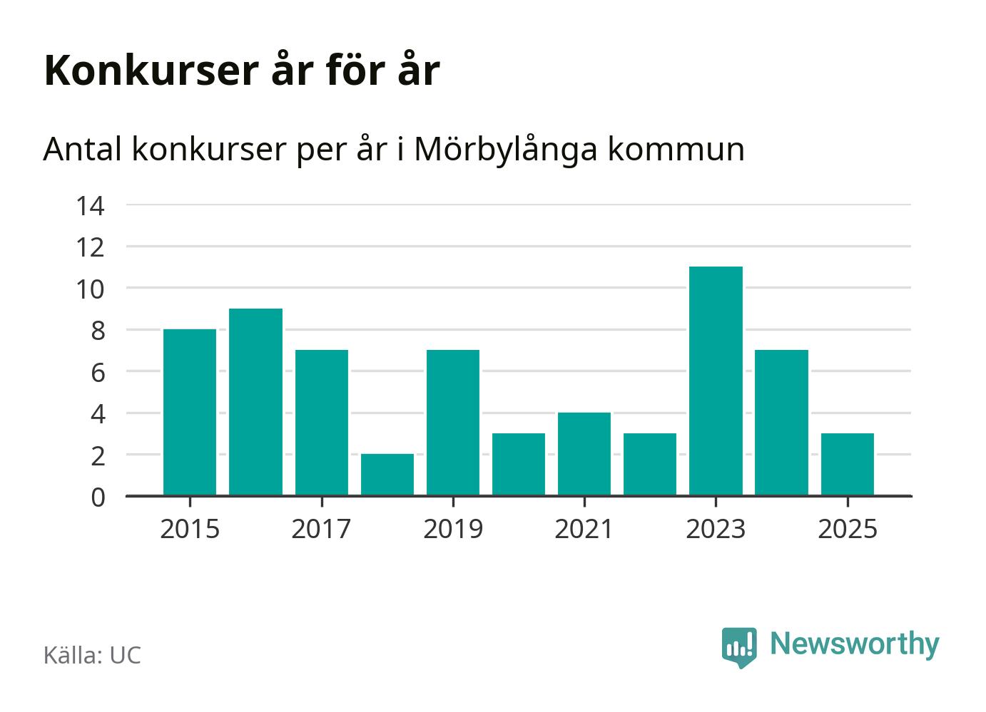 Under år 2025 gick sammanlagt tre bolag med säte i Mörbylånga kommun i konkurs. Det är fyra färre än året innan då sju bolag gick i konkurs och andra året i följd som konkurserna minskar. Toppåret, sedan 2015, var 2023 då elva bolag gick i konkurs. Det visar ny statistik från UC.