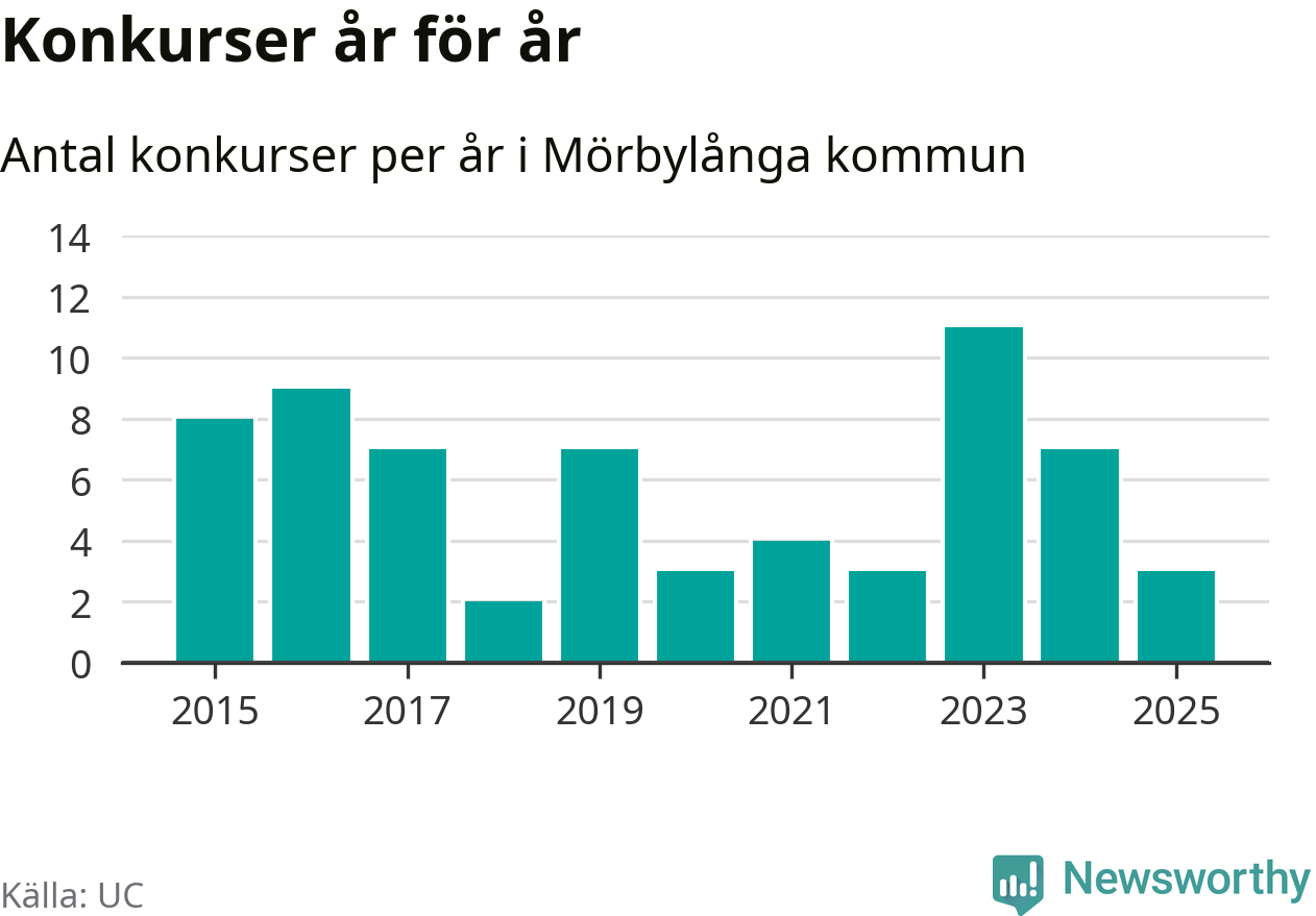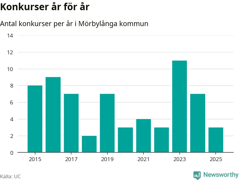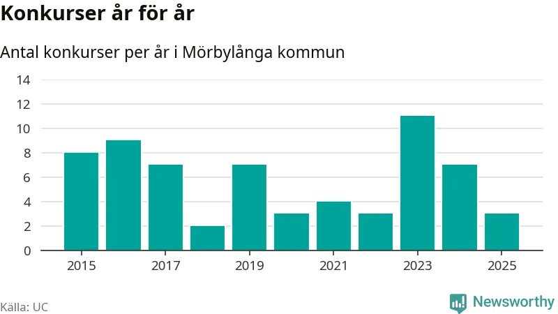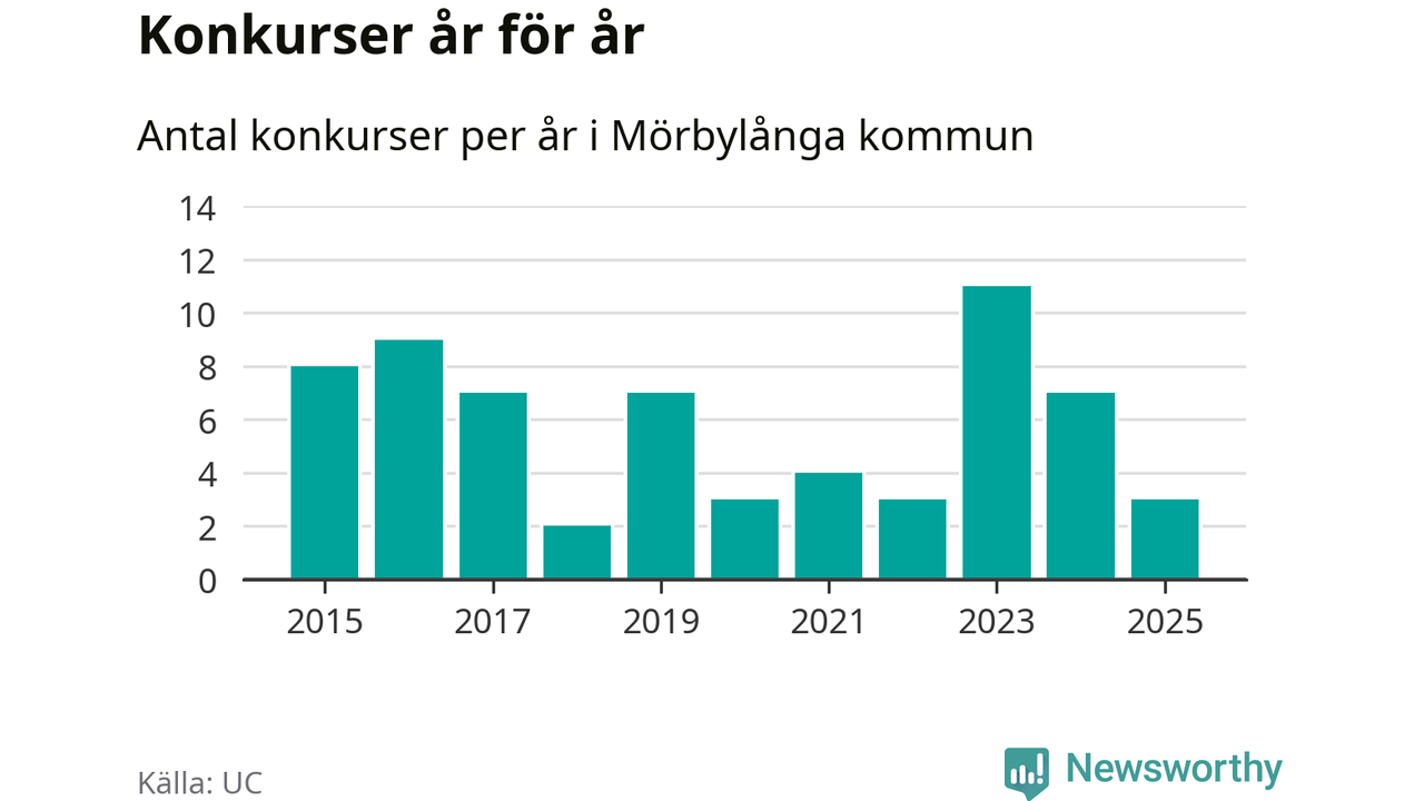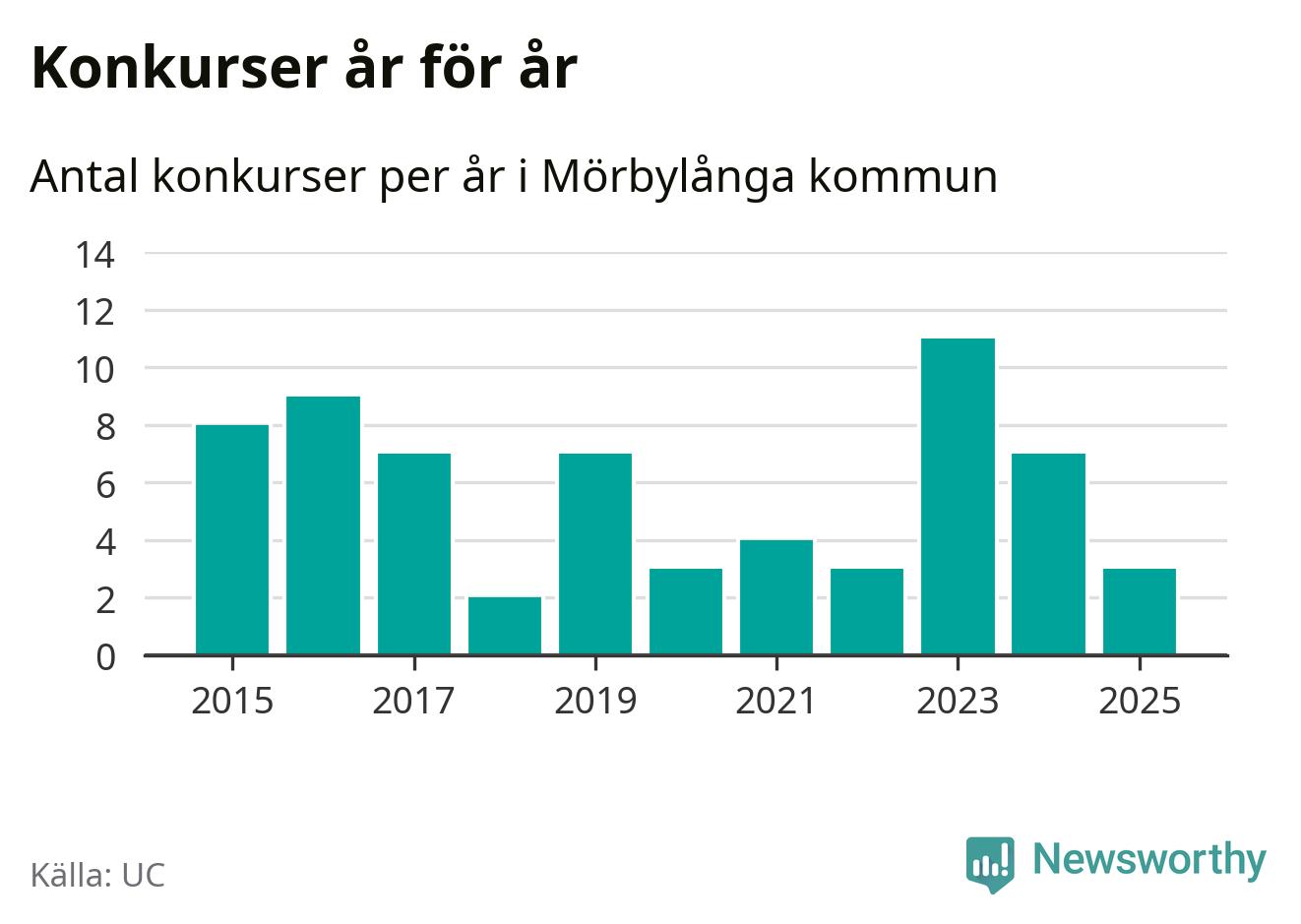 Under år 2025 gick sammanlagt tre bolag med säte i Mörbylånga kommun i konkurs. Det är fyra färre än året innan då sju bolag gick i konkurs och andra året i följd som konkurserna minskar. Toppåret, sedan 2015, var 2023 då elva bolag gick i konkurs. Det visar ny statistik från UC.
