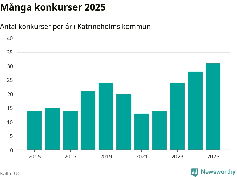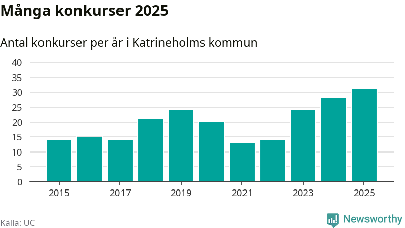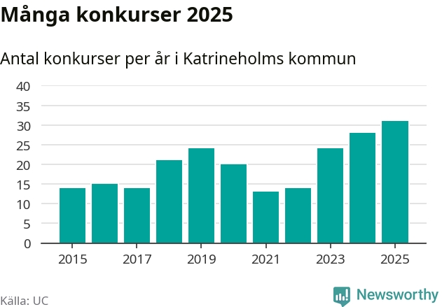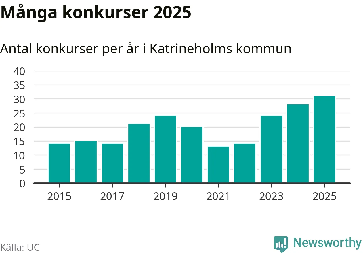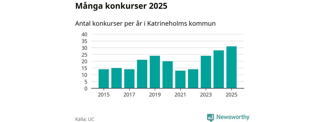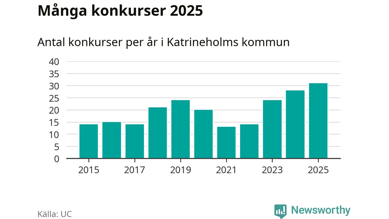 Under år 2025 gick sammanlagt 31 bolag med säte i Katrineholms kommun i konkurs. Det är det högsta antalet sedan åtminstone år 2015. Det visar ny statistik från UC.