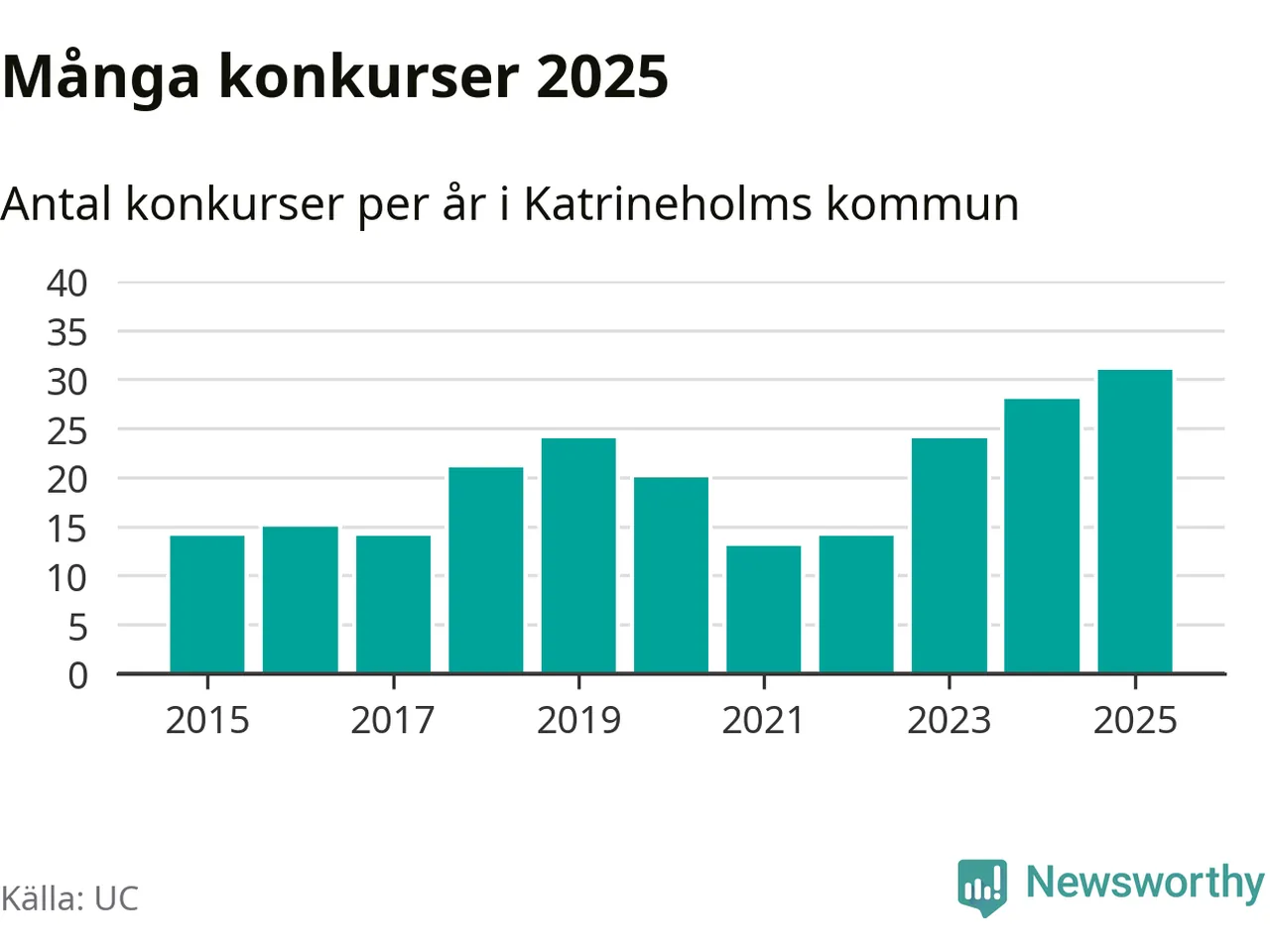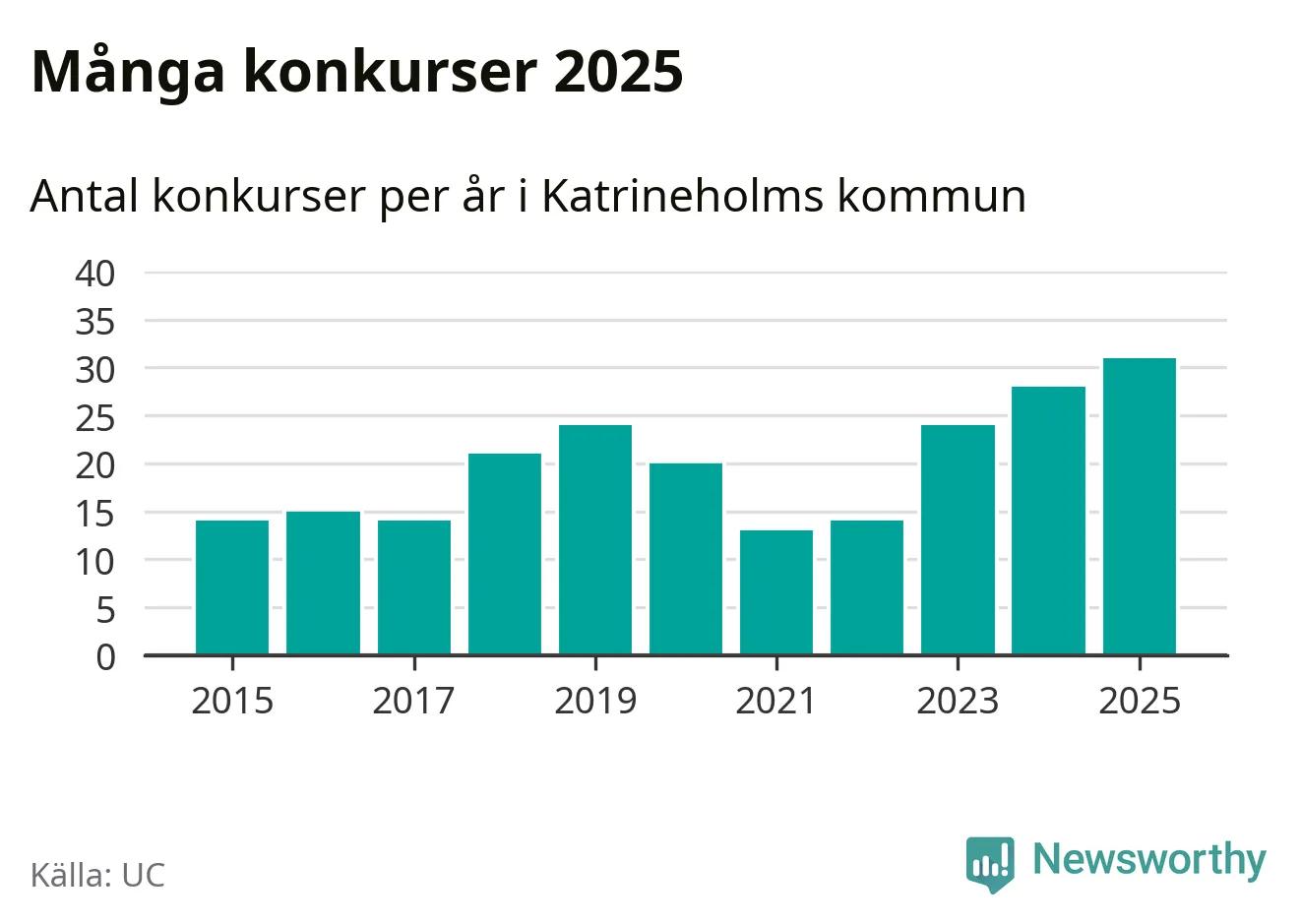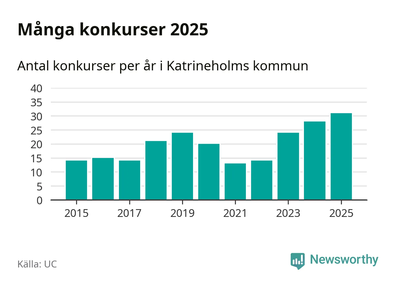 Under år 2025 gick sammanlagt 31 bolag med säte i Katrineholms kommun i konkurs. Det är det högsta antalet sedan åtminstone år 2015. Det visar ny statistik från UC.