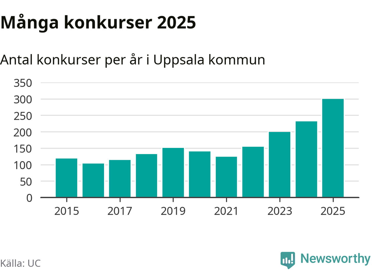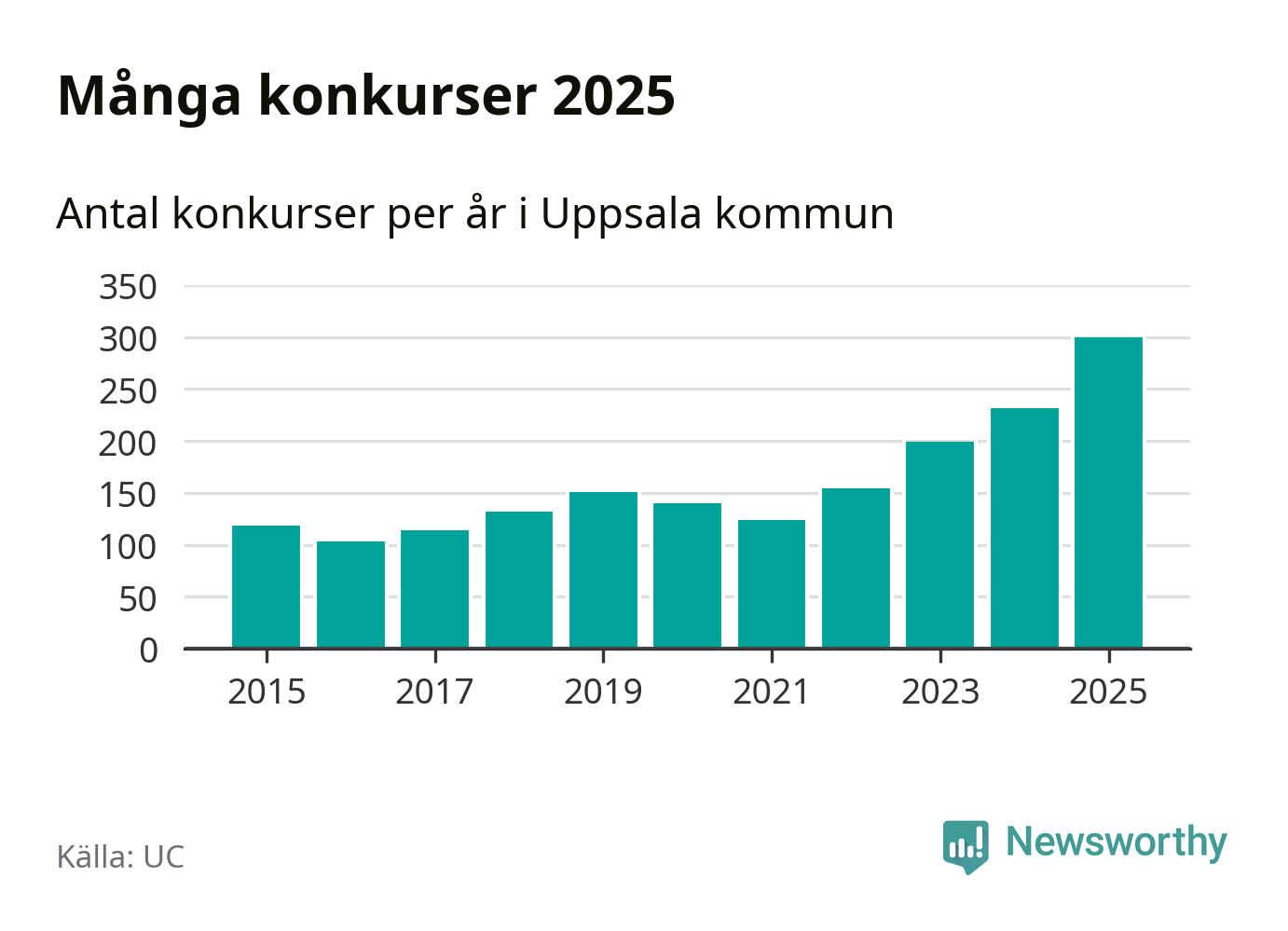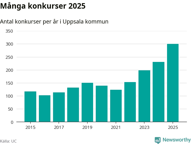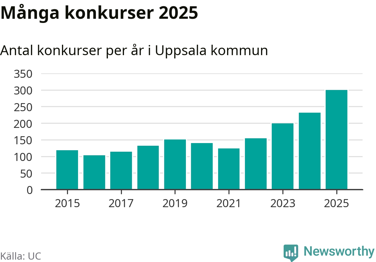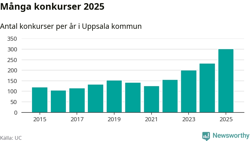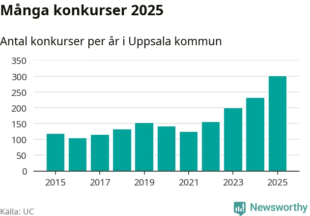Under år 2025 gick sammanlagt 300 bolag med säte i Uppsala kommun i konkurs. Det är det högsta antalet sedan åtminstone år 2015. Det visar ny statistik från UC.