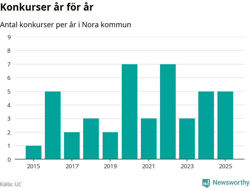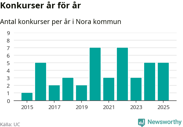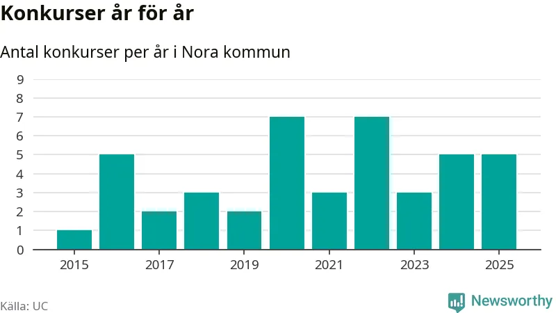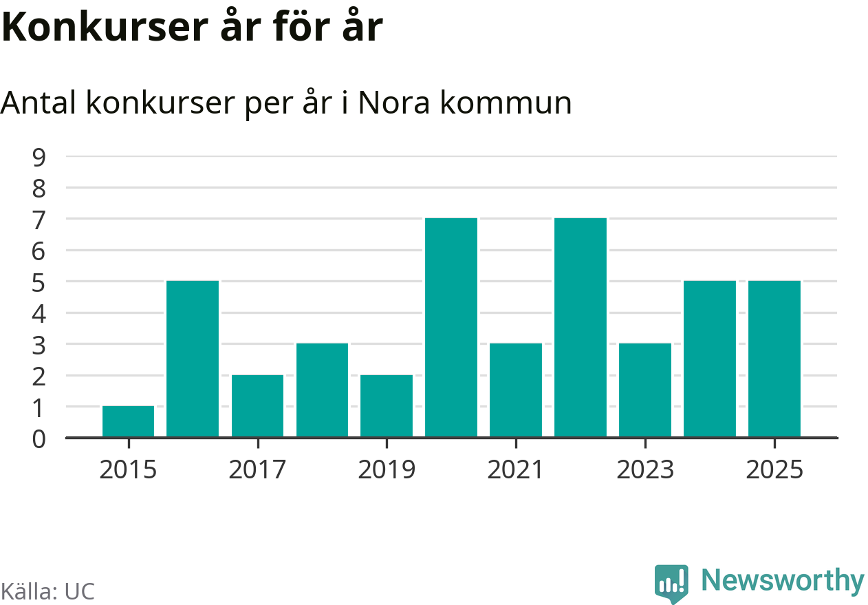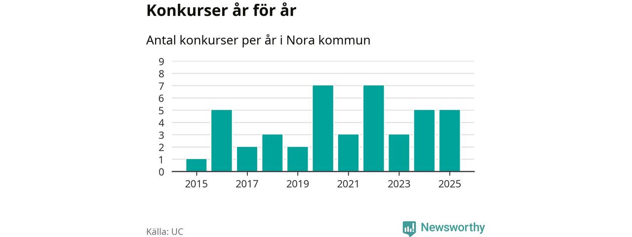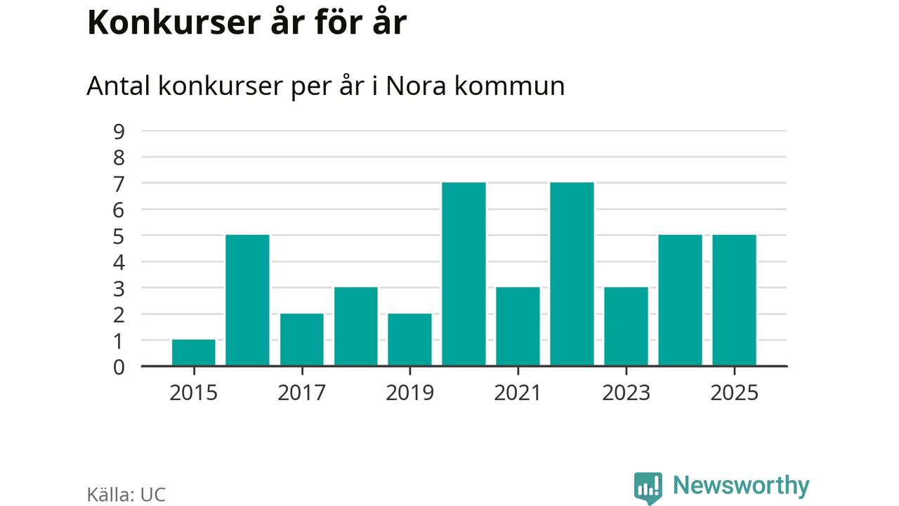 Under år 2025 gick sammanlagt fem bolag med säte i Nora kommun i konkurs. Det är lika många som året innan. Toppåren, sedan 2015, var 2020 och 2022 då sju bolag gick i konkurs. Det visar ny statistik från UC.