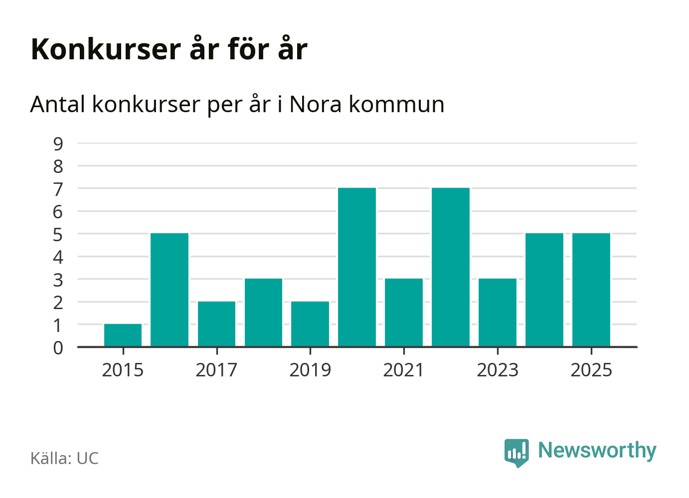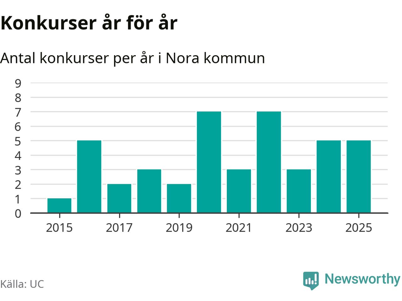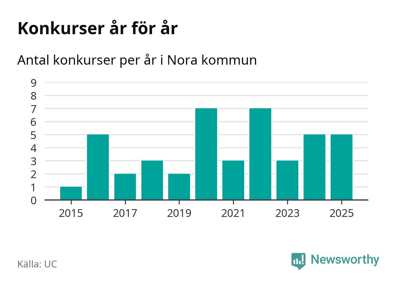 Under år 2025 gick sammanlagt fem bolag med säte i Nora kommun i konkurs. Det är lika många som året innan. Toppåren, sedan 2015, var 2020 och 2022 då sju bolag gick i konkurs. Det visar ny statistik från UC.