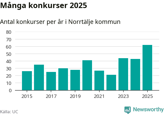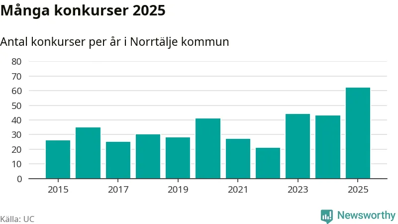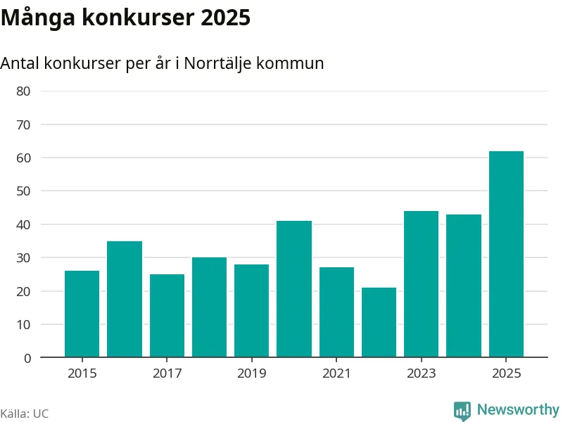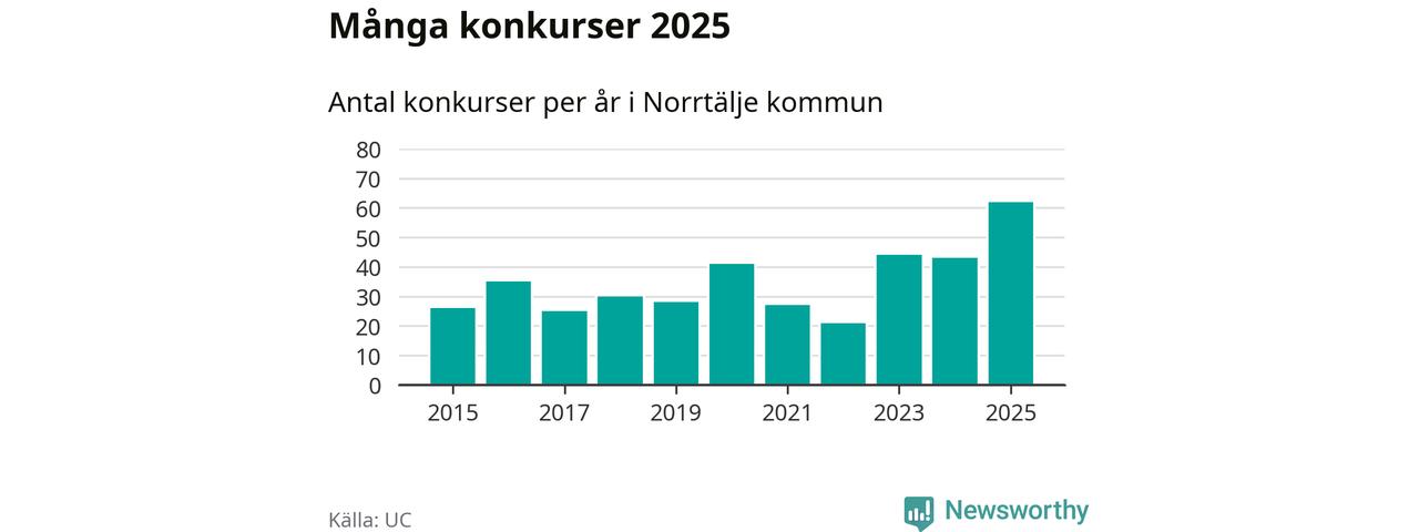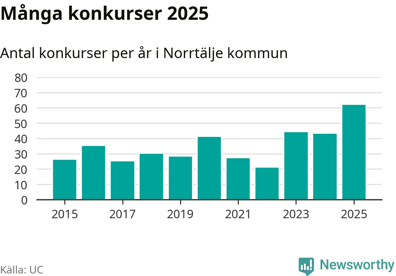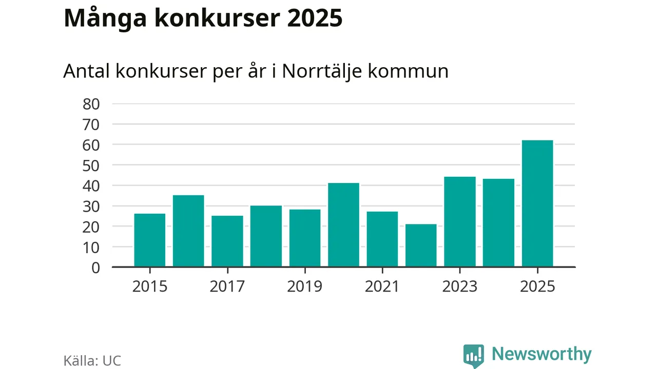 Under år 2025 gick sammanlagt 62 bolag med säte i Norrtälje kommun i konkurs. Det är det högsta antalet sedan åtminstone år 2015. Det visar ny statistik från UC.